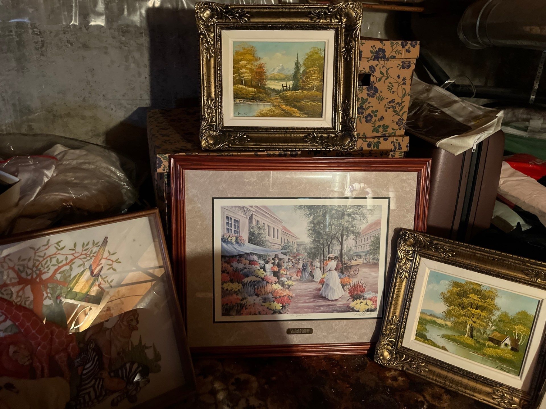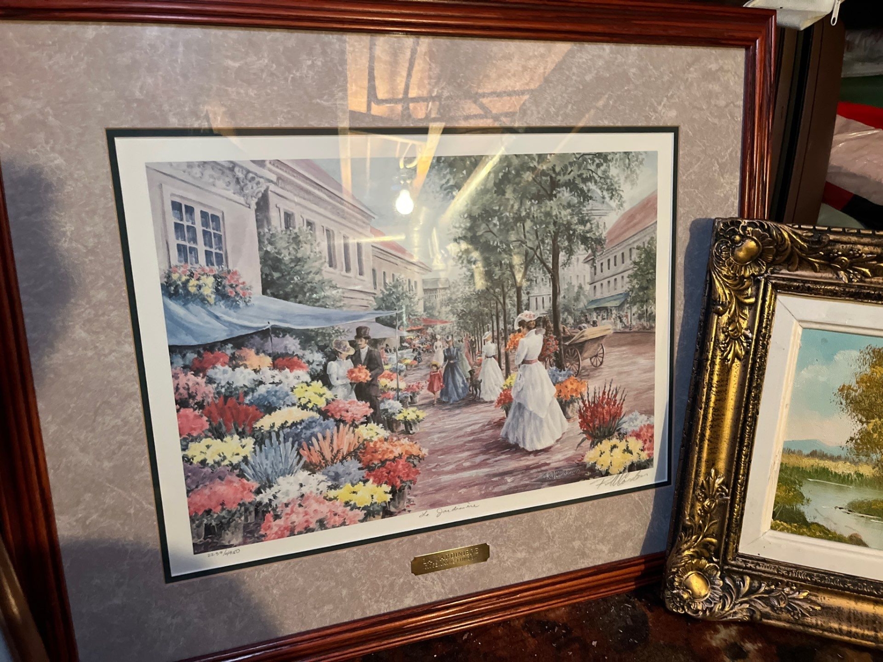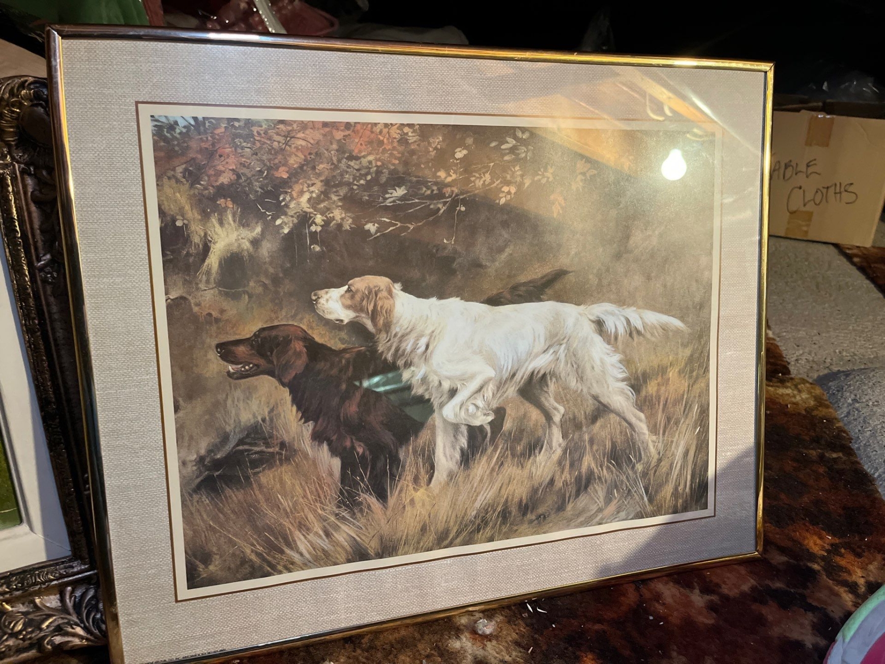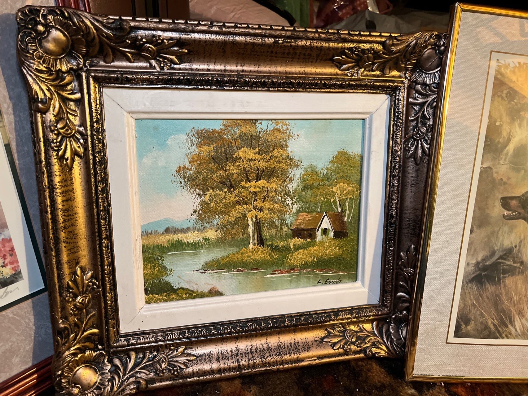 Collection of Art including 3D embroidery floral art print and two small original paintings beautiful ornate frames.. and print of two dogs