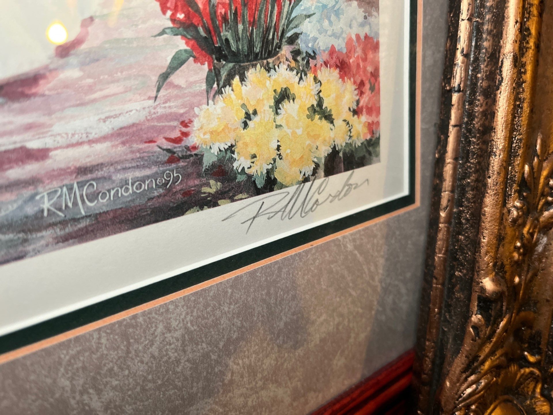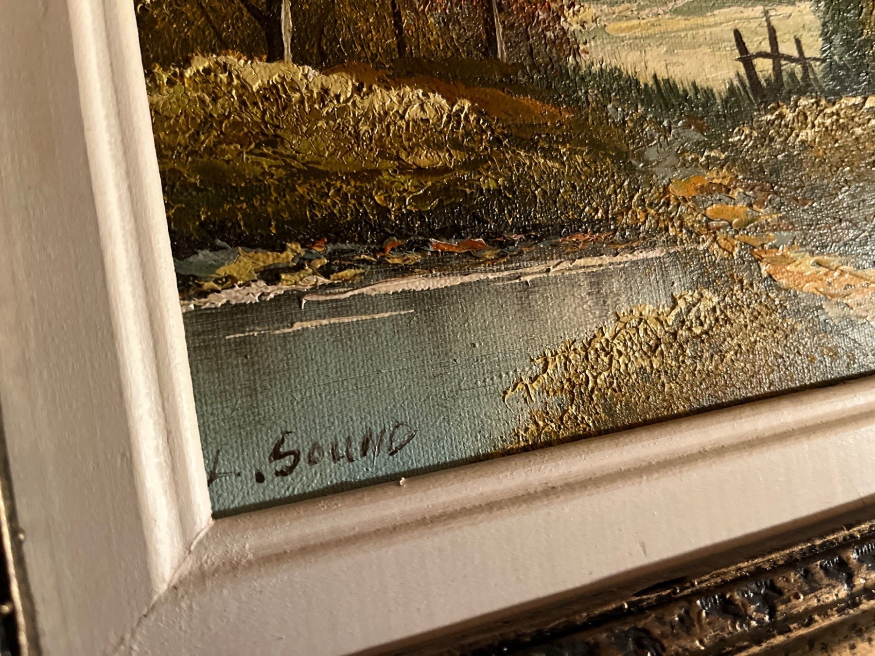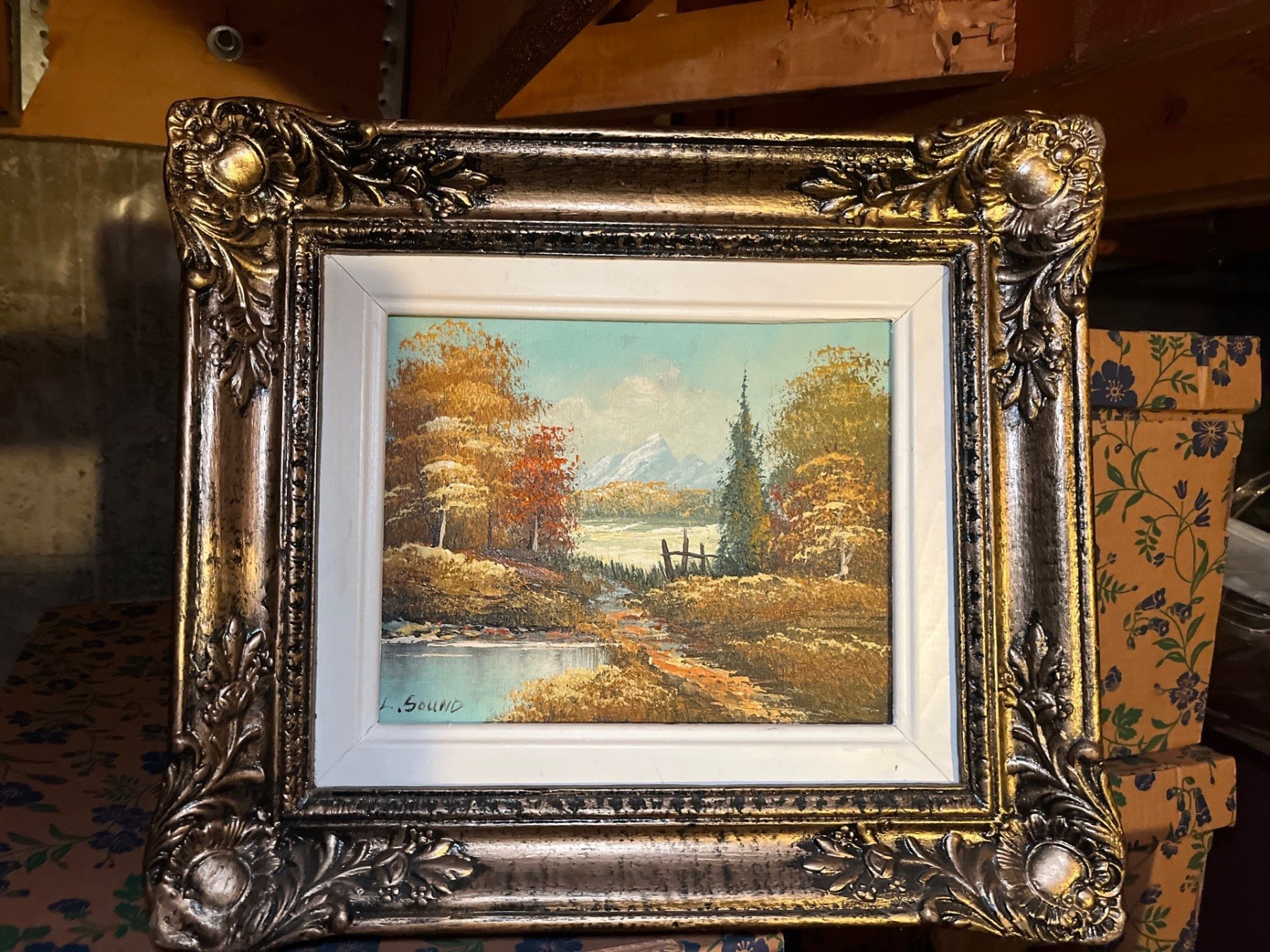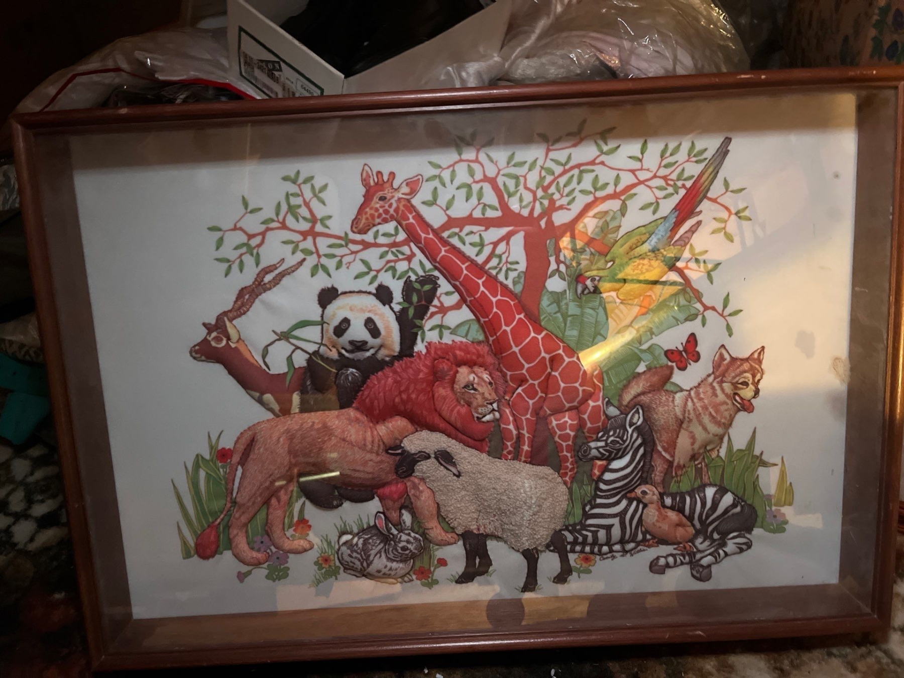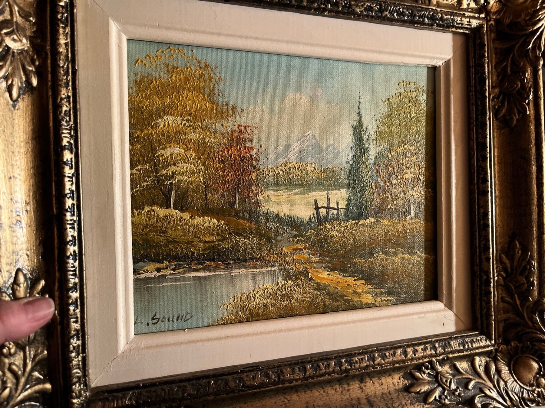 Collection of Art including 3D embroidery floral art print and two small original paintings beautiful ornate frames.. and print of two dogs