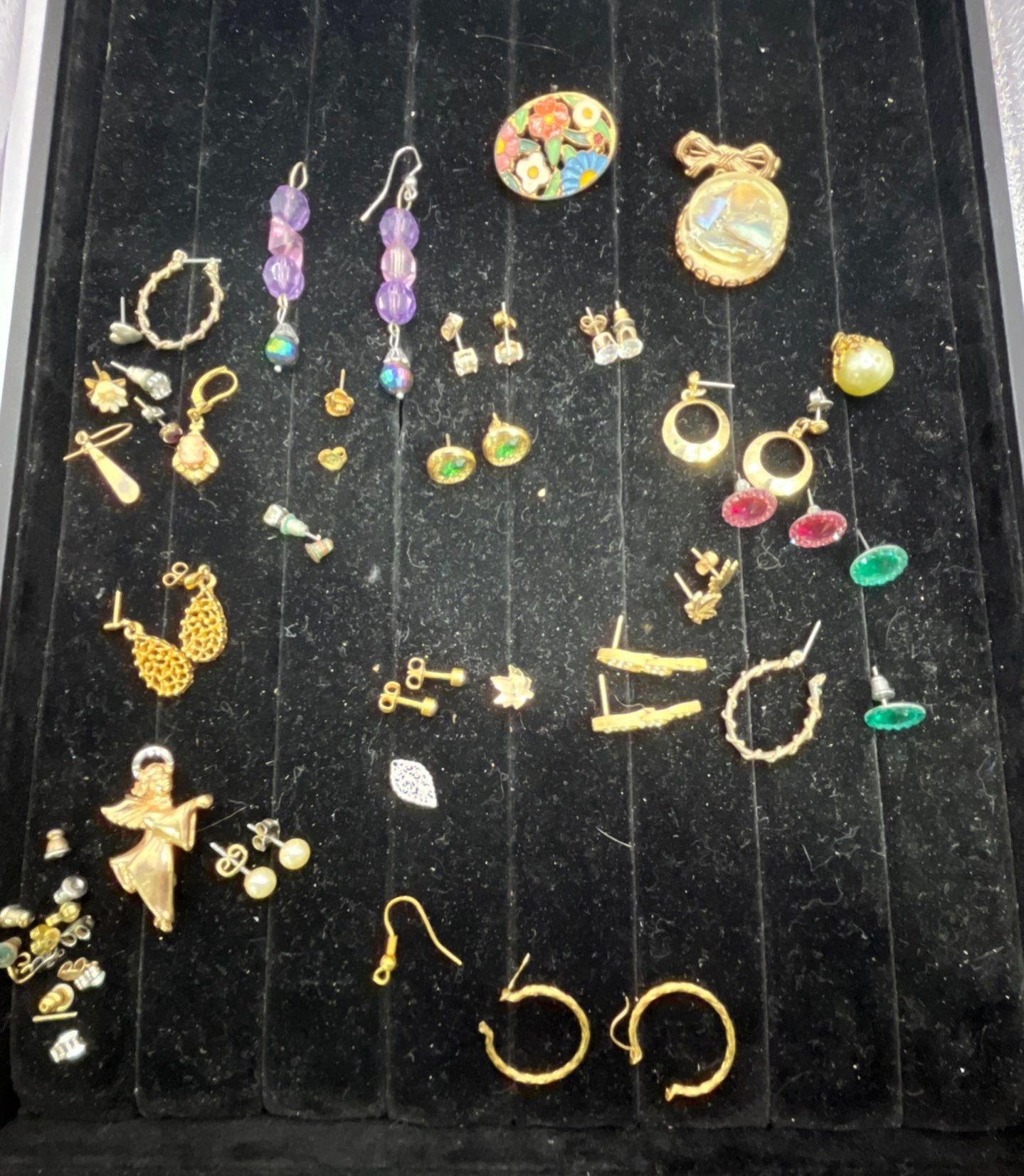 Collection of Brooches, pins, some silver and one gold earring