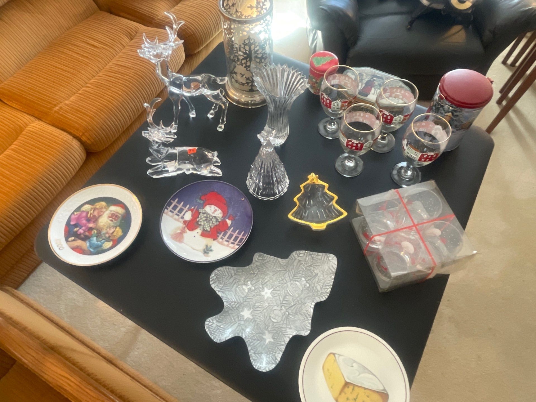Collection of Christmas Glassware, and Decor. Chalices, Candle Holder, Resin Reindeer, Vase, Serving Tray, Plates and more.