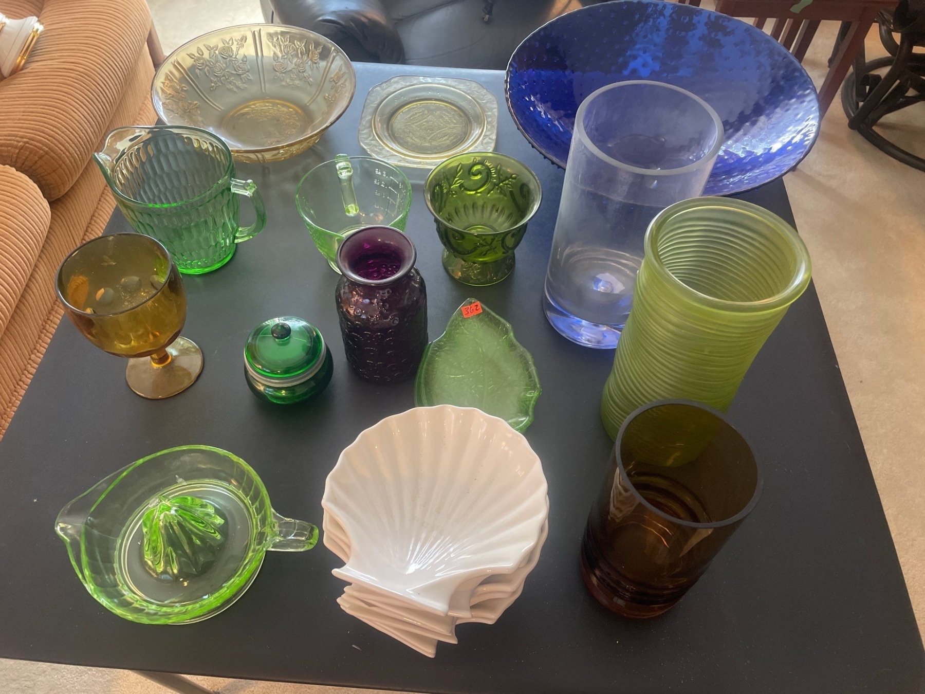 Collection of Coloured Glassware. Uranium?, Dishes, Jugs, Vases, Dishes and more.