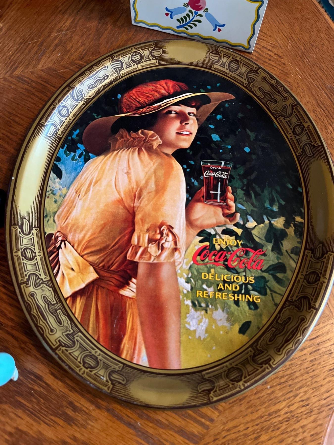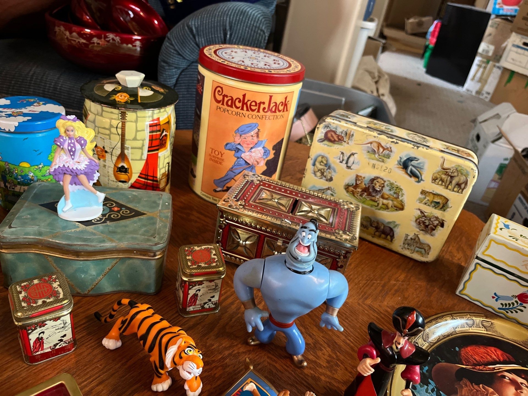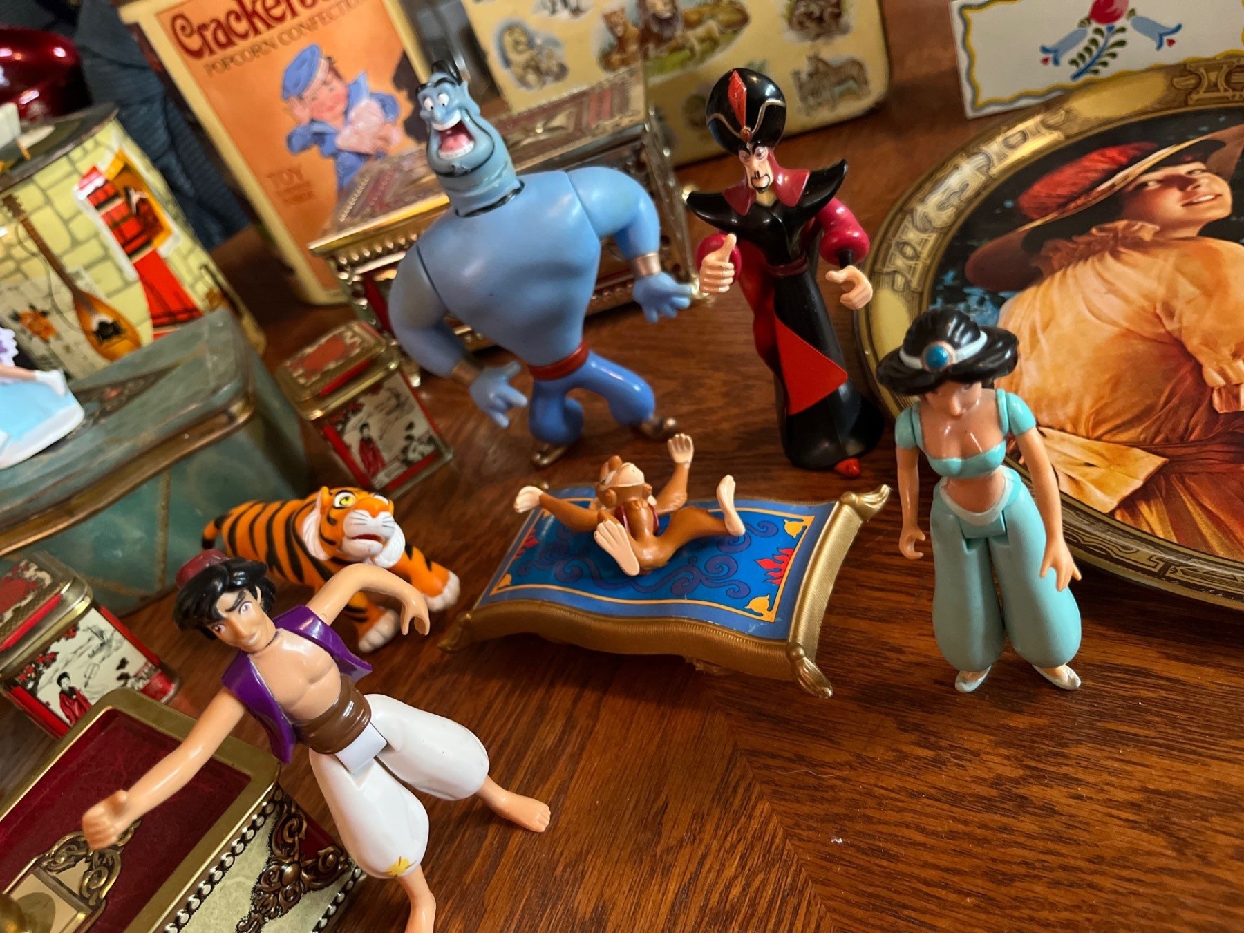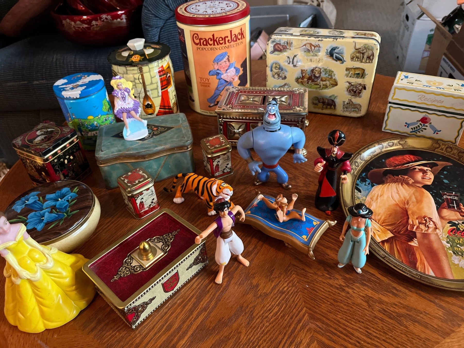 Collection of Disney figures from Aladdin Coca-Cola, serving tray and a selection of vintage tins