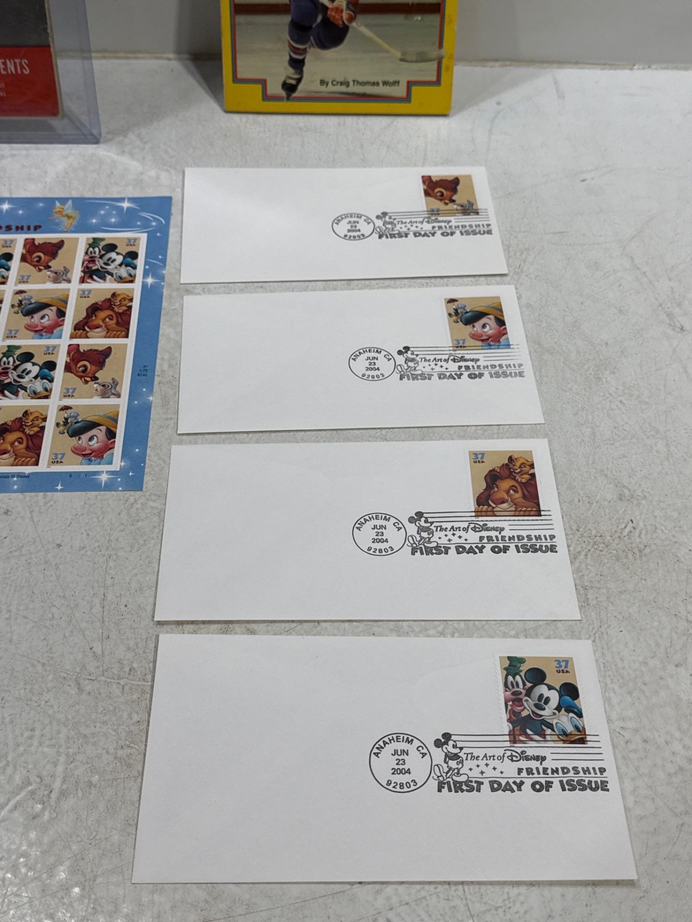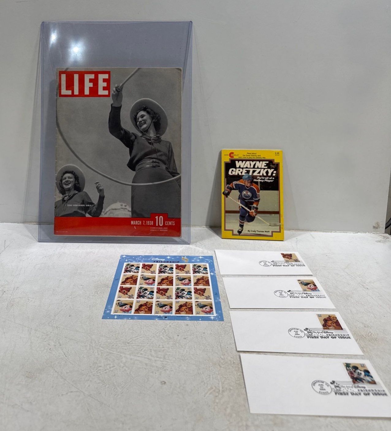 Collection of Life Magazine, Wayne Gretzsky Book, and Disney Friendship Stamps