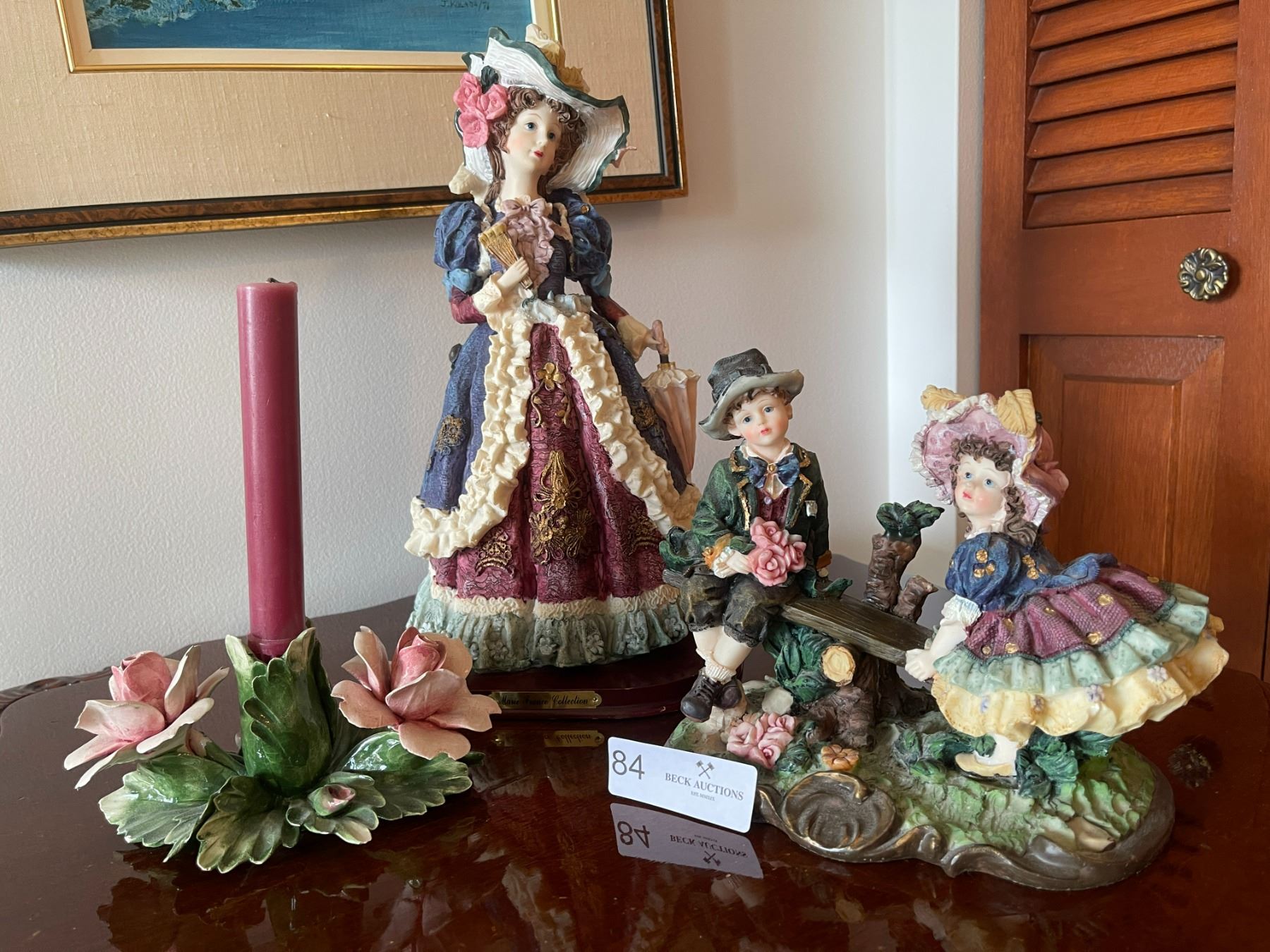 Collection of Plaster Figurines and a Capademonte Candle Stick