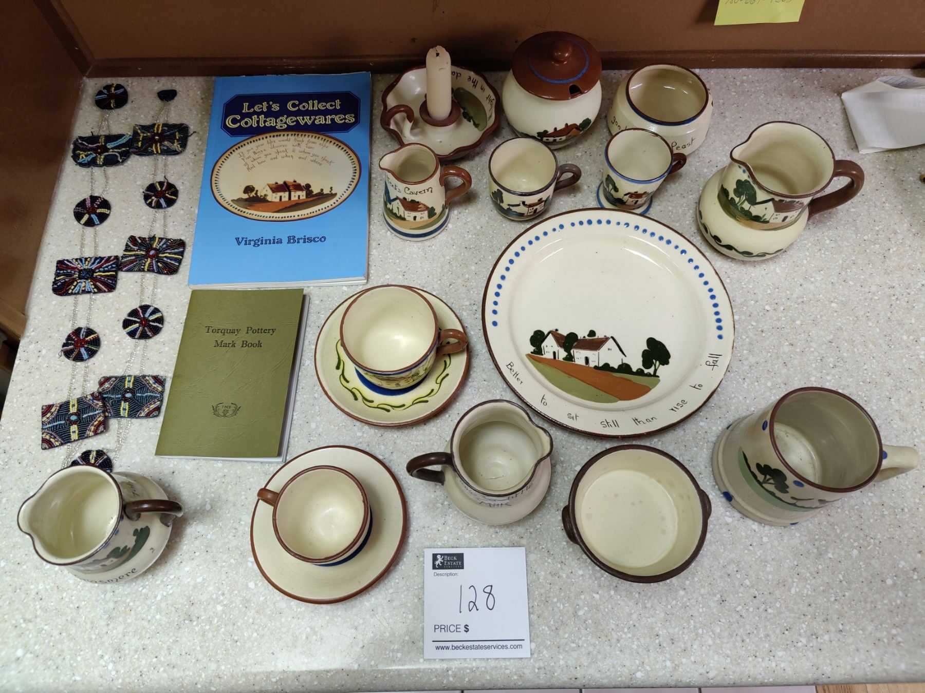 Collection of various Torquay cottageware pieces including mugs, saucers, candle holder, creamer jugs and more. Also includes collection books and Native American style beadwork jewelry.