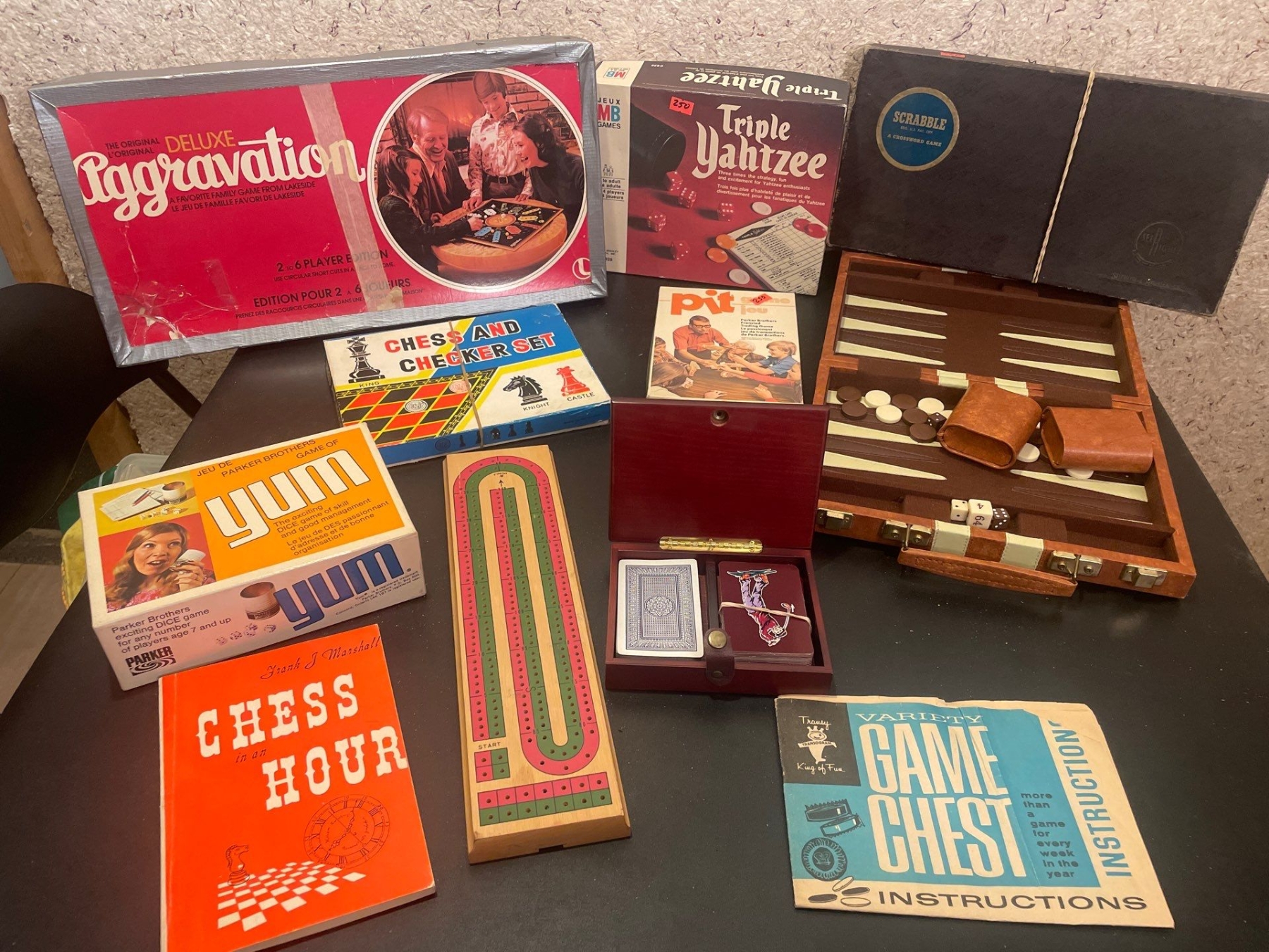 Collection of Vintage Games, Aggravation, Triple Yahtzee, Scrabble, Backgammon, Pit, Yum, Crib, Chess and Checkers