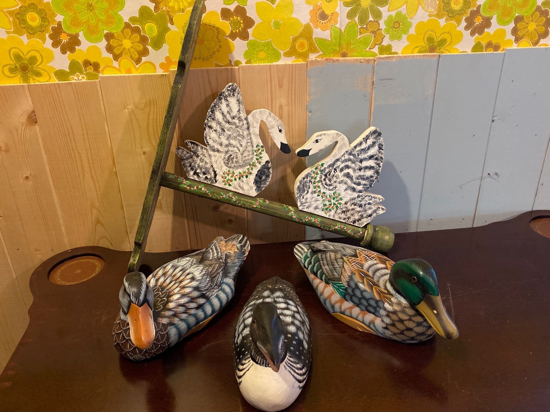 Collection of Wooden Duck Carvings and Swan Sign Hanger