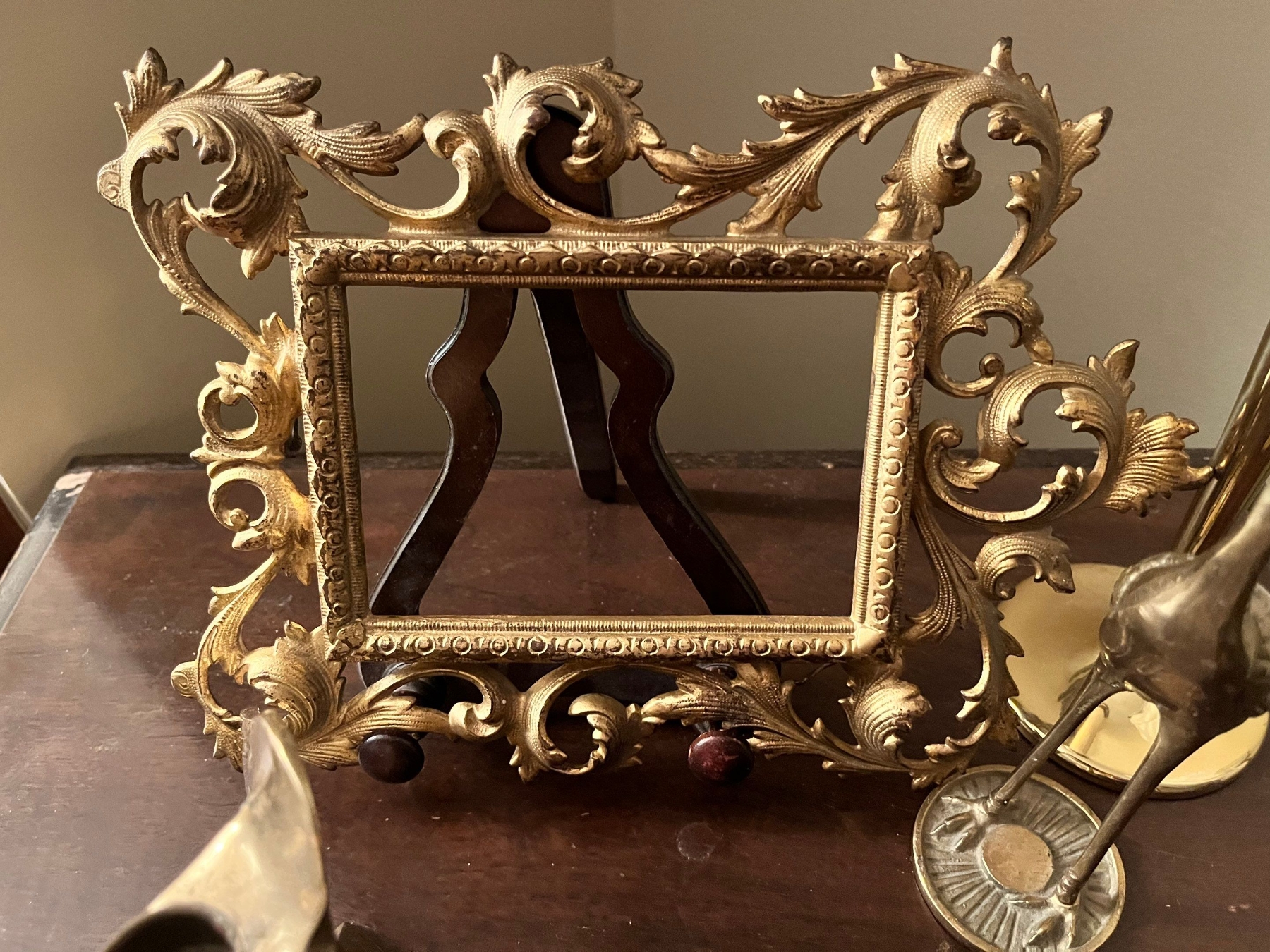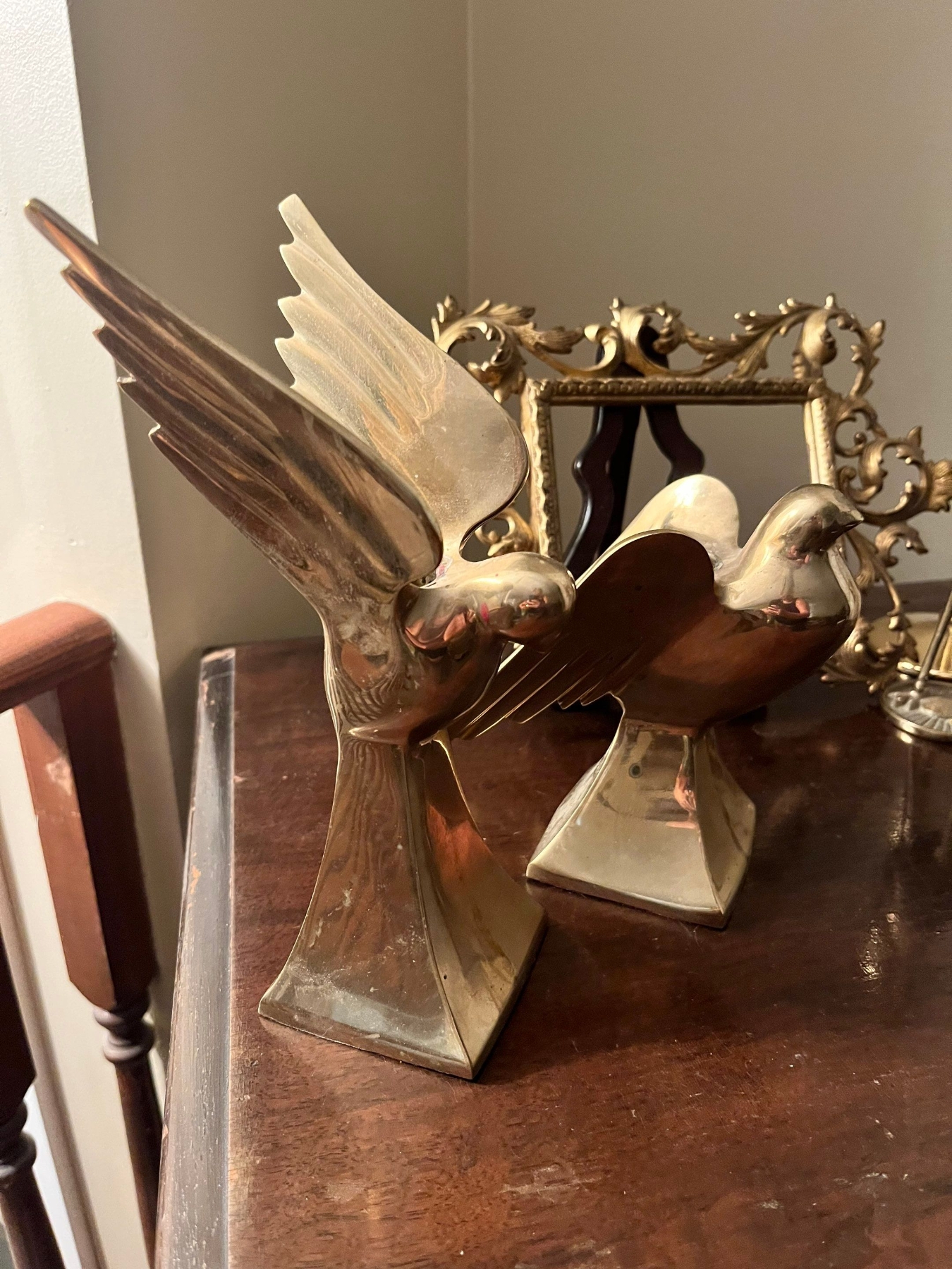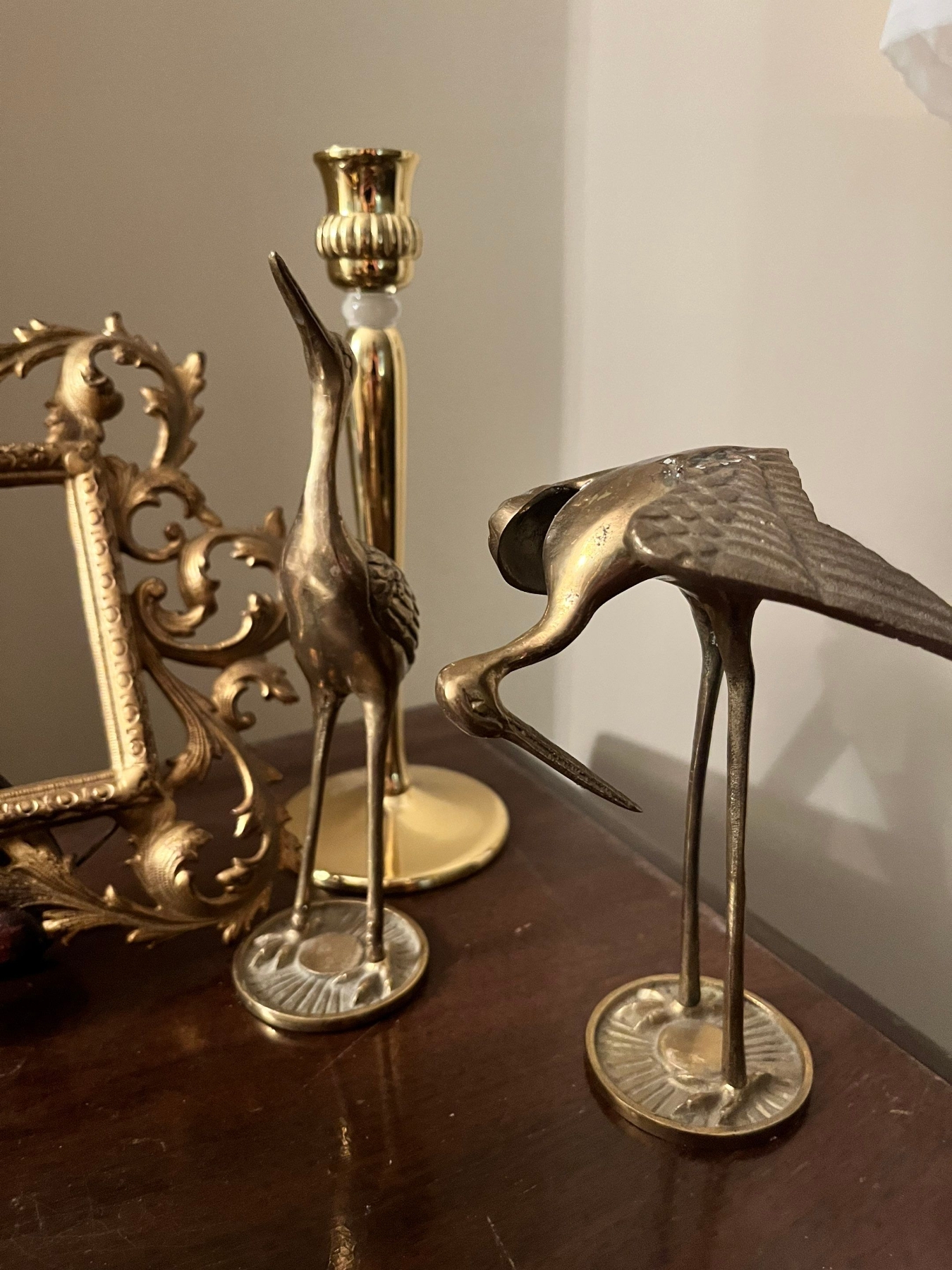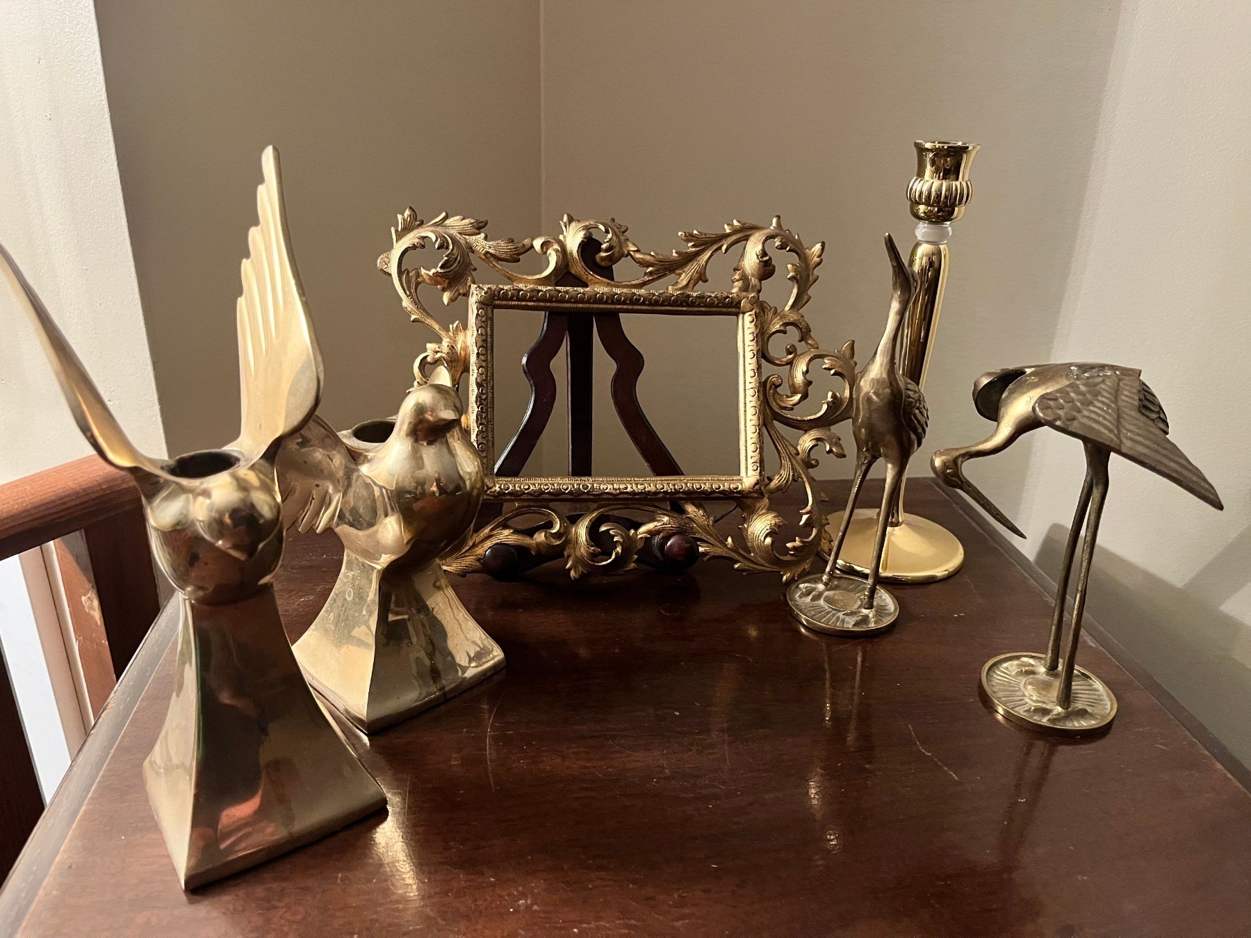 Collection of brass candle holders book end bird sculptures, and a brass picture frame