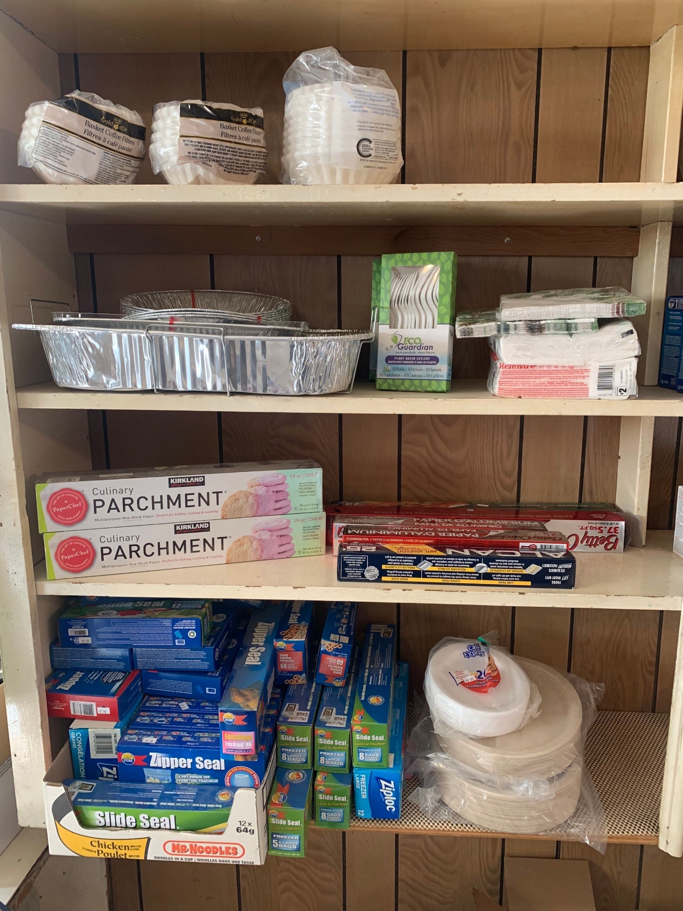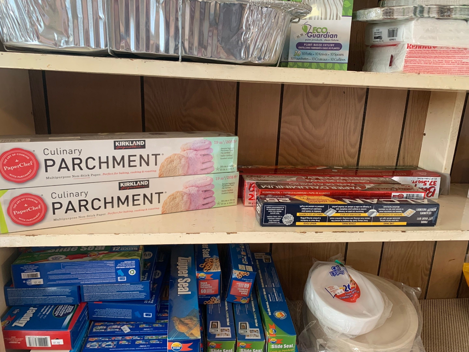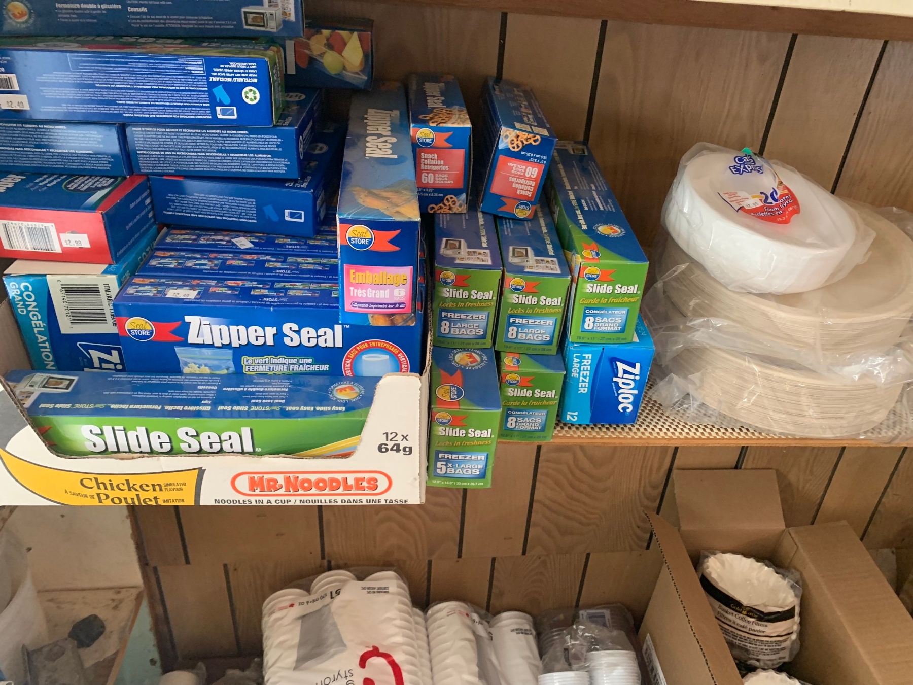 Collection of household essentials ziplock bags, plastic utensils, tinfoil, coffee filters much more