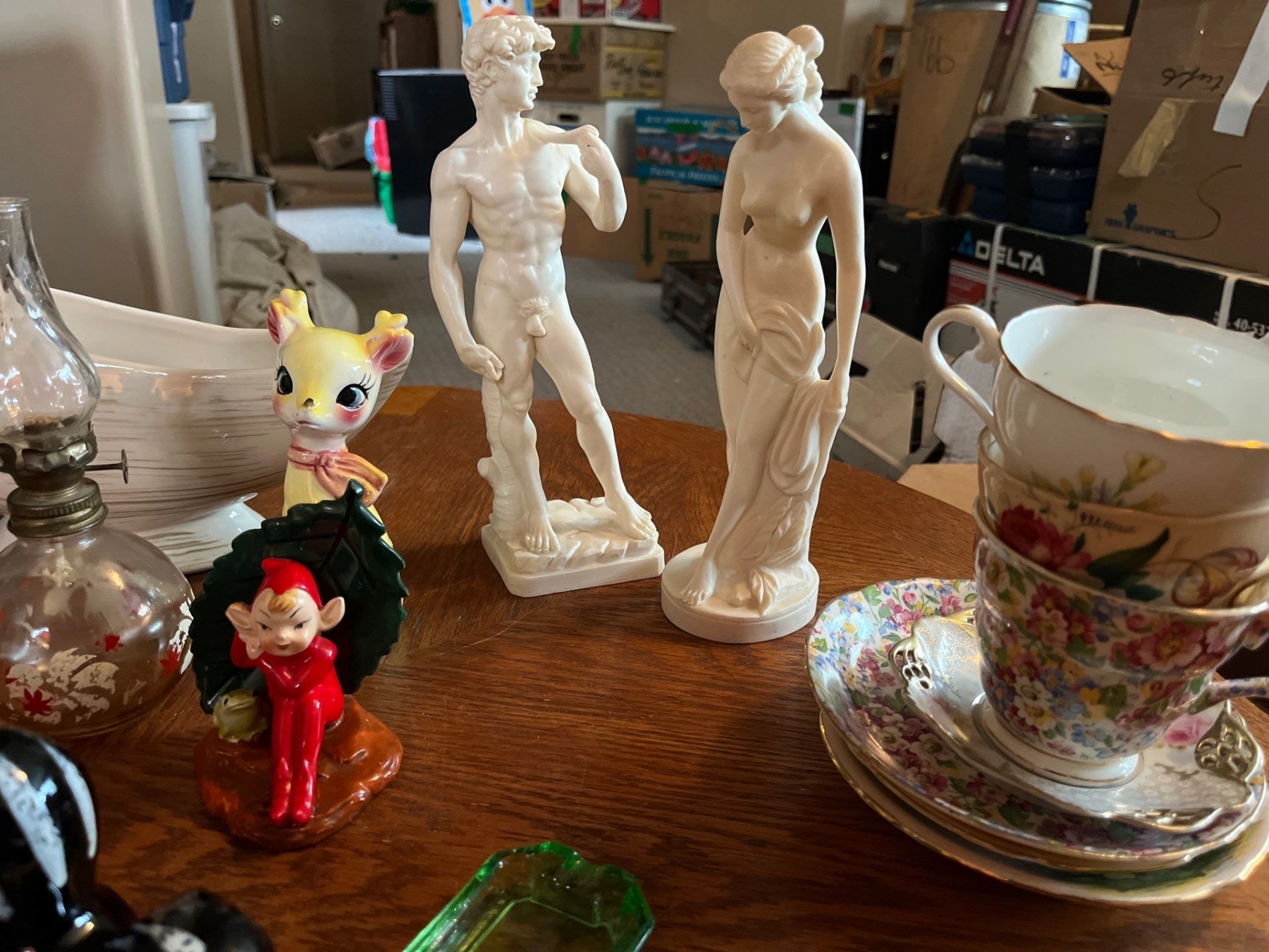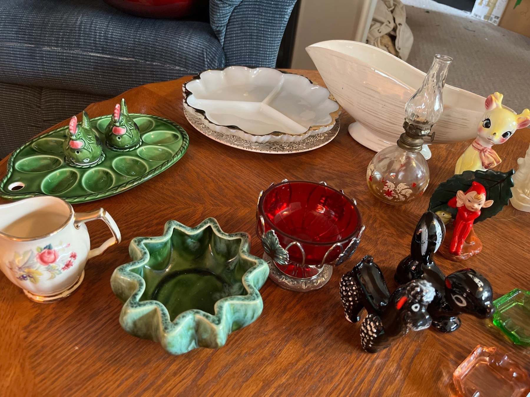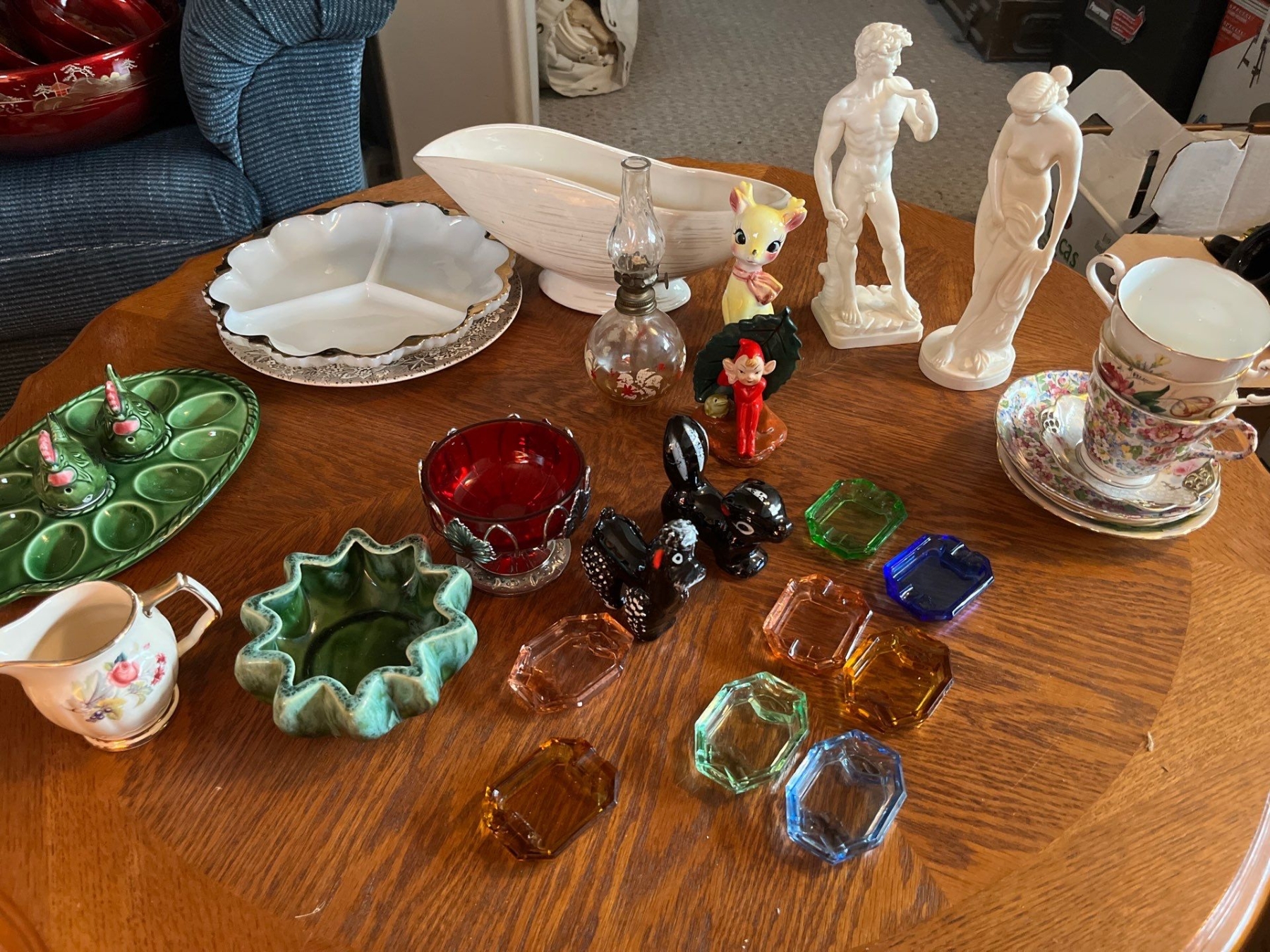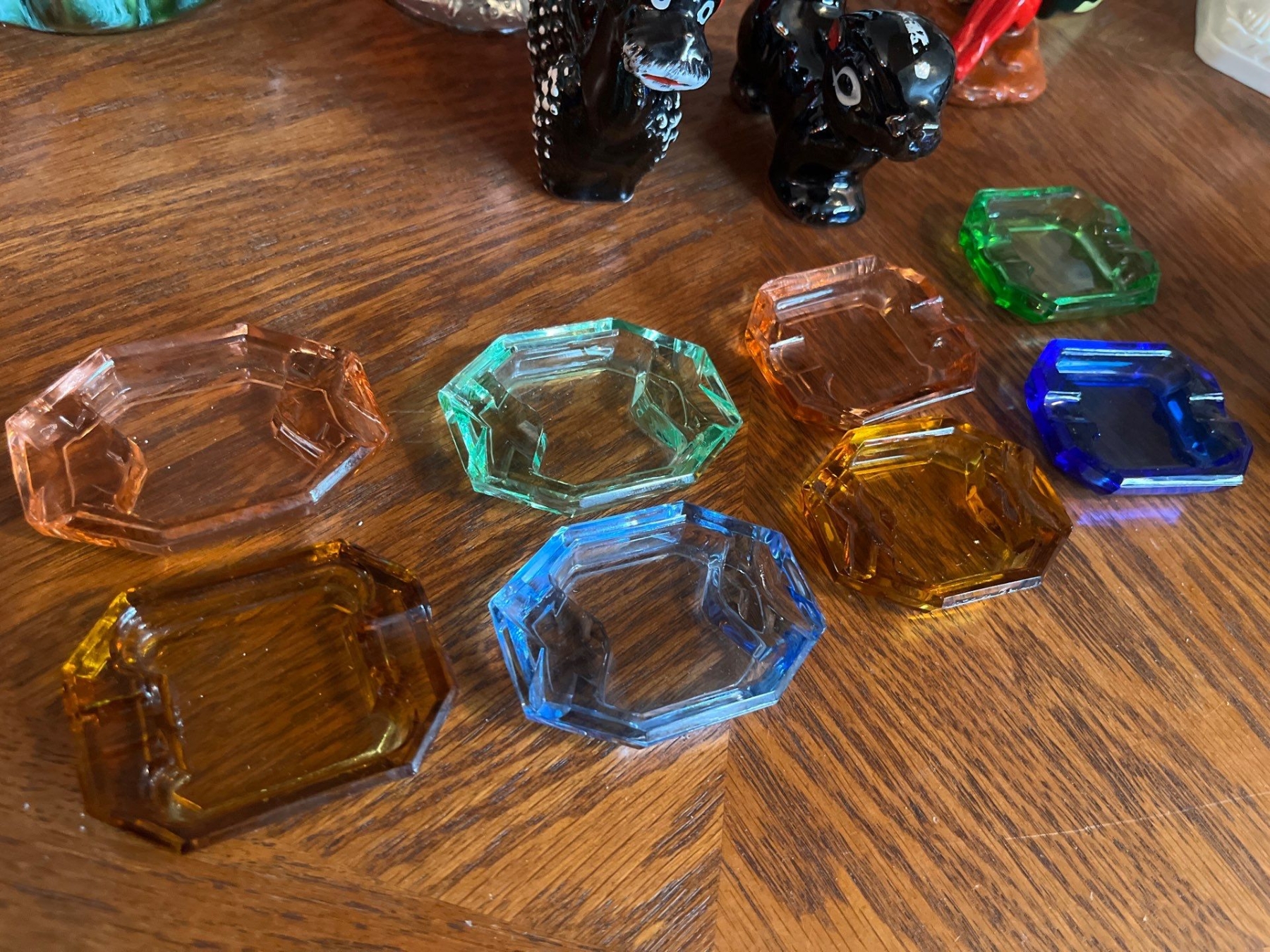 Collection of individual coloured ashtrays and a number of other ceramic items like naked people and a devilled egg dish