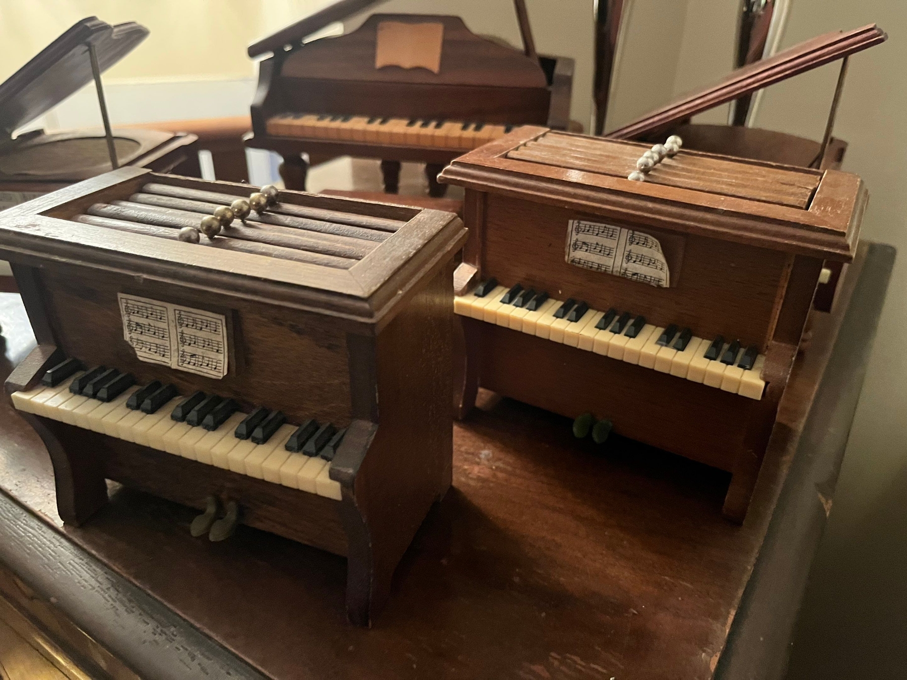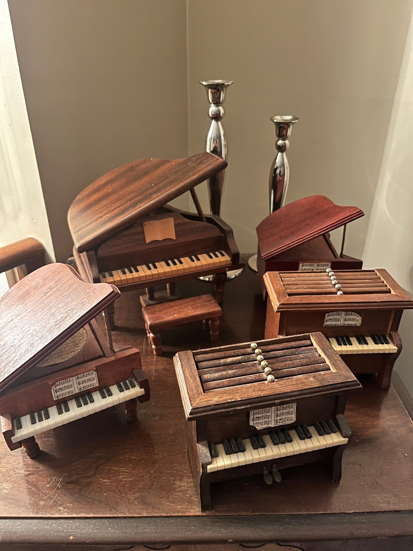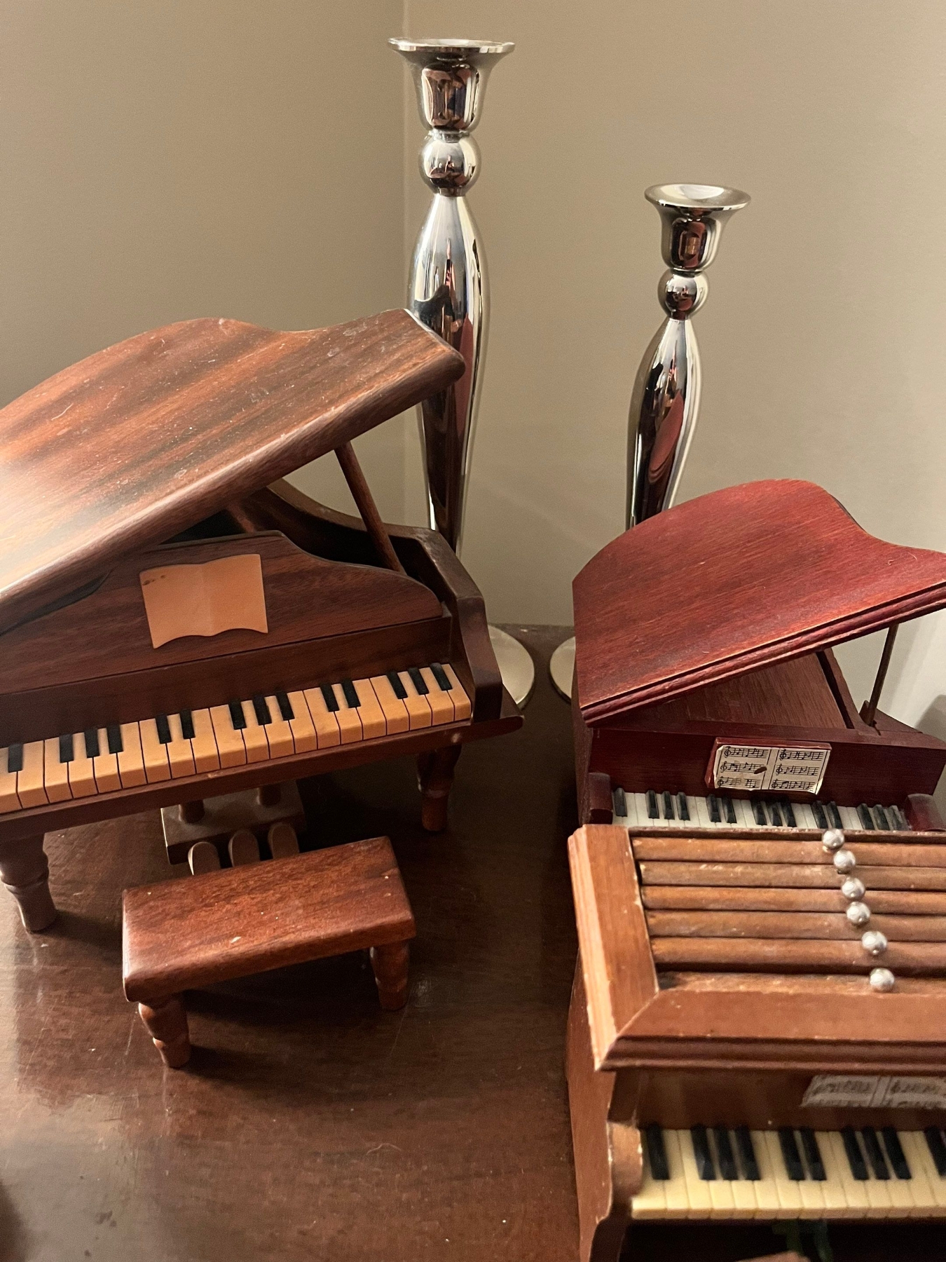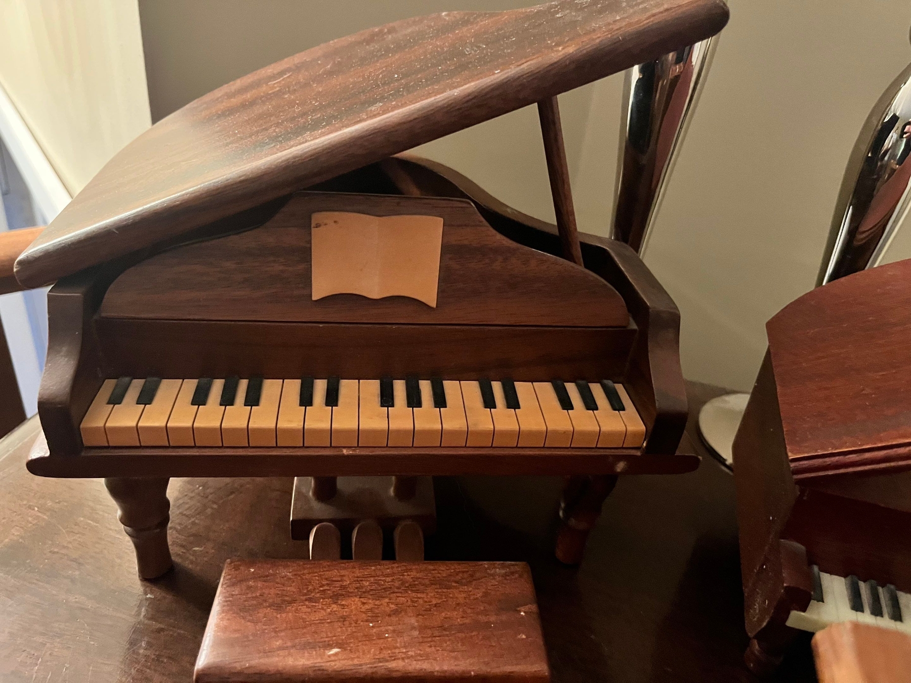 Collection of piano, music boxes, and vintage coaster sets with silver candleholders