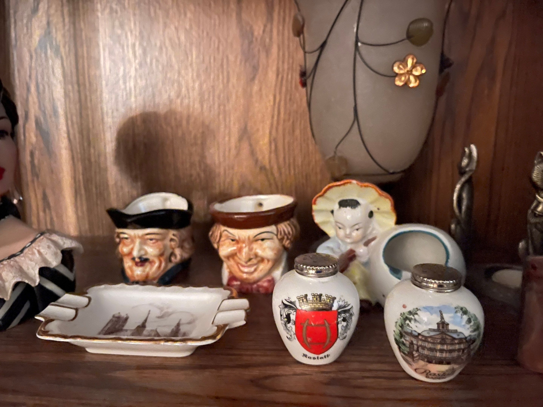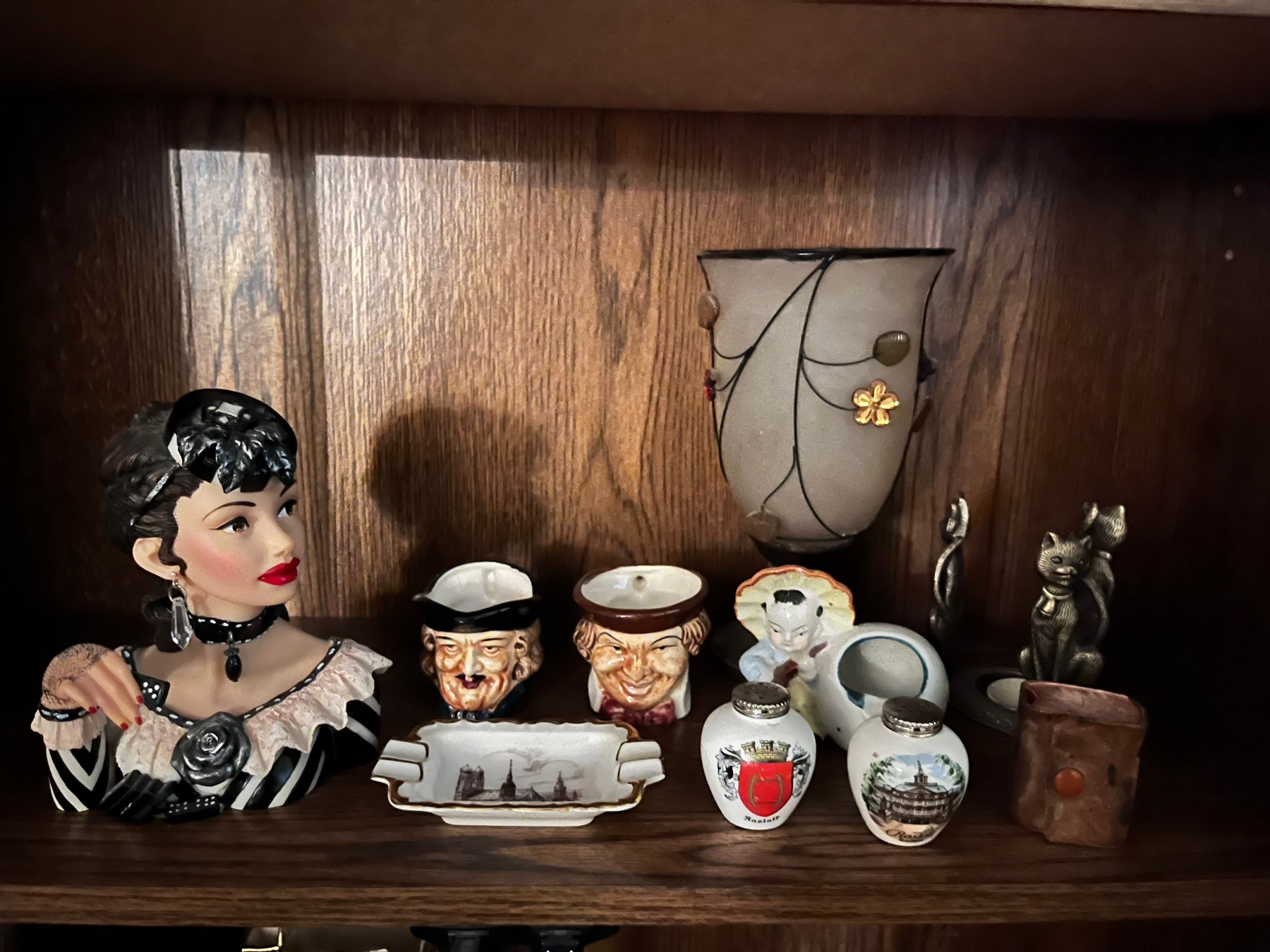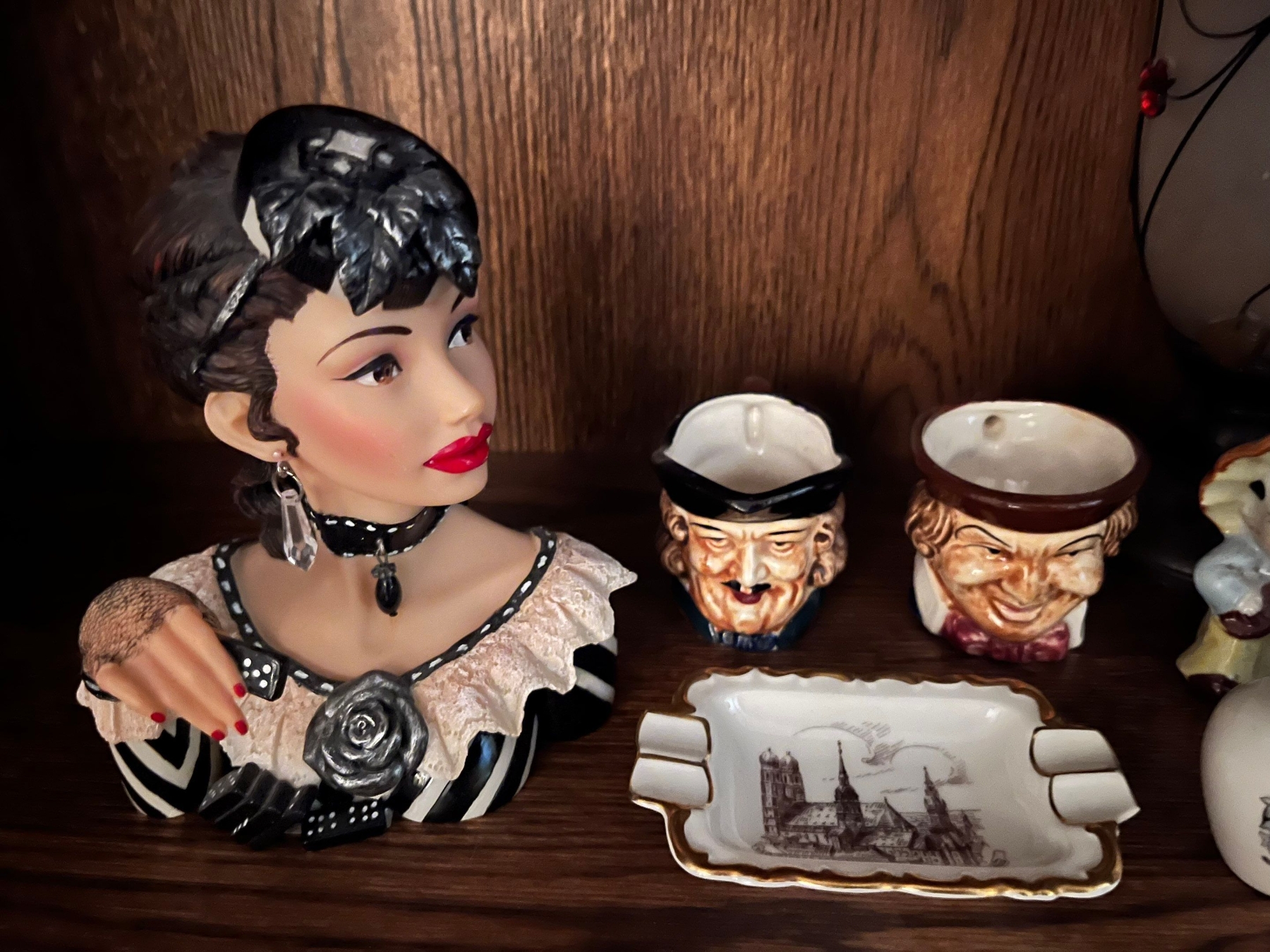 Collection of small face cups, little Webster, dictionary book lady statue small Mexican ashtray