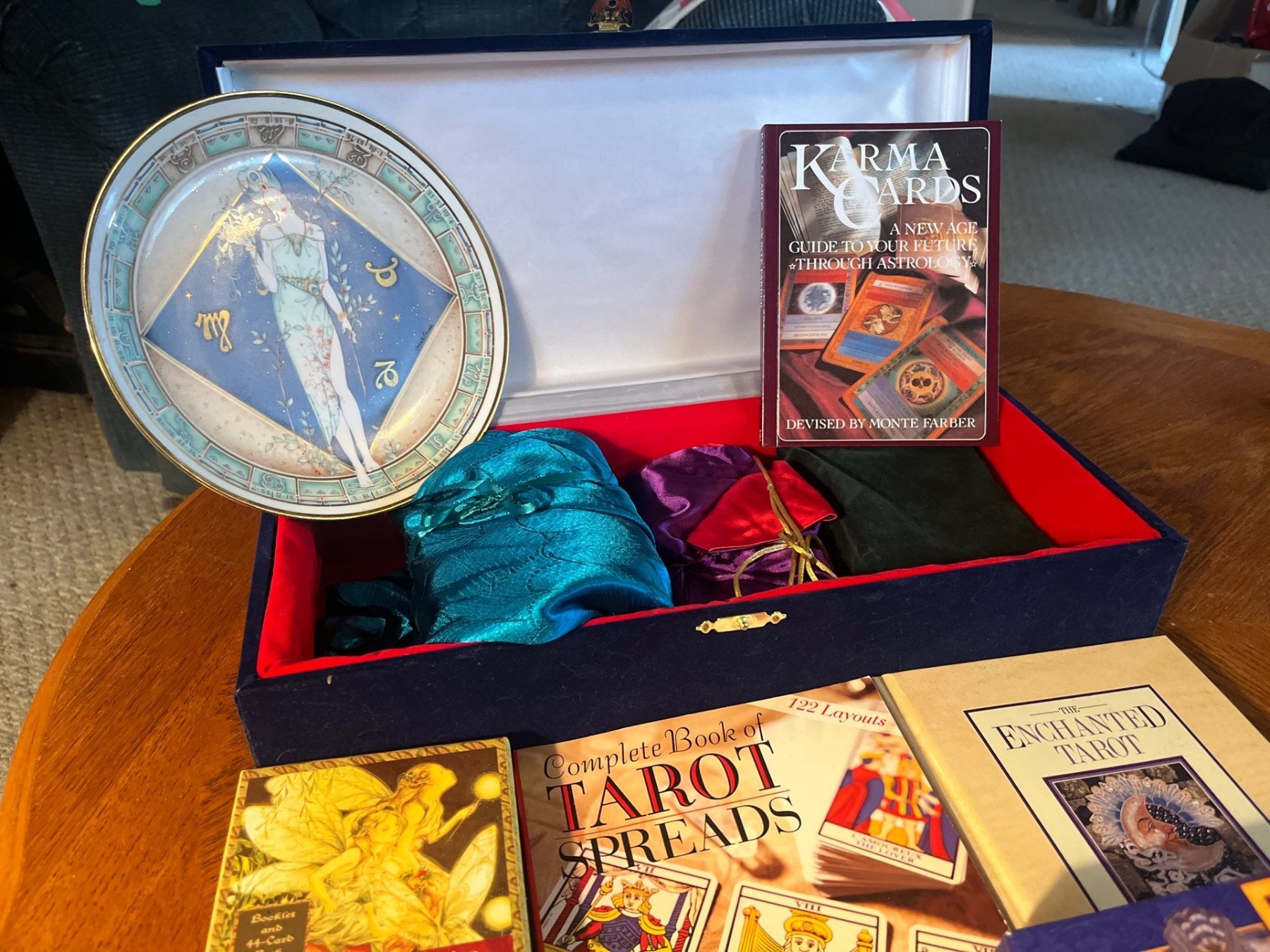 Collection of tarot cards, tarot card, books, palm, reading books, all in a velvet case