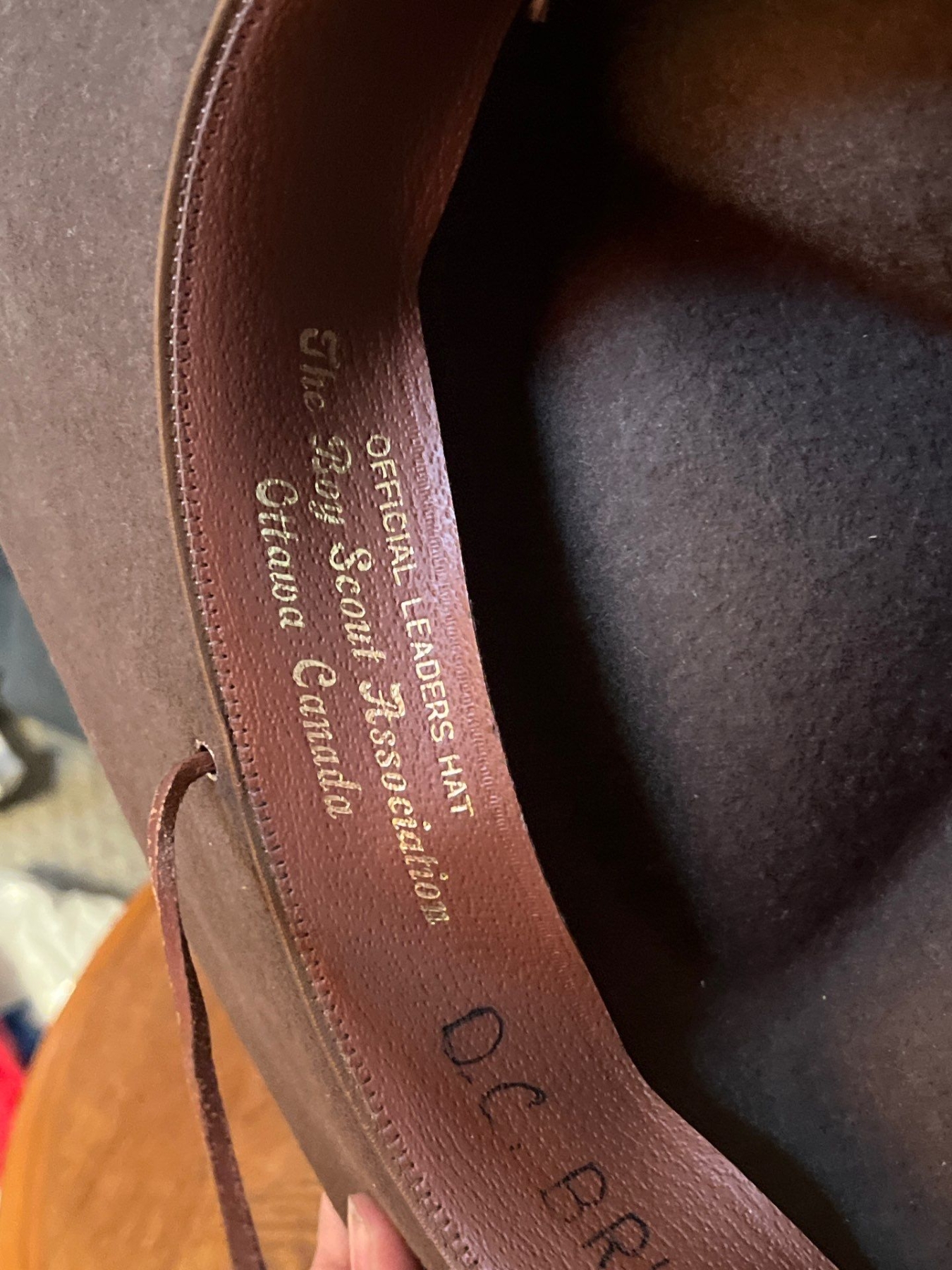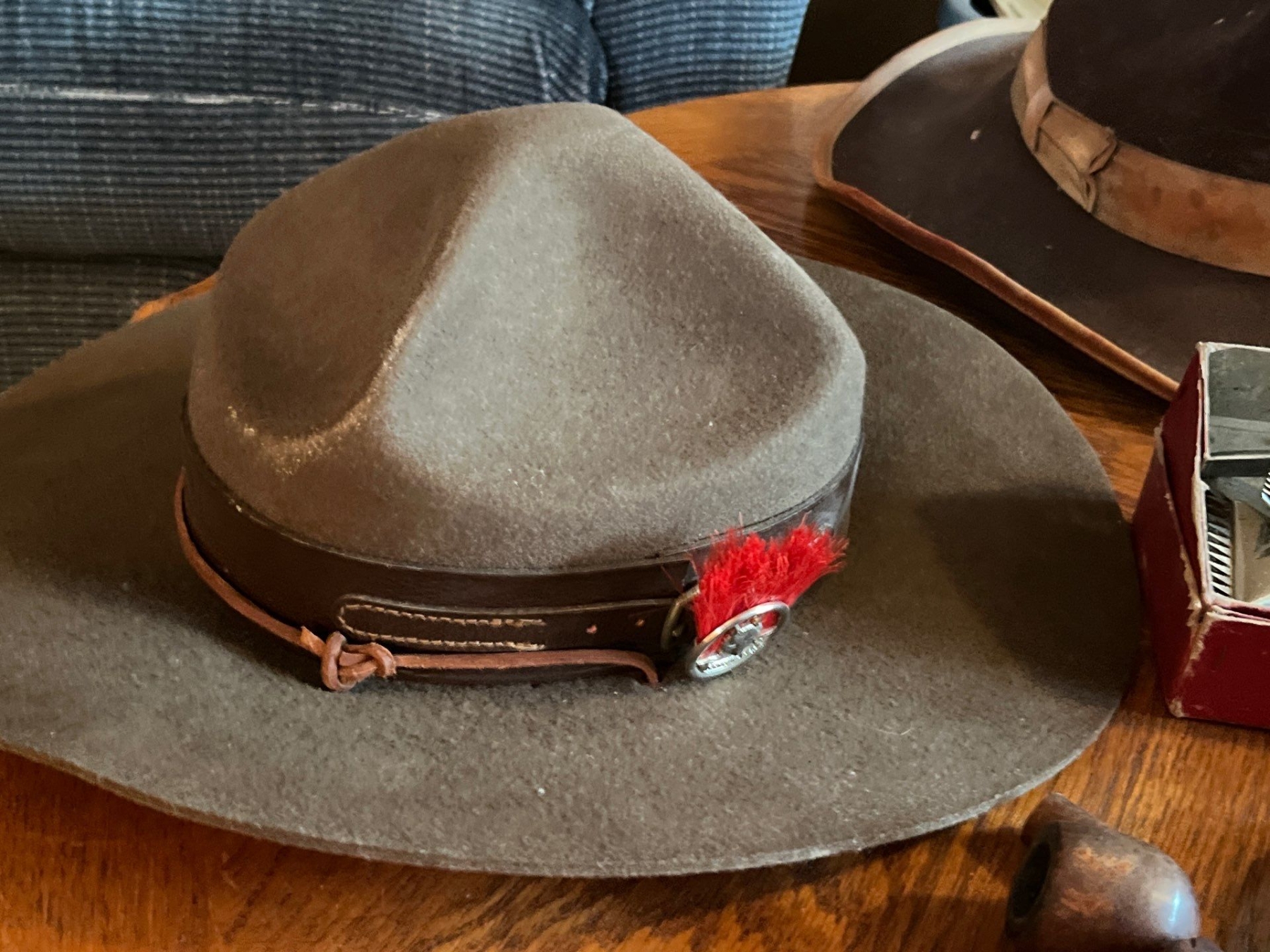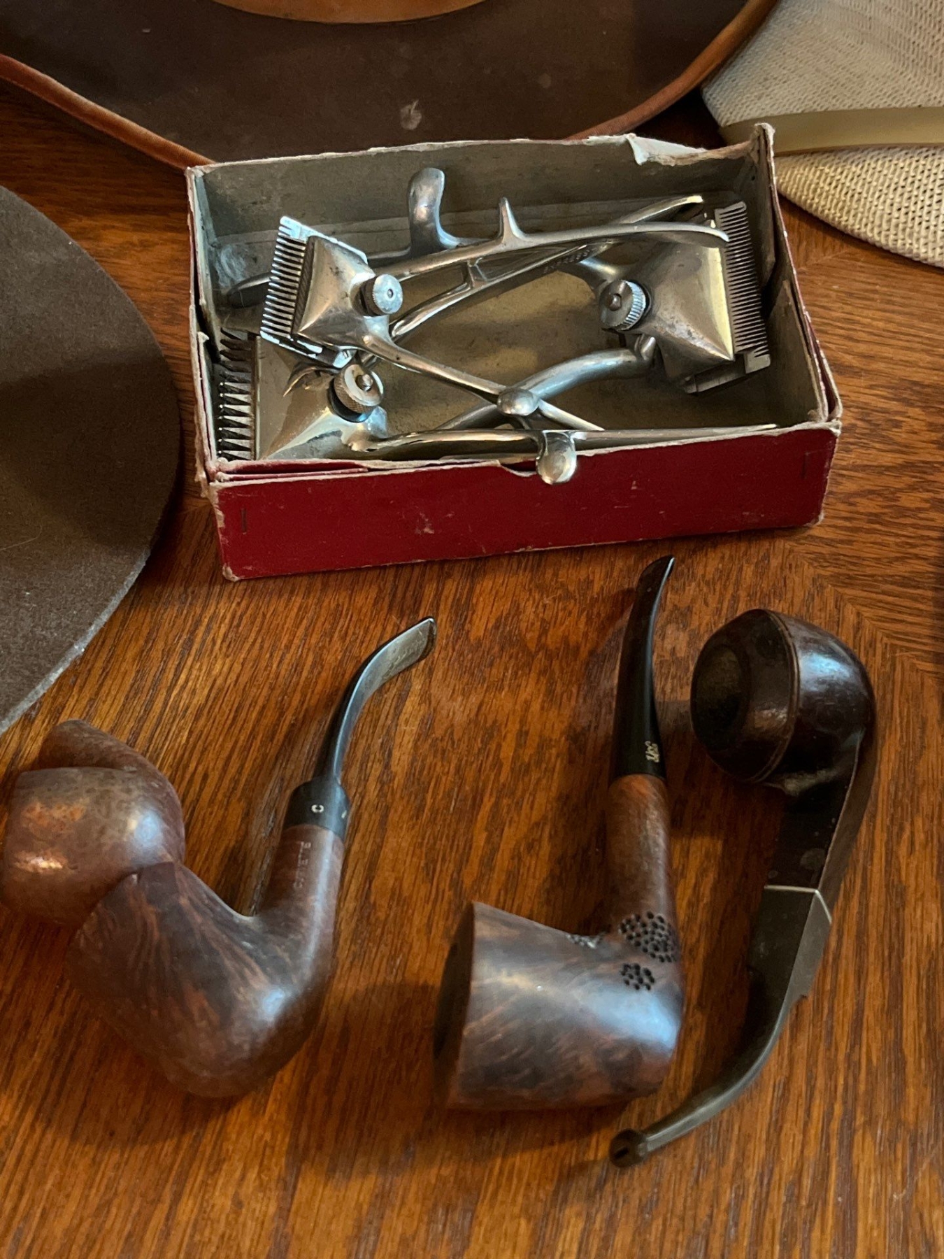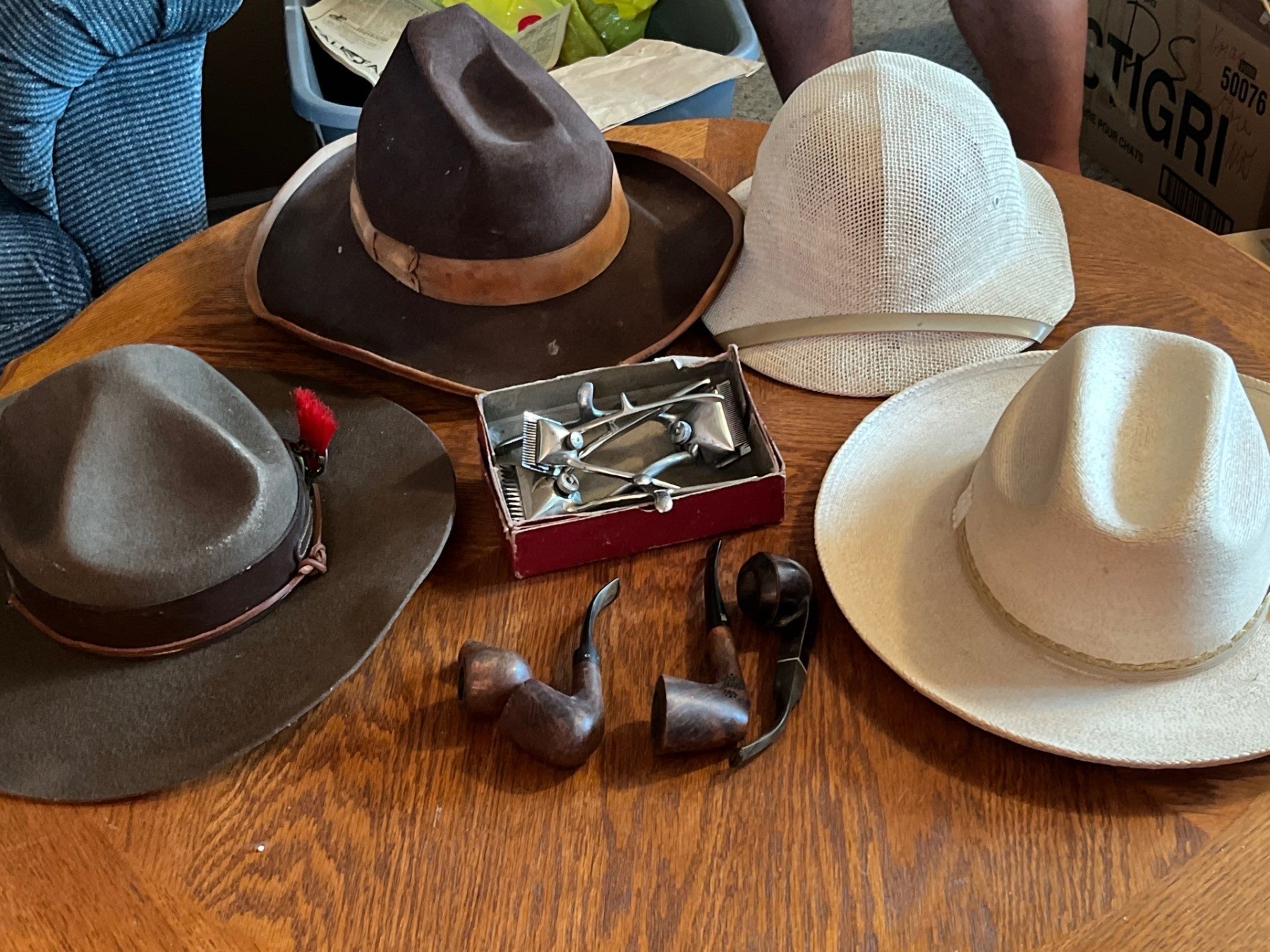 Collection of vintage hats from the Boy Scouts of America association, Safari hat, and two vintage cowboy hats vintage clippers, and pipes. Yello-Bole smoking pipe, specifically identifying it as a "STANDARD GENUINE BRIAR" model.