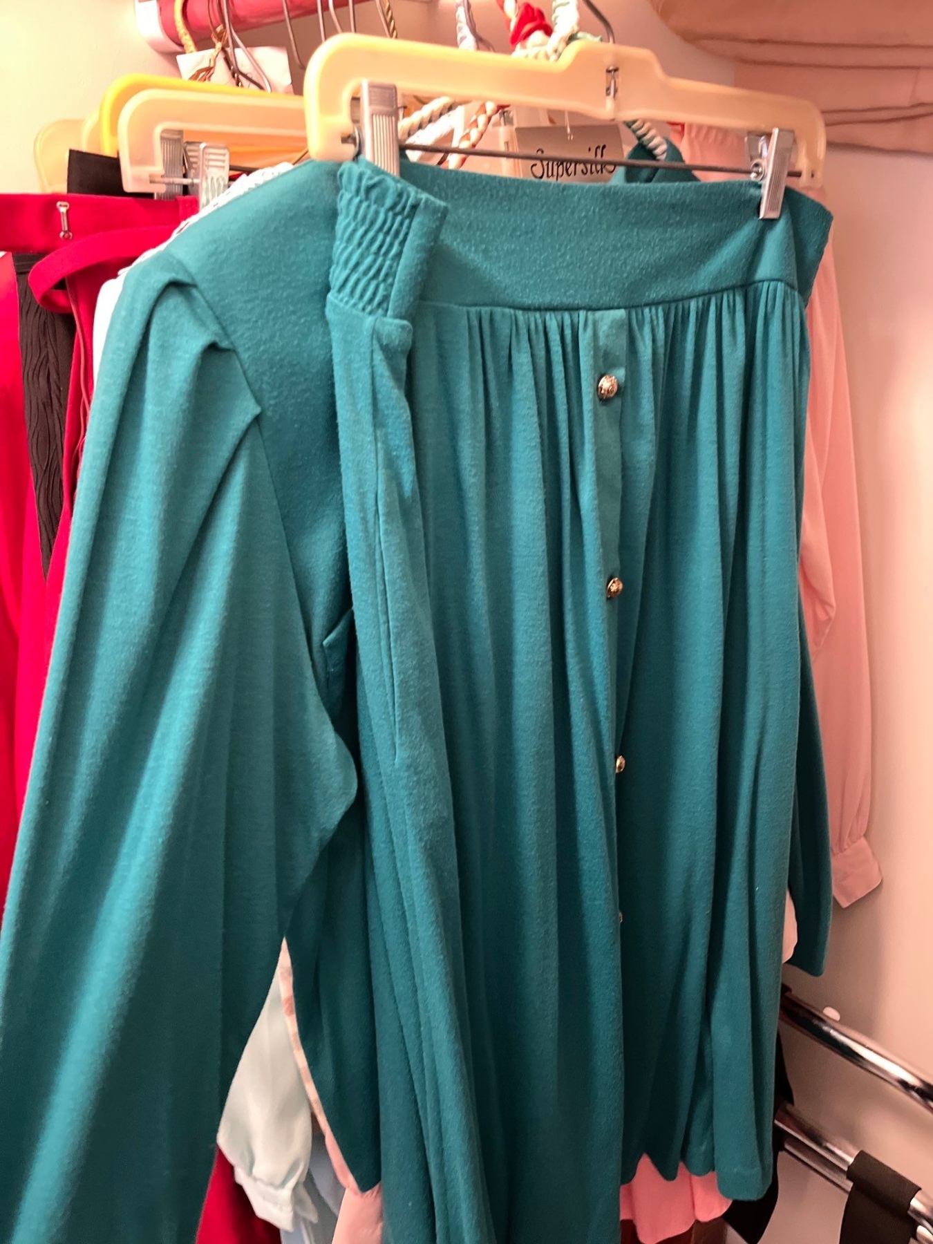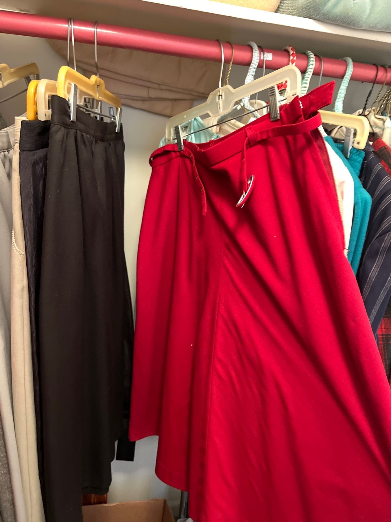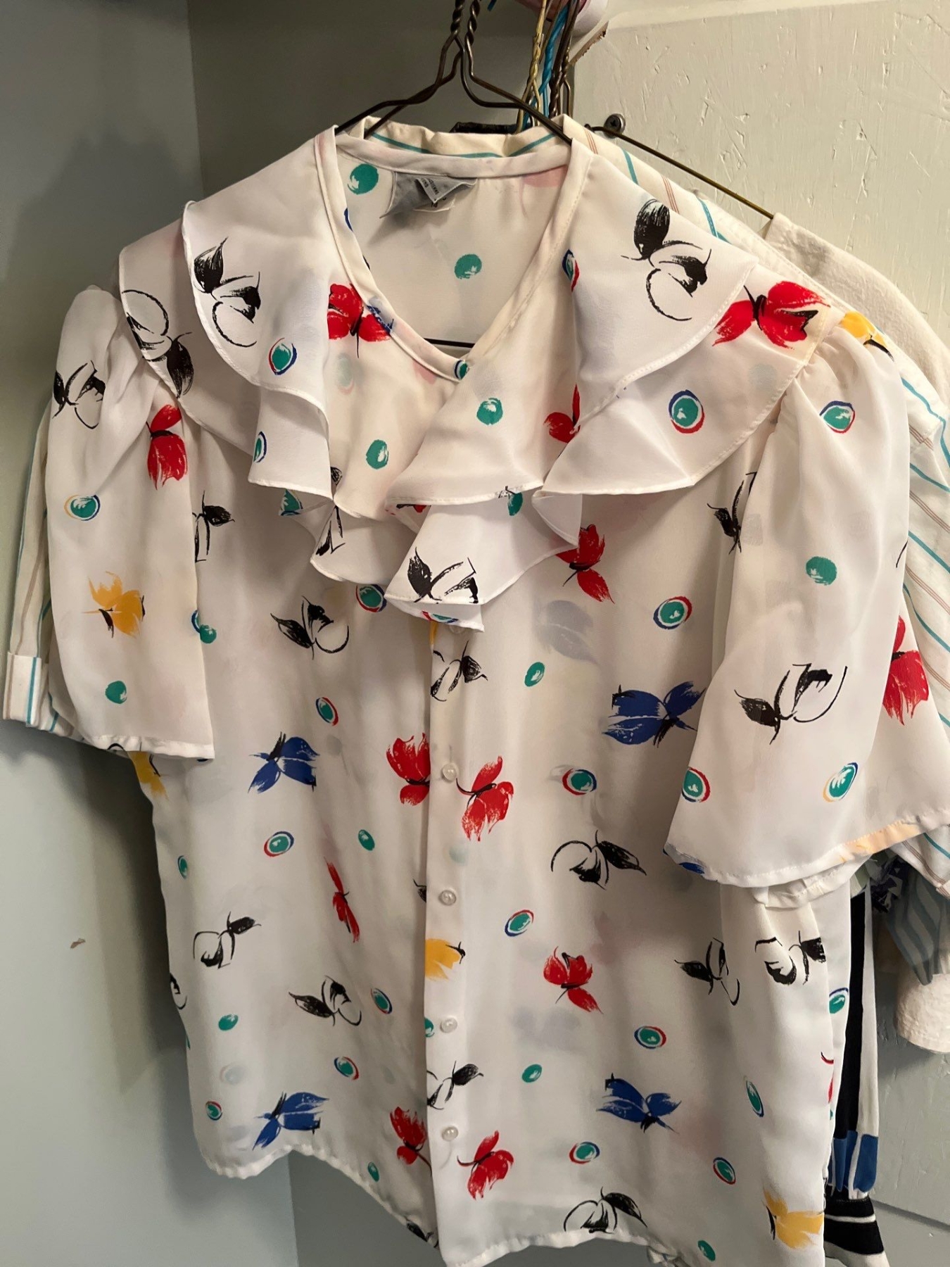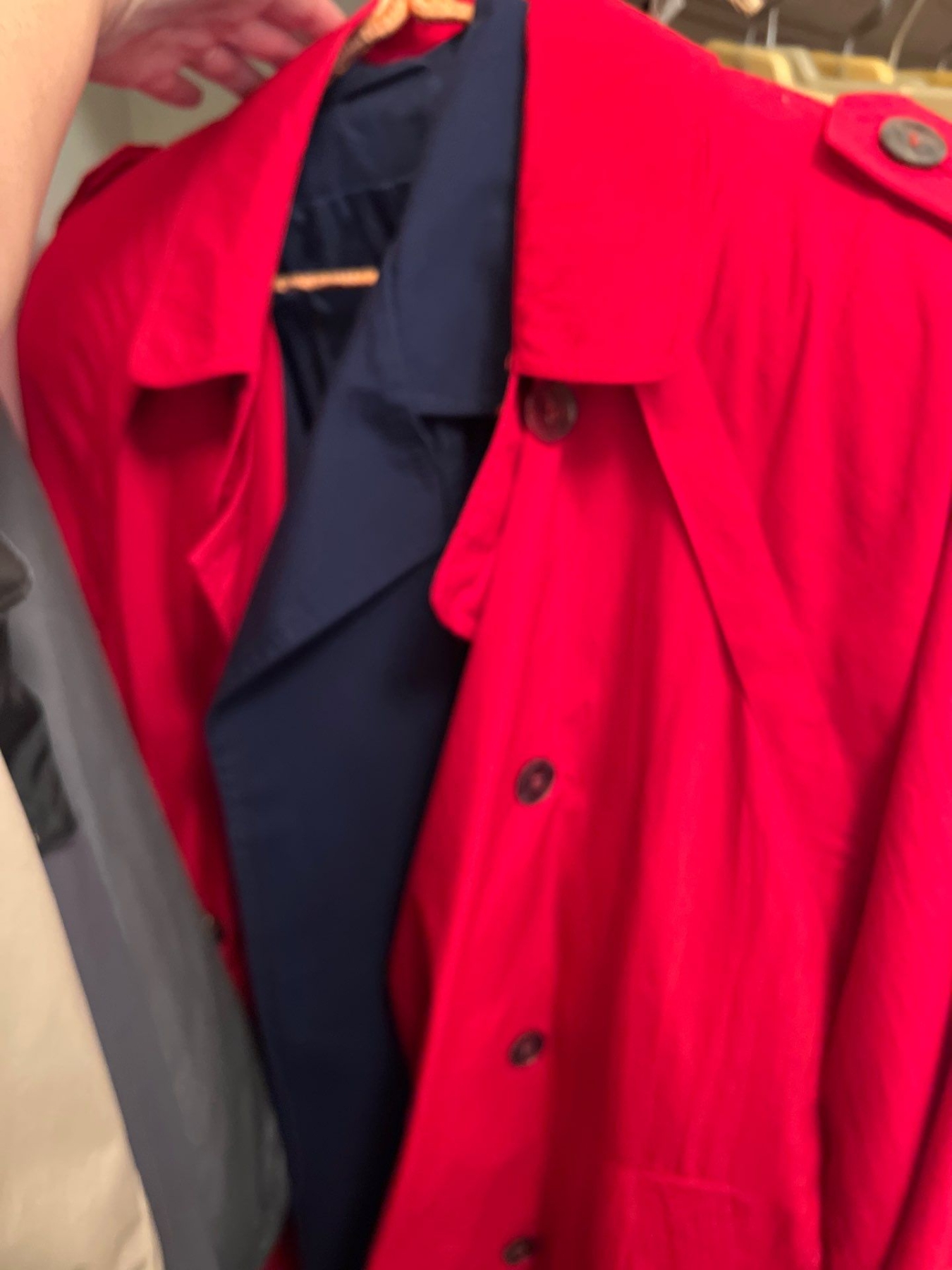 Collection of vintage women’s clothing, shirts, skirts, and two full length trench coats, all in great condition.