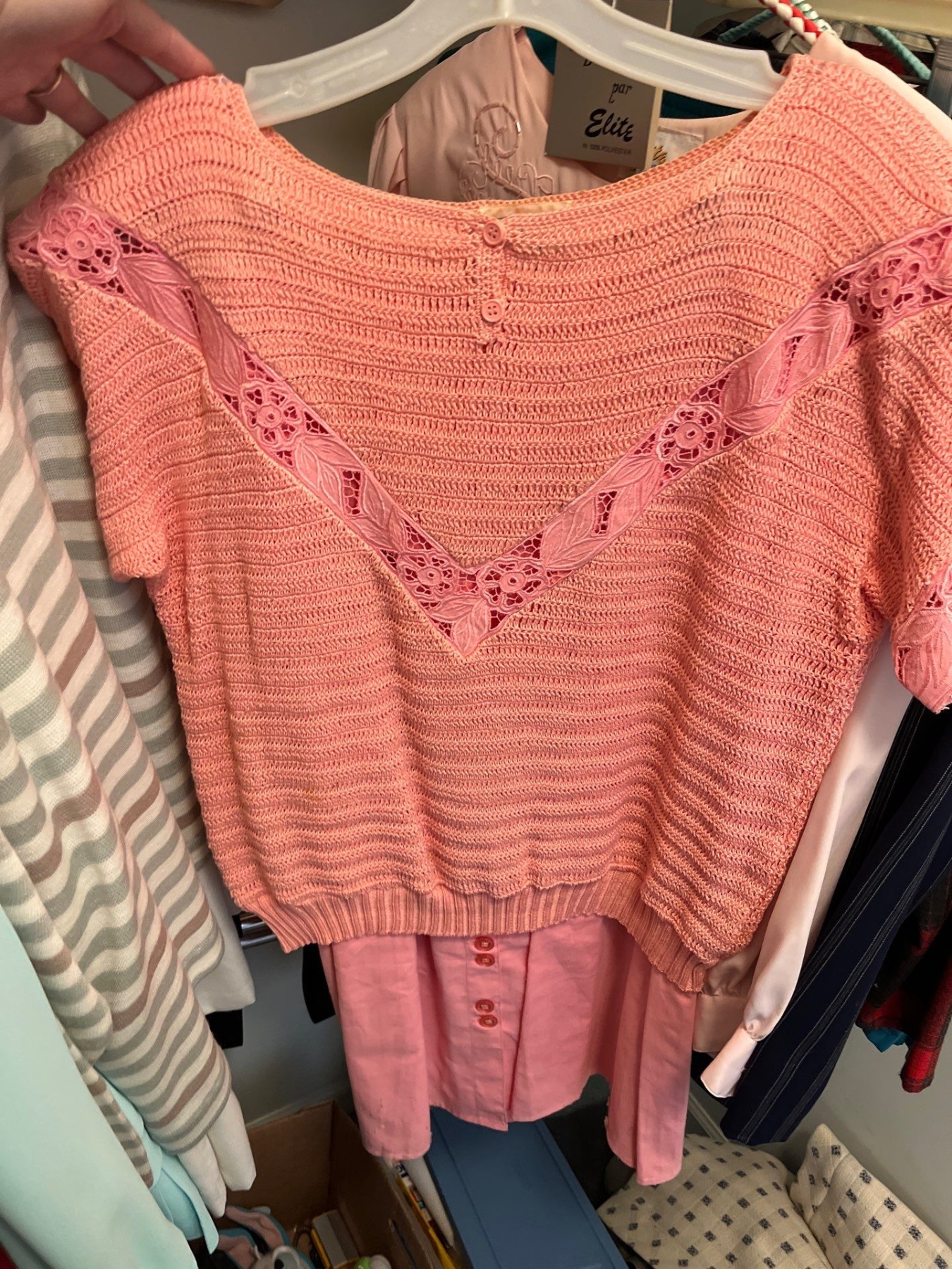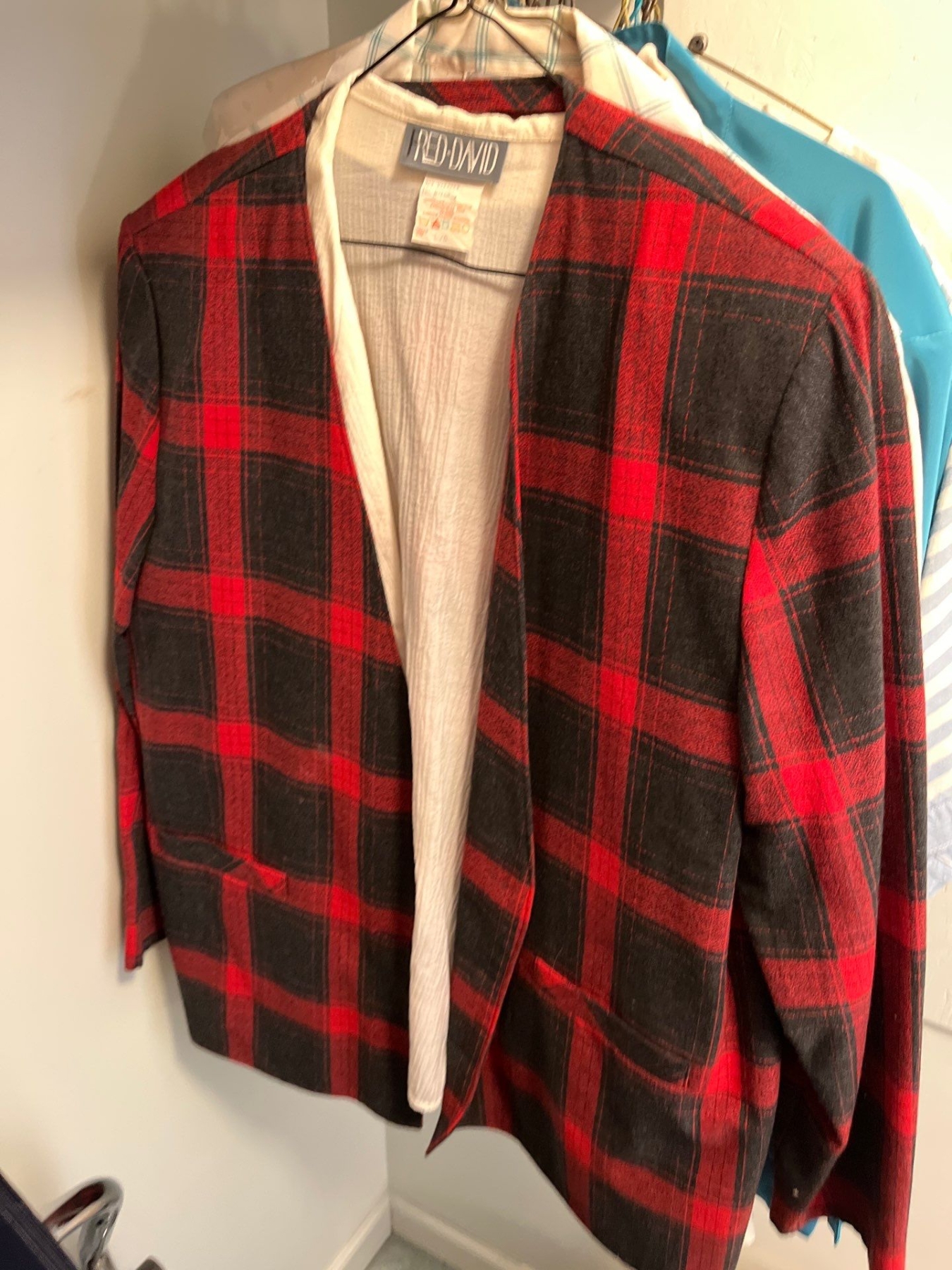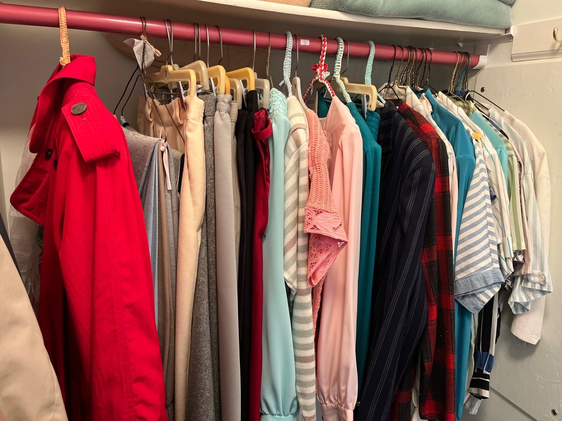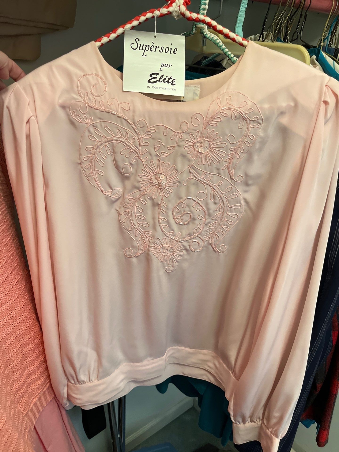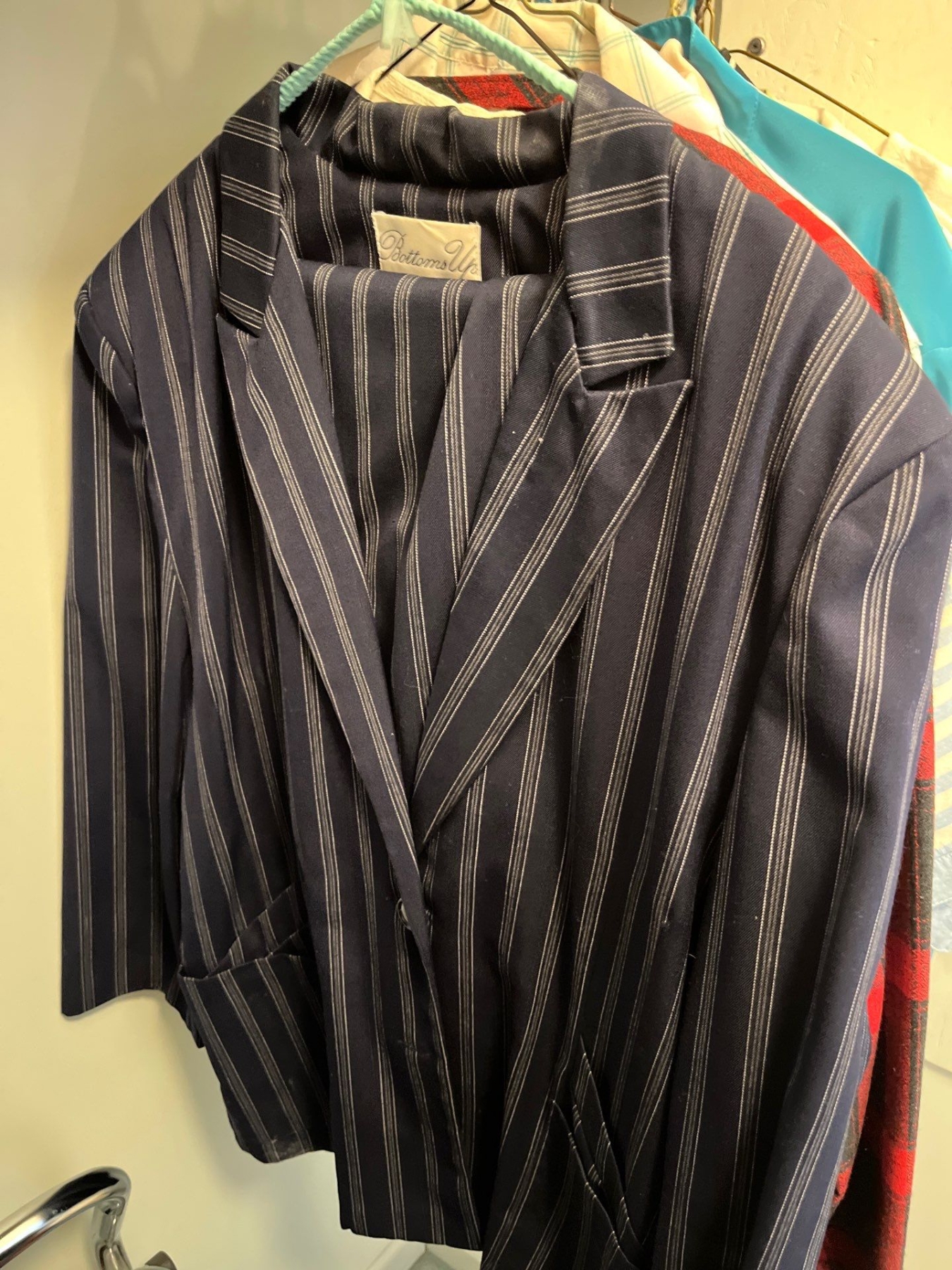 Collection of vintage women’s clothing, shirts, skirts, and two full length trench coats, all in great condition.