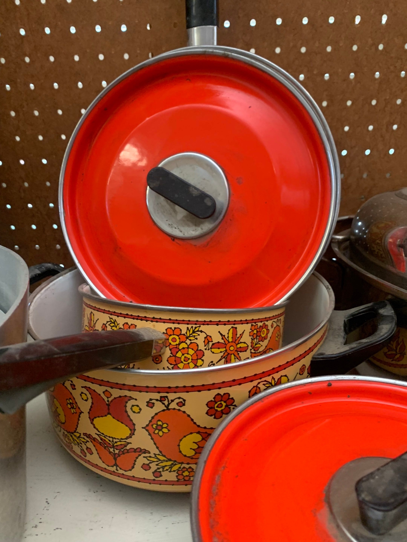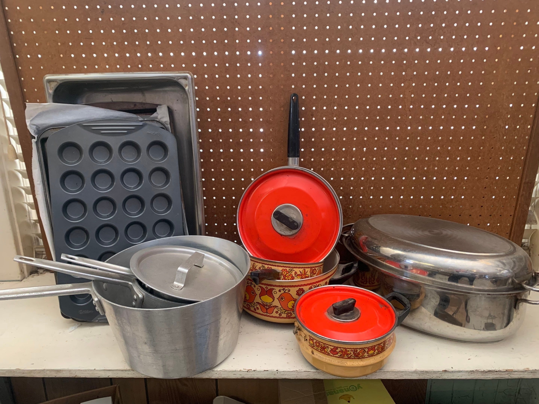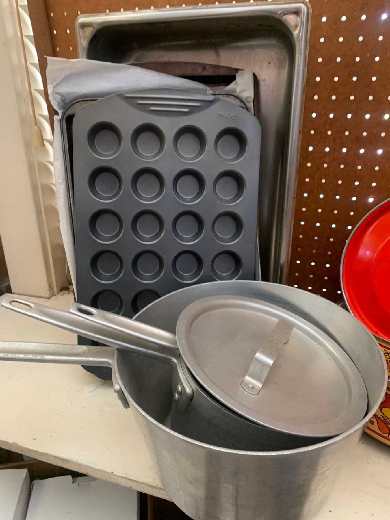 Commercial pot set, vintage pot set, muffin tins, roasting pan and more