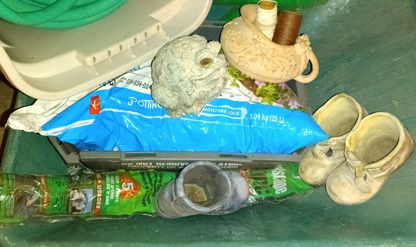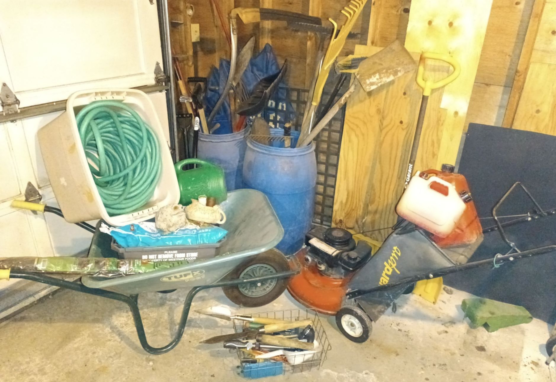 Complete Gardeners Stock Pile Of Goodies Rakes, wheelbarrow, Lawnmower, Weed Whacker, Jerry Cans, Hose, Planters, Shovels & More!