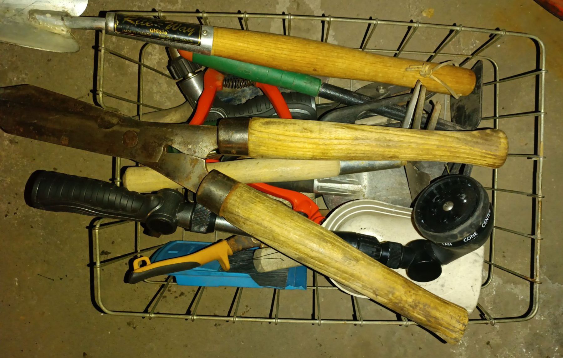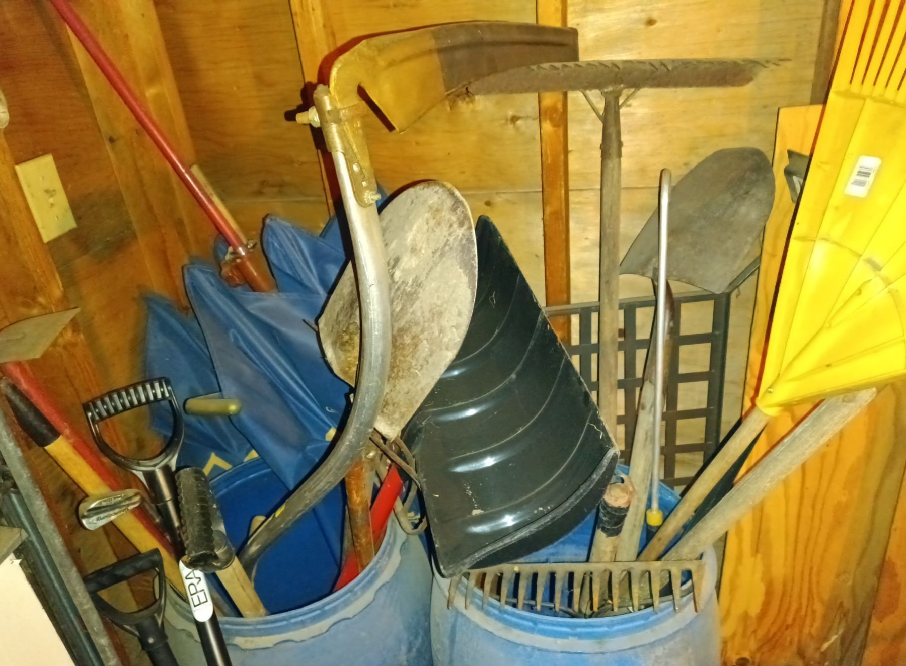 Complete Gardeners Stock Pile Of Goodies Rakes, wheelbarrow, Lawnmower, Weed Whacker, Jerry Cans, H