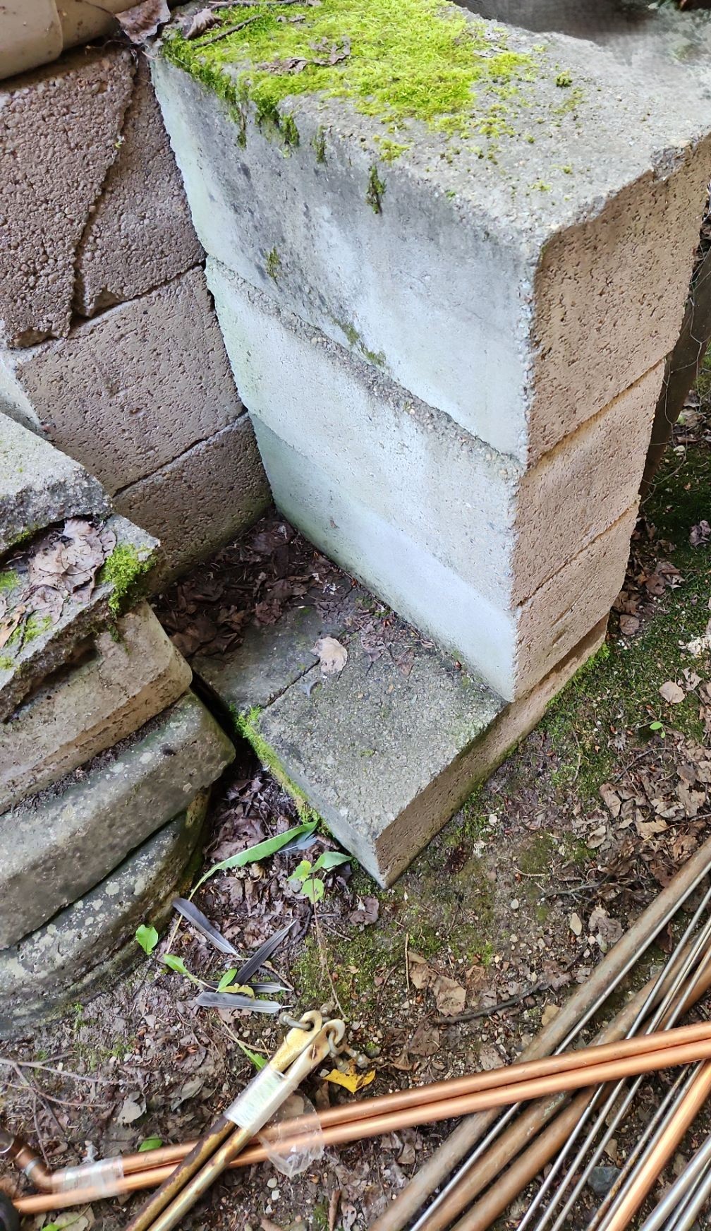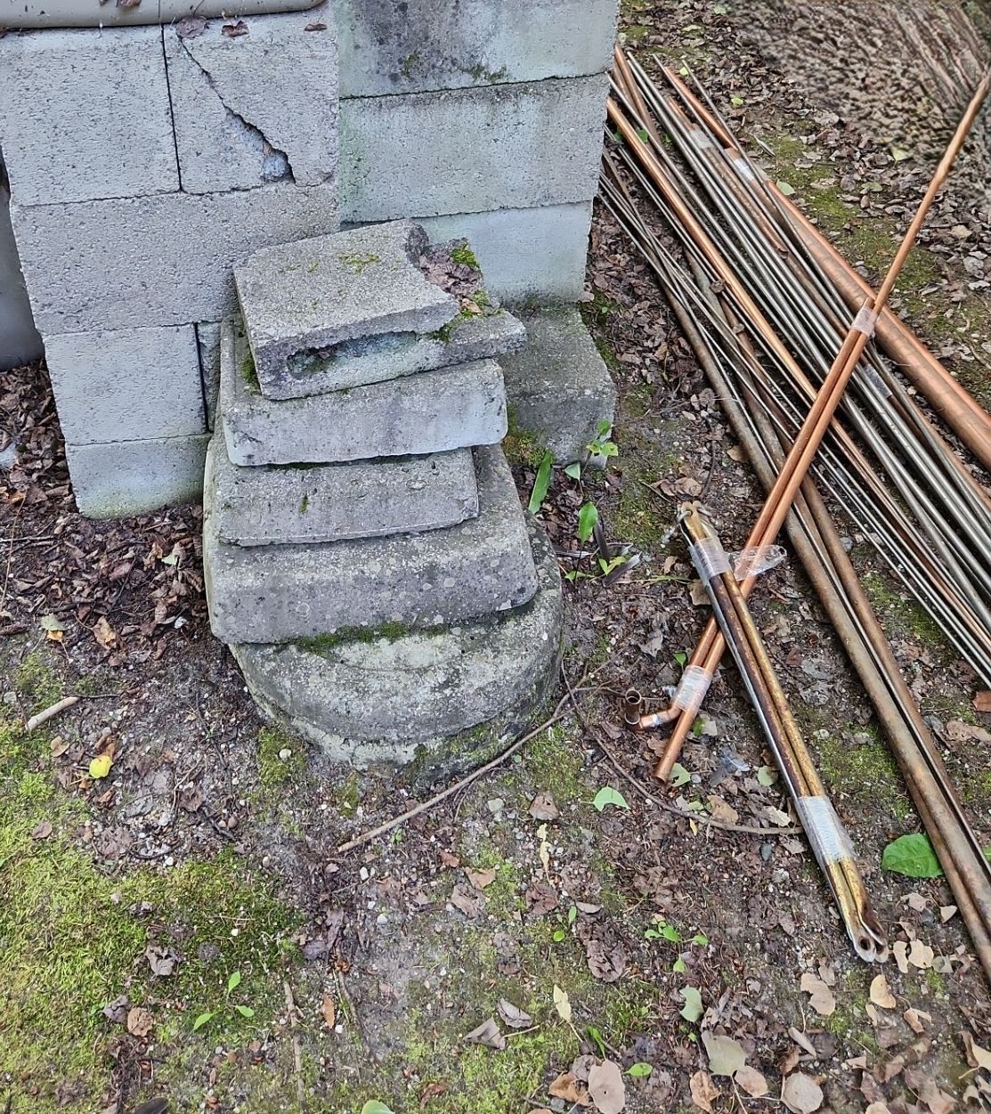 Concrete Patio Blocks(Cubes 15 X 8 X 8), Copper and Metal Pipes/ Rods, Bin w/ Bricks