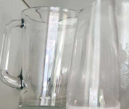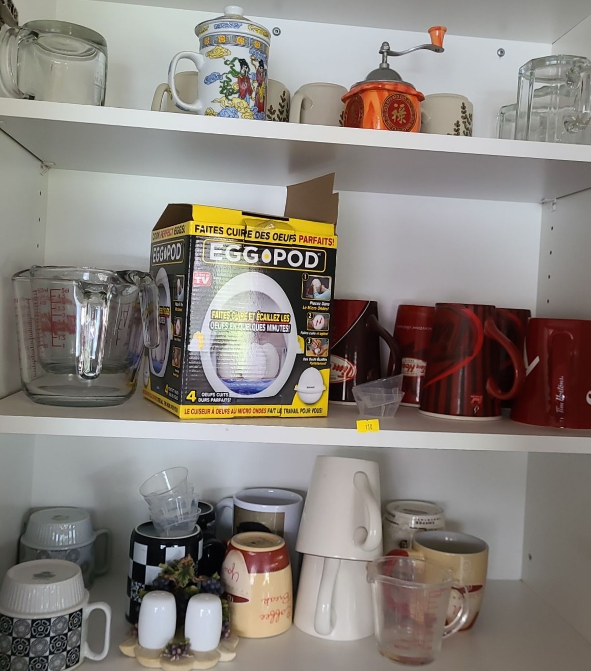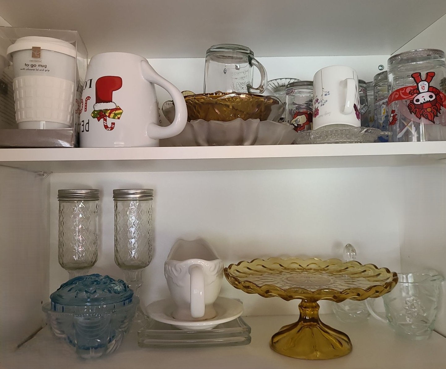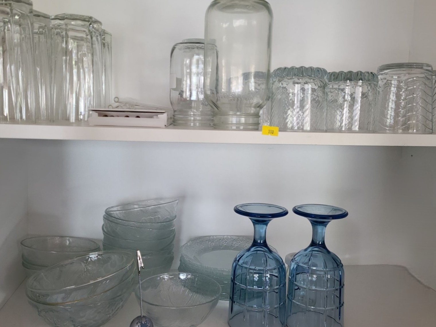 Contents of Cupboards: Yellow Cake Plate, Drinkware, Bowls, Wall Clock, Vases, Artificial Flowers