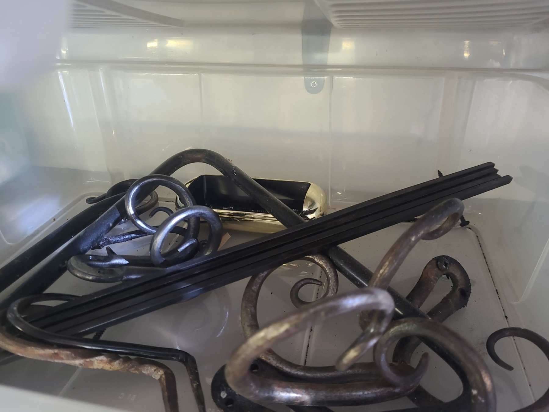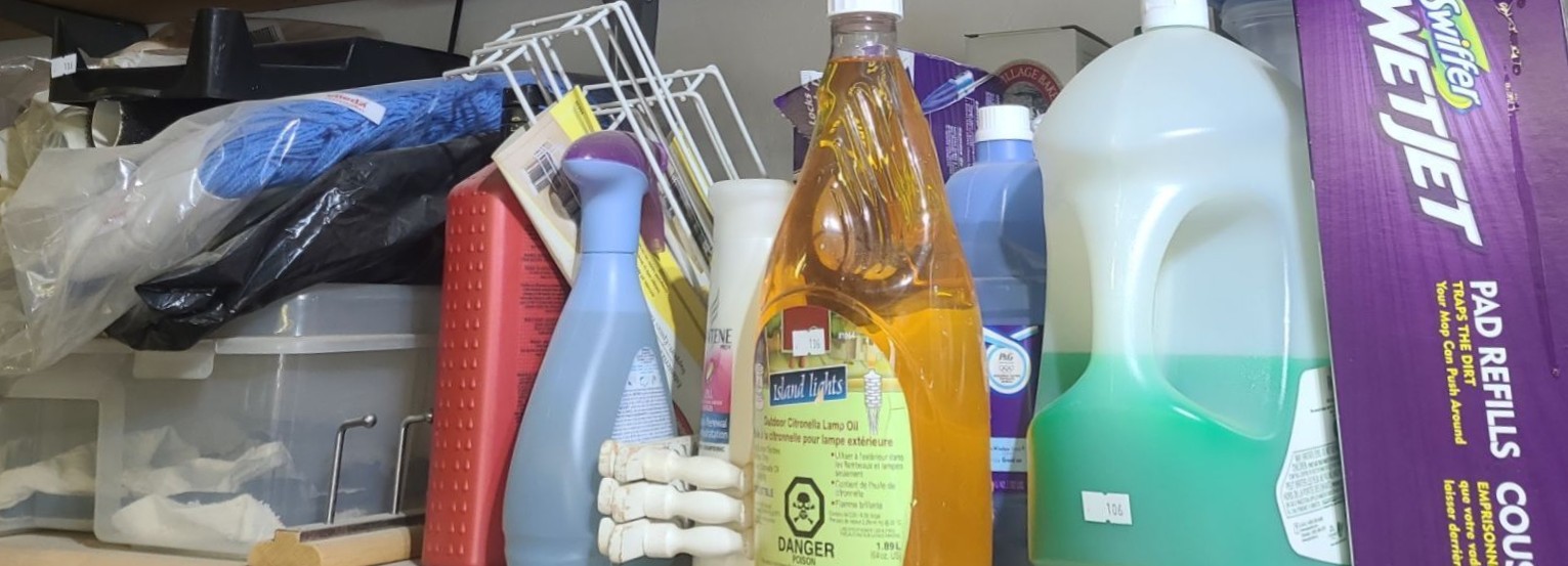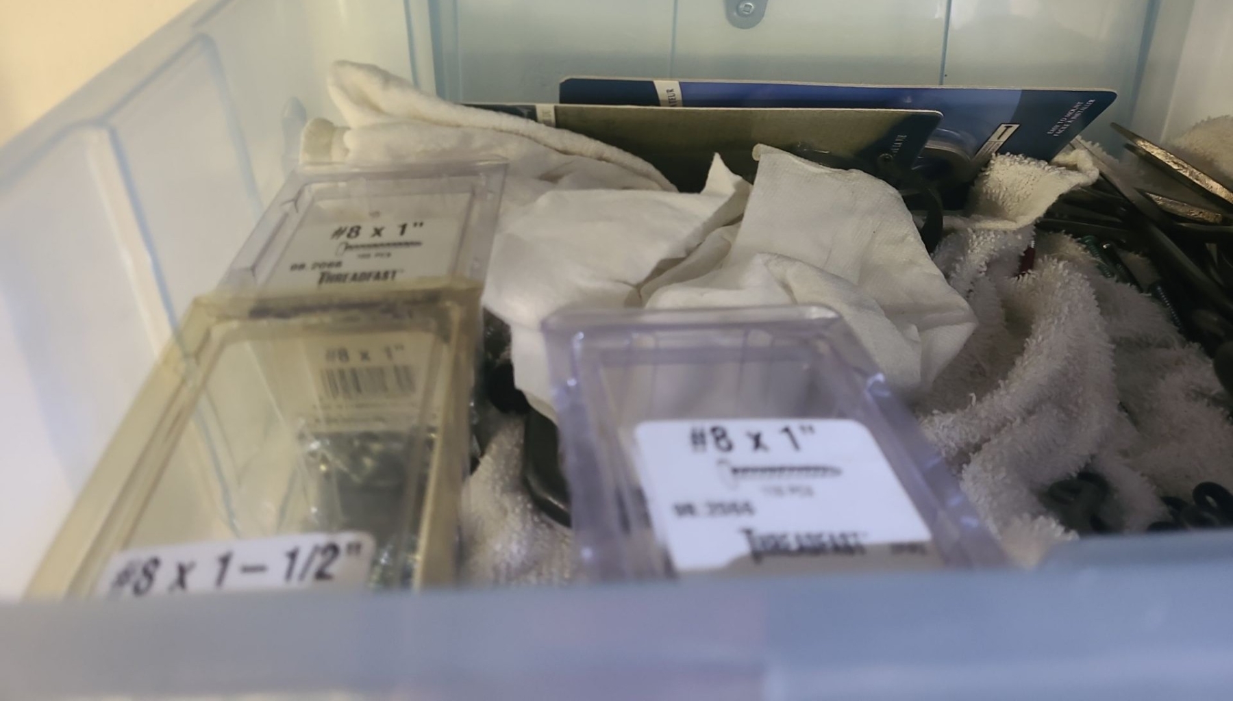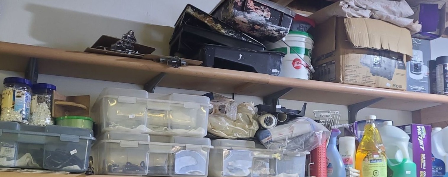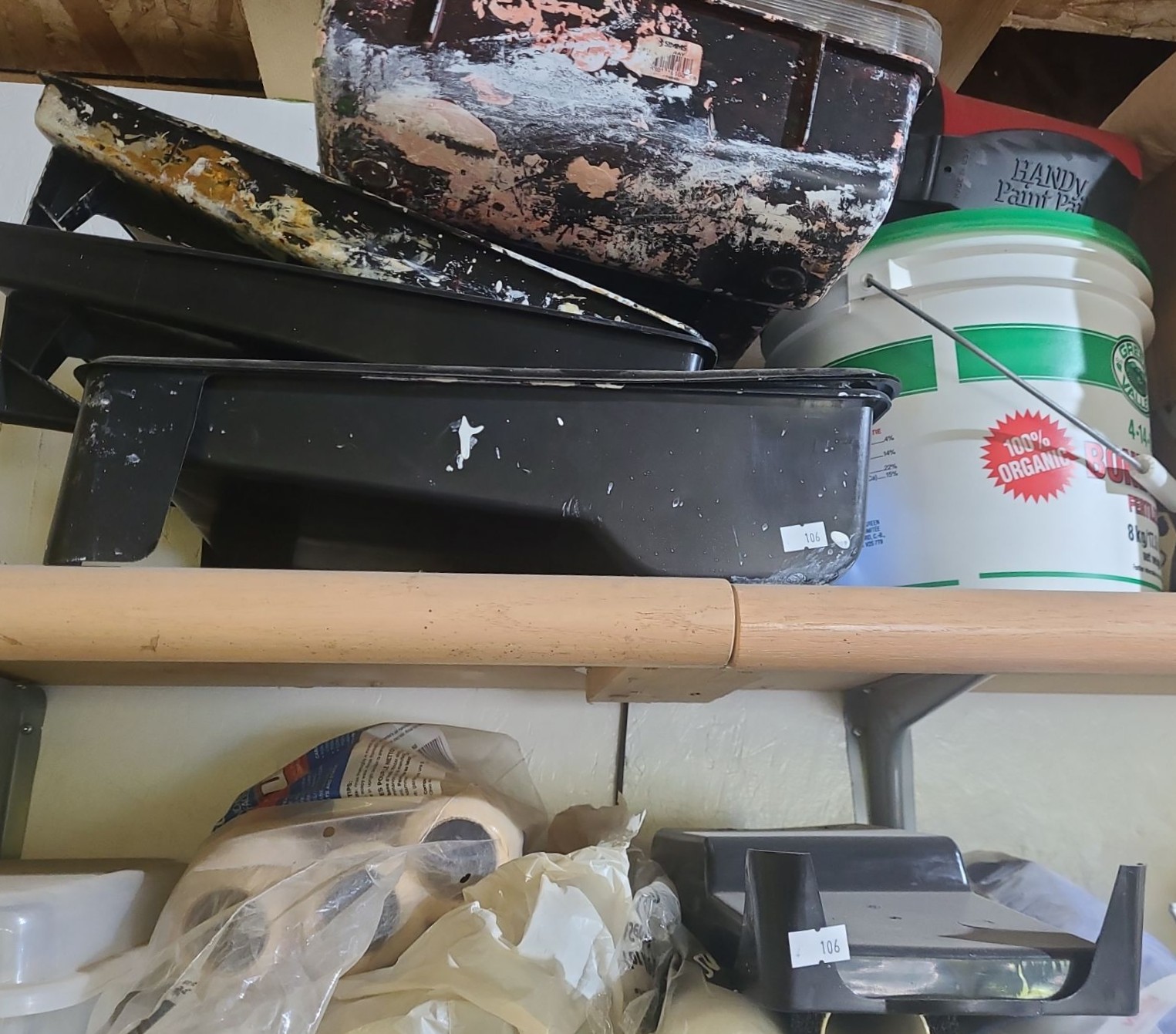 Contents of Garage Shelves: Hardware, Paint Trays, Paint Roller Refills and More!