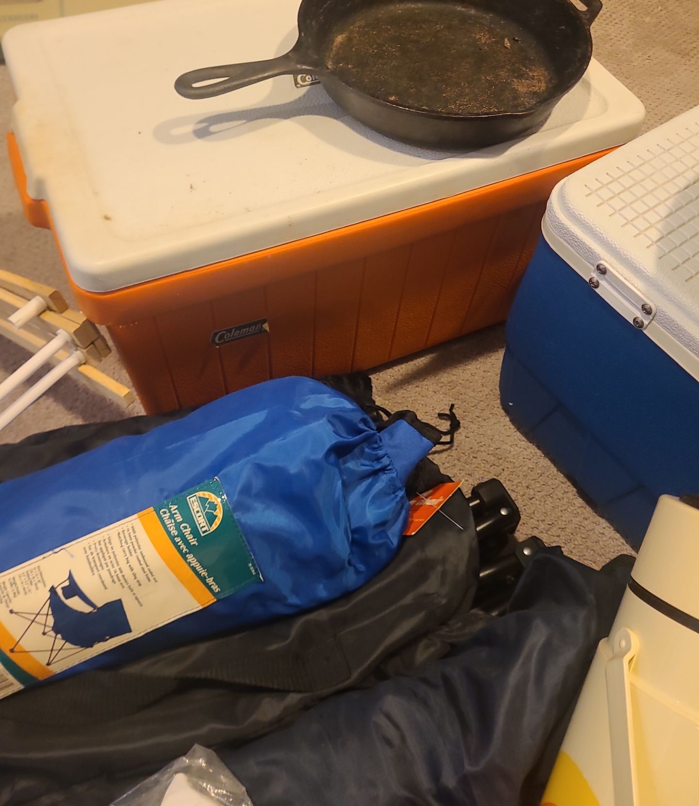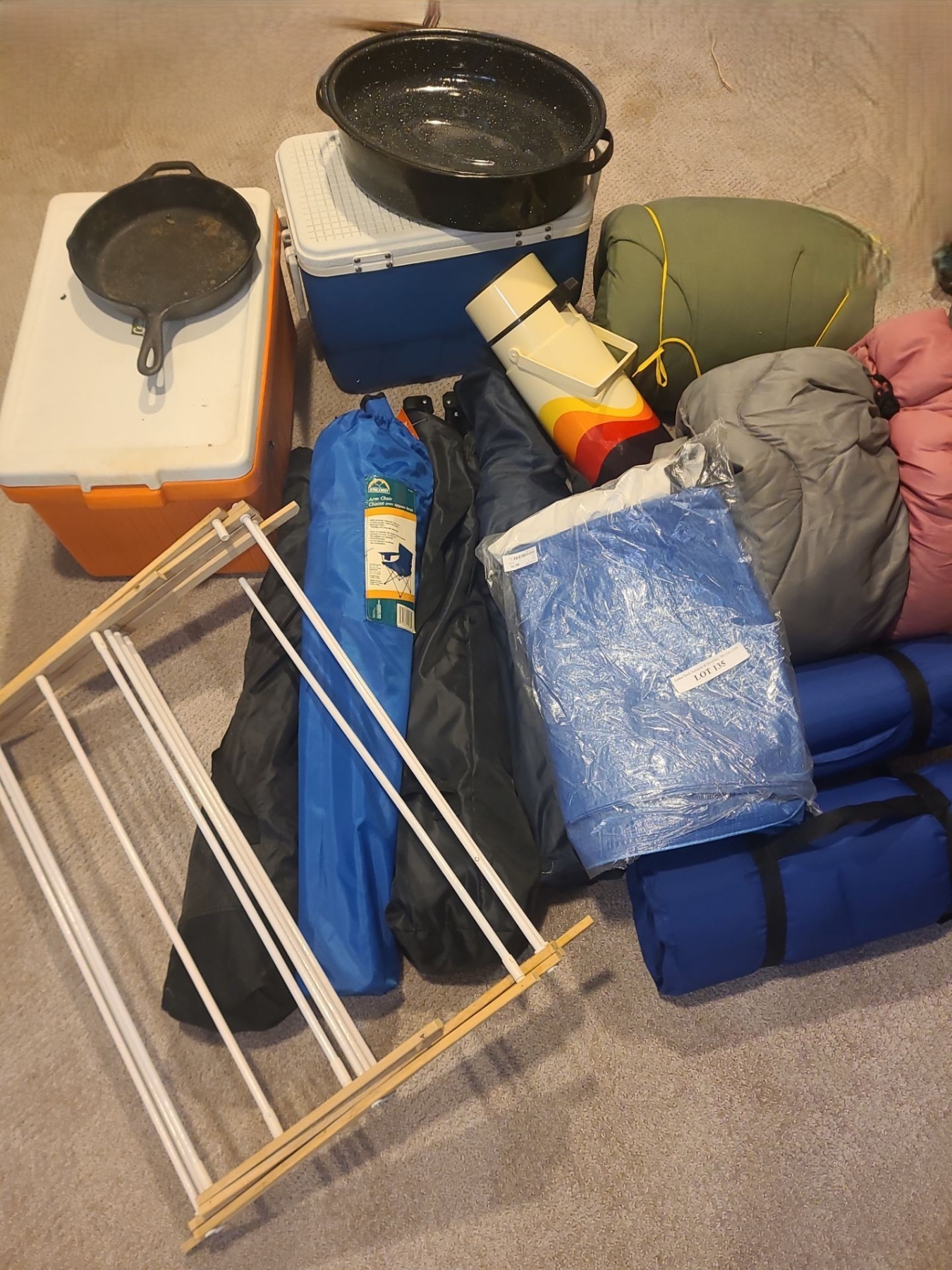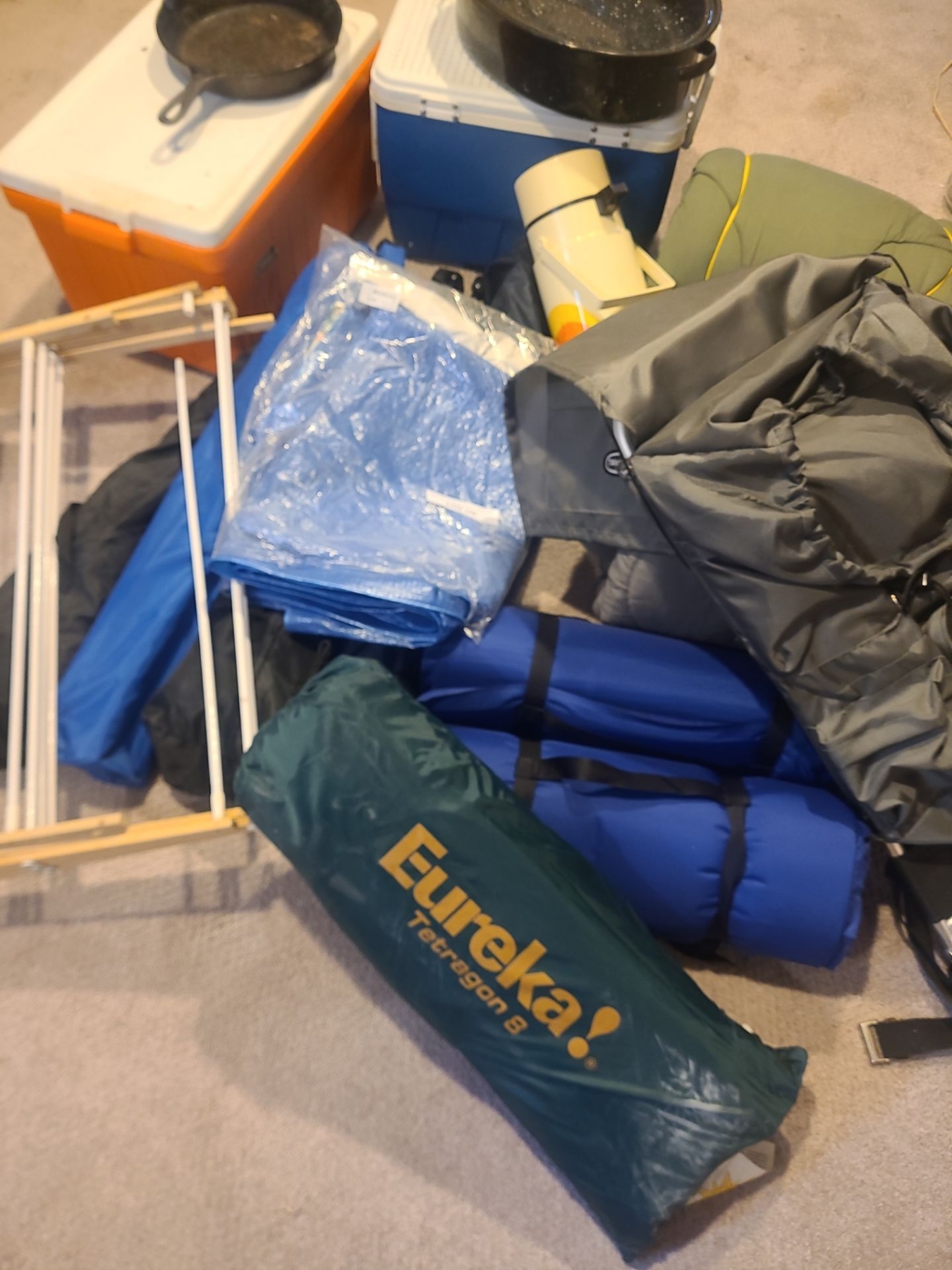 Coolers, Sleeping Bags, Folding Chairs, Mats, Tarps Backpack, Cast Iron Frying Pan & Eureka Tent