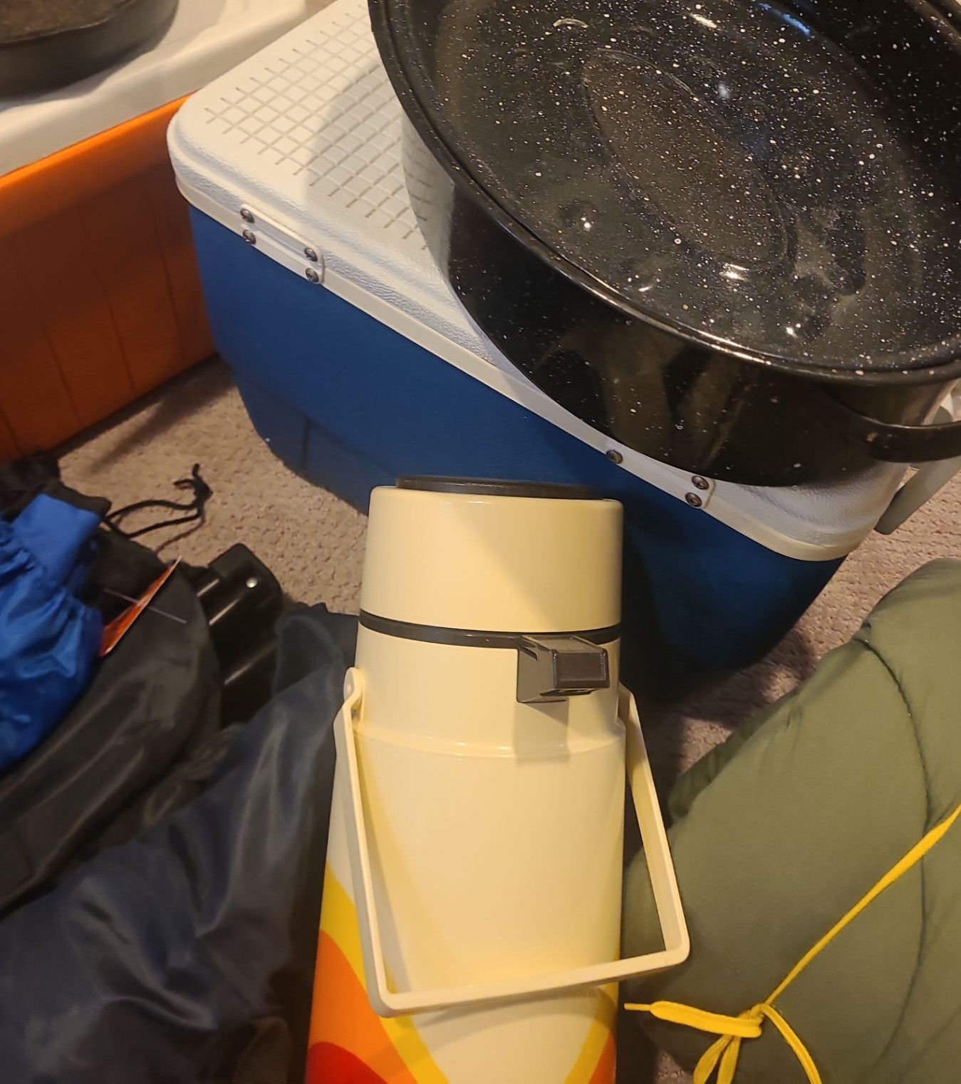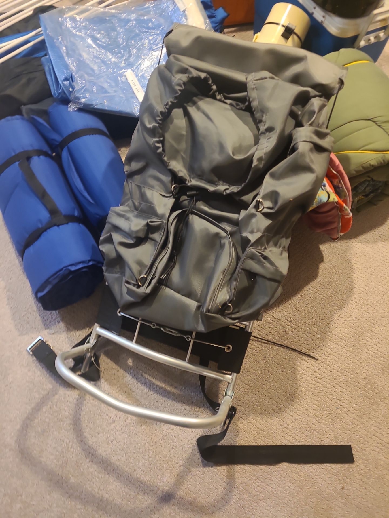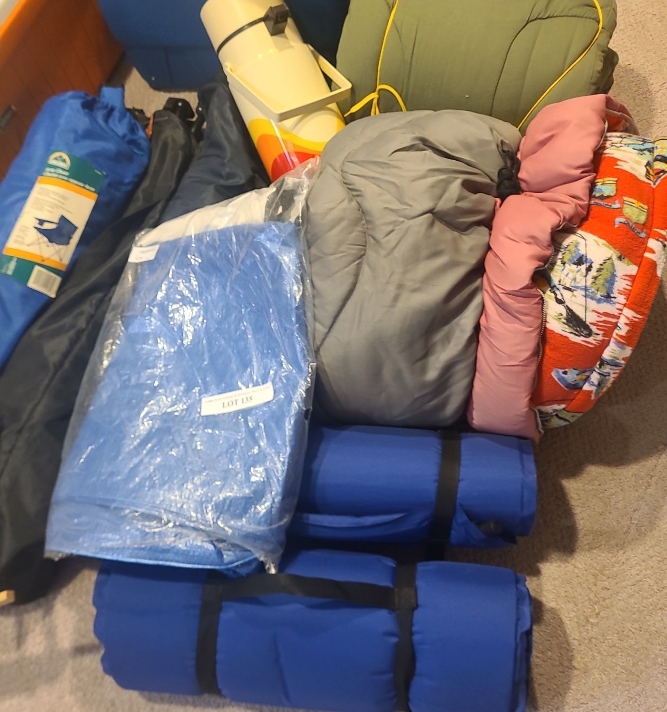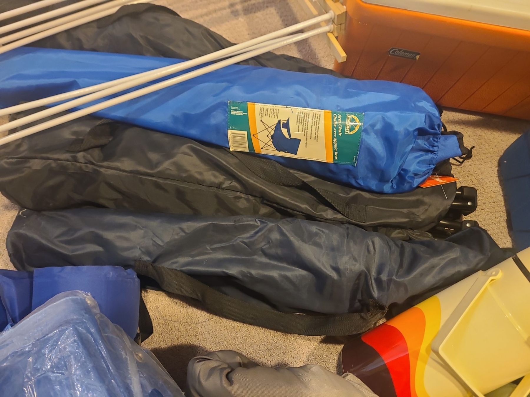 Coolers, Sleeping Bags, Folding Chairs, Mats, Tarps Backpack, Cast Iron Frying Pan & Eureka Tent