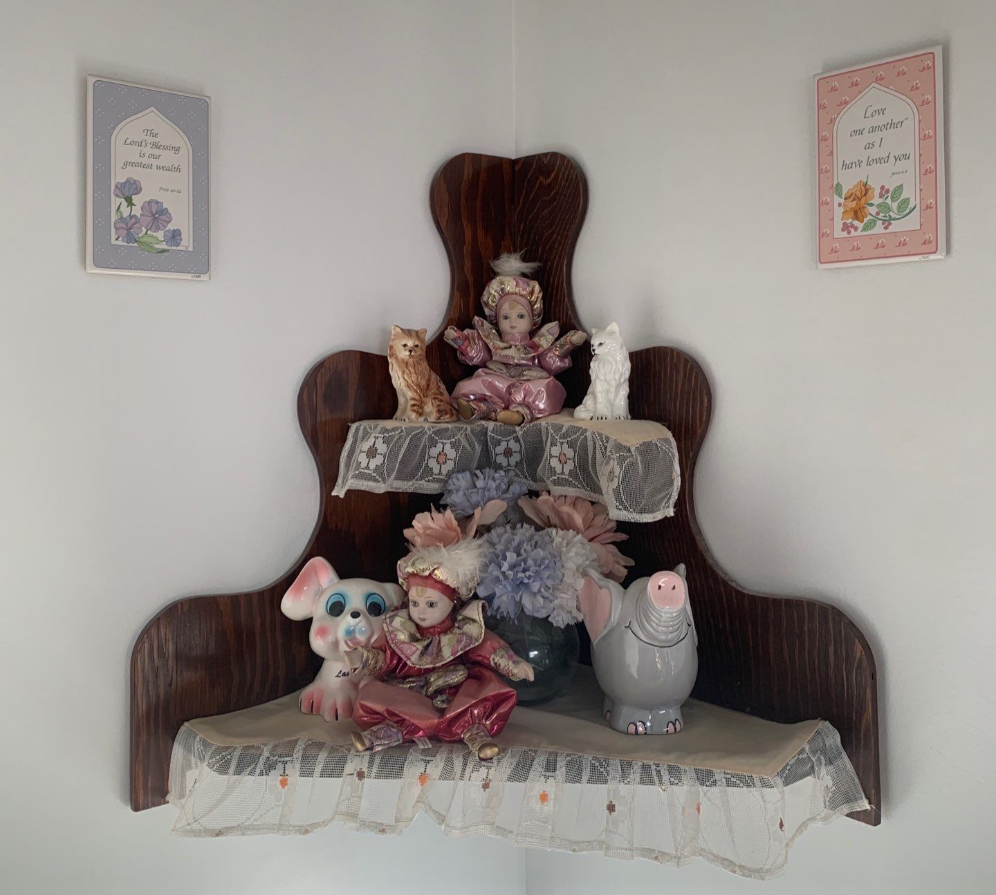 Corner Curio Shelf w/ Assorted Decorative Collectables Elephant Coin Bank Clowns & More