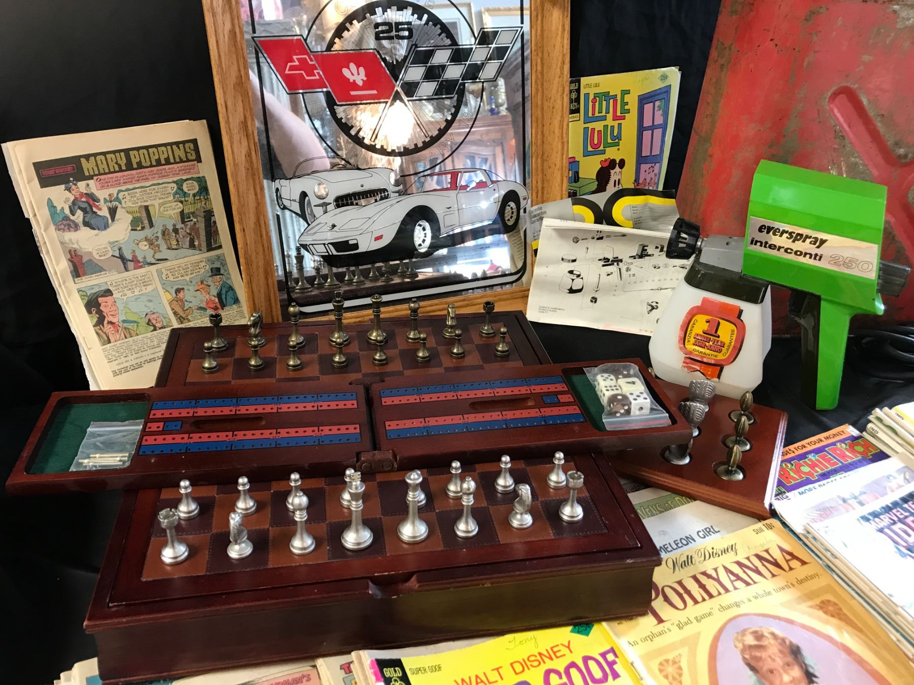 Corvette Mirror, Wood Backgammon/Tic Tac Toe/Cribbage Game, Everspray Interconti 250 Sprayer, Comics incl Pollyanna, Little Lulu, Disney, Ritchie Rich & Marvel
