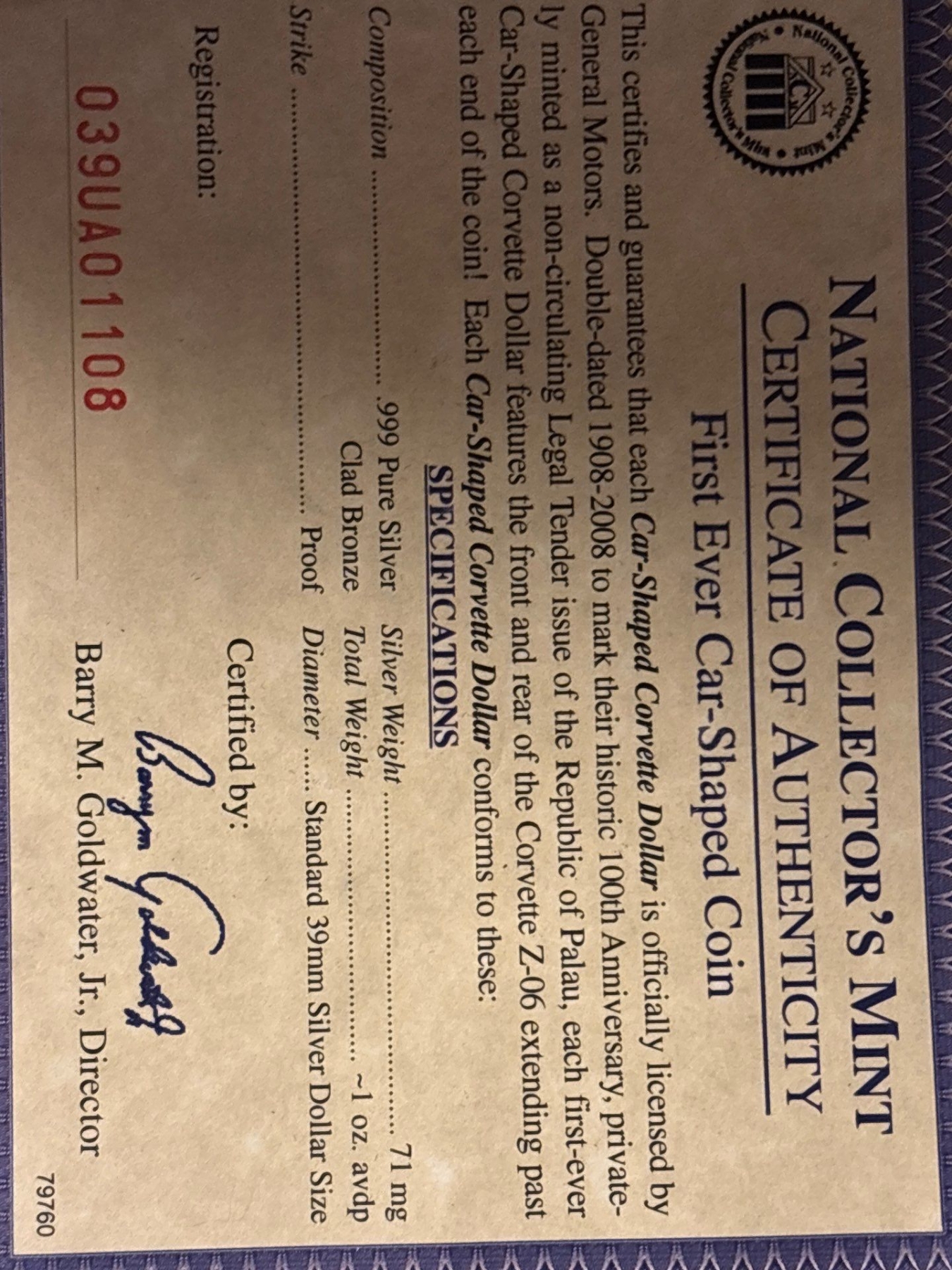 Corvette Silver Coin, One Dollar, Car-Shaped