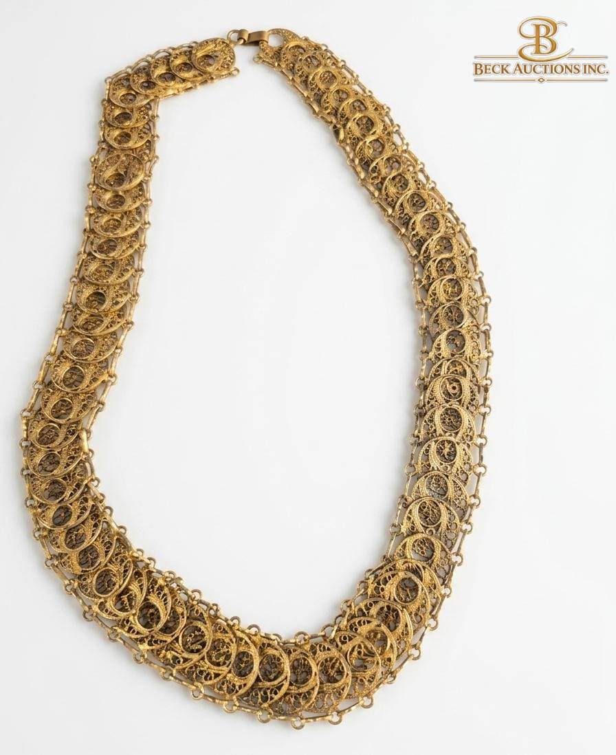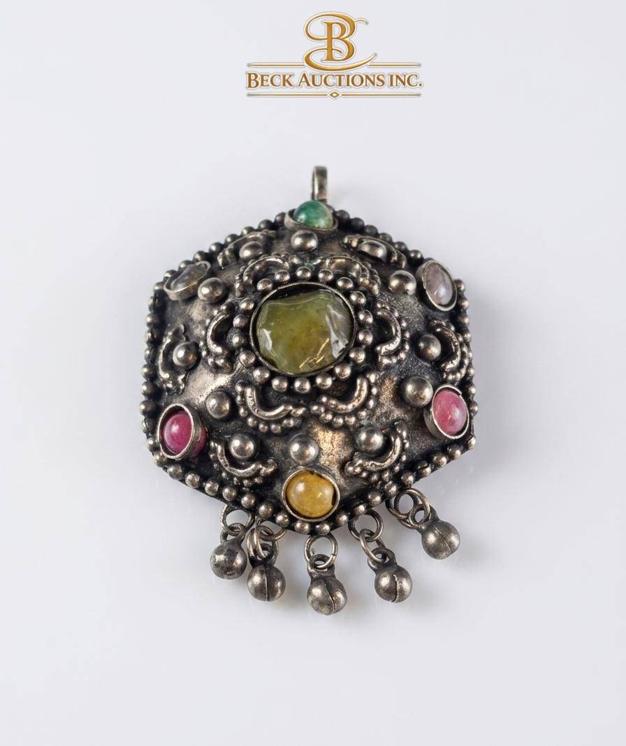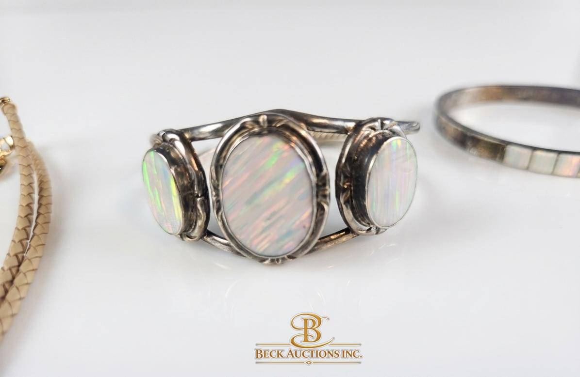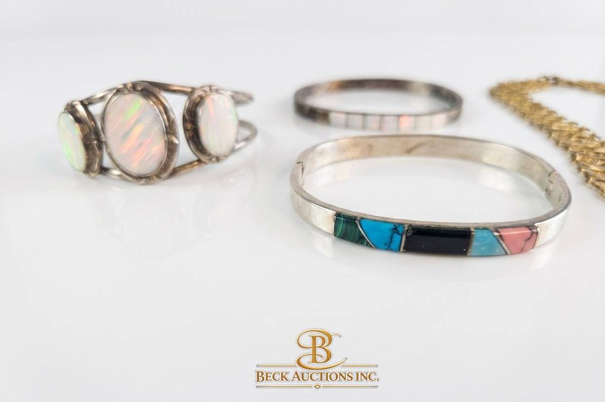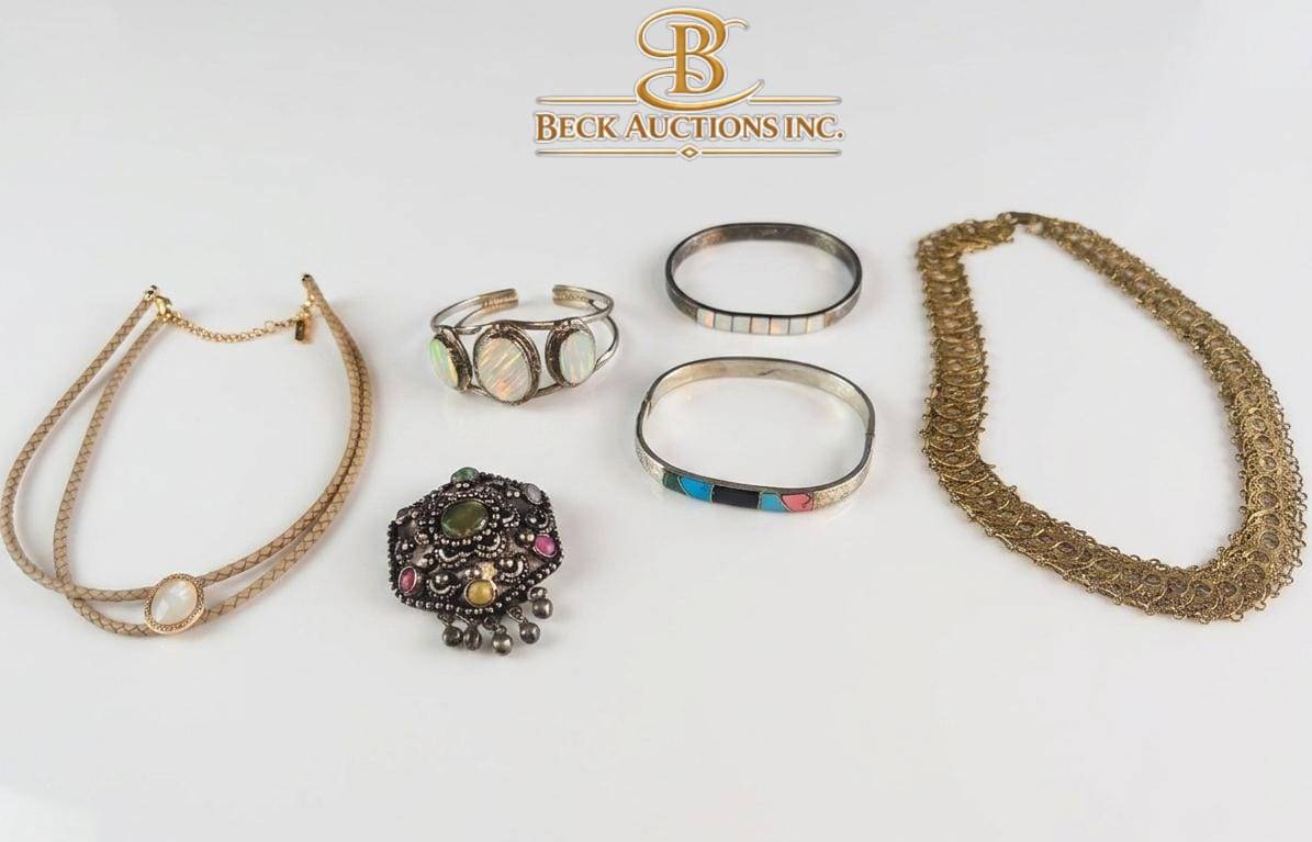 A diverse set of jewelry items featuring gold-tone and silver-tone pieces. Includes a braided necklace with oval pendant centerpiece, a filigree gold-tone necklace, a gemstone-studded brooch with dangling charms, a silver-tone bangle with colorful inlay, a mother-of-pearl cuff bracelet, and a silver-tone minimalist bangle. Ideal for collectors or enthusiasts. Measurements and further specifics not stated.