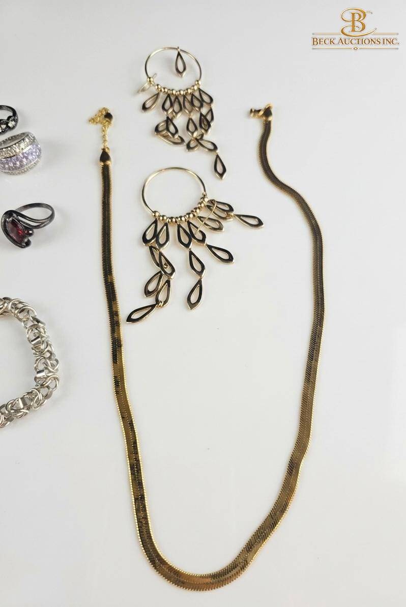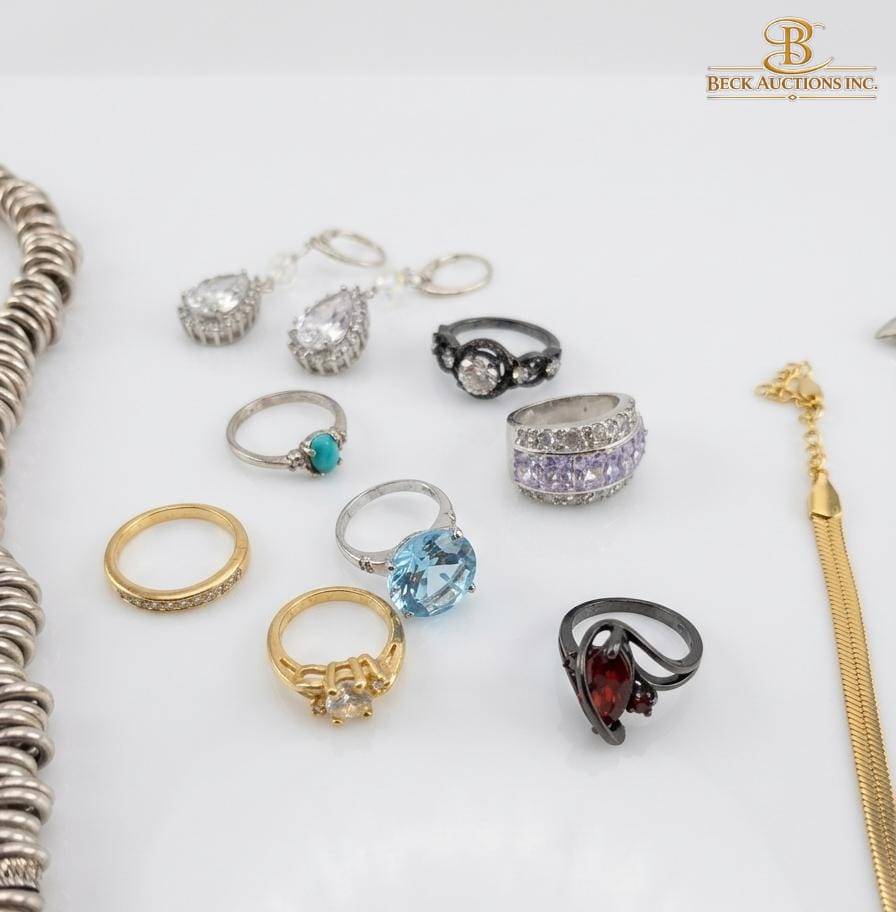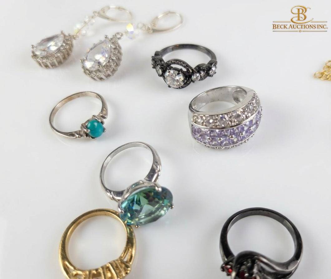 This diverse collection of jewelry features a mix of rings, necklaces, bracelets, and earrings designed to meet various style preferences. The rings include multiple stone encrusted designs in varying metals, with sizes suitable for a range of wearers. The collection highlights necklaces ranging from approximately 16 to 20 inches in length, alongside items such as chandelier-style earrings and bracelets. This assortment is ideal for those seeking variety and charm in their jewelry collection, including both everyday and statement pieces.