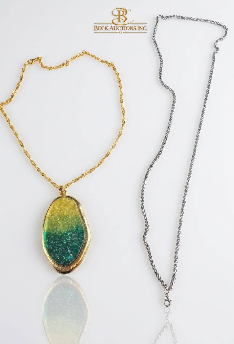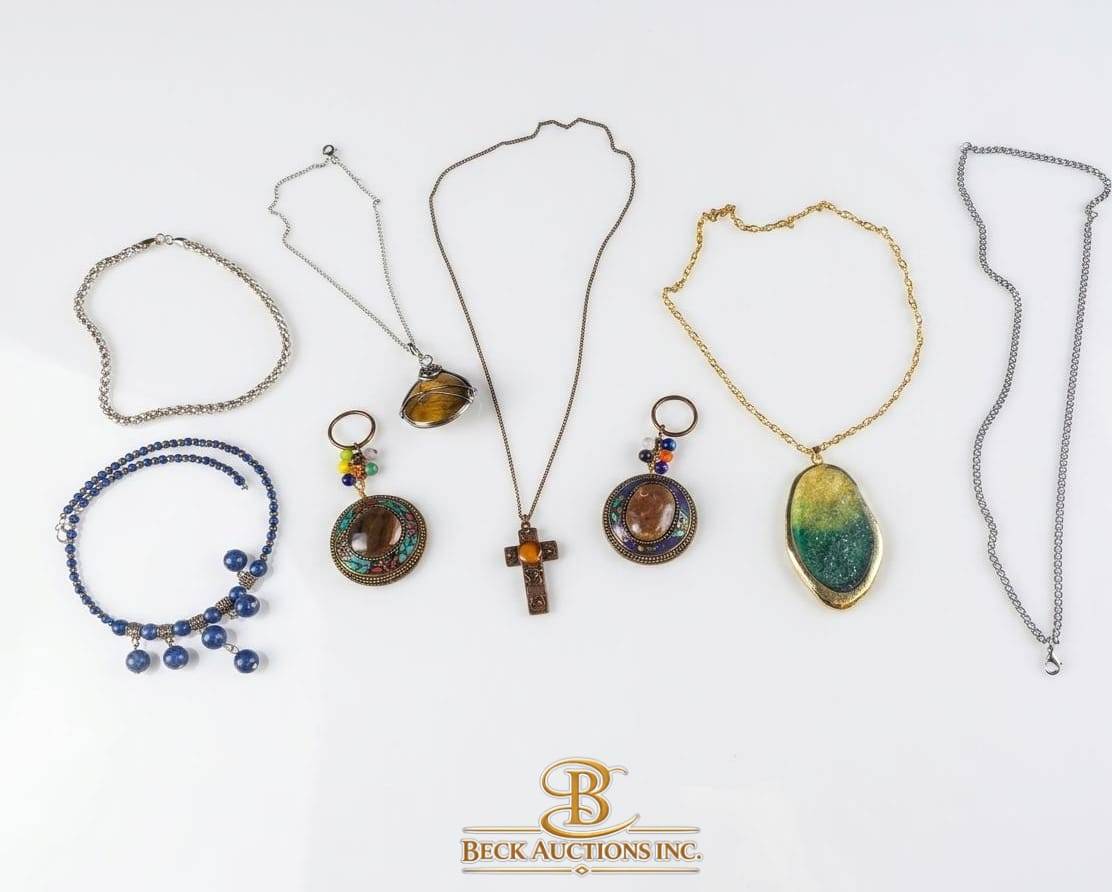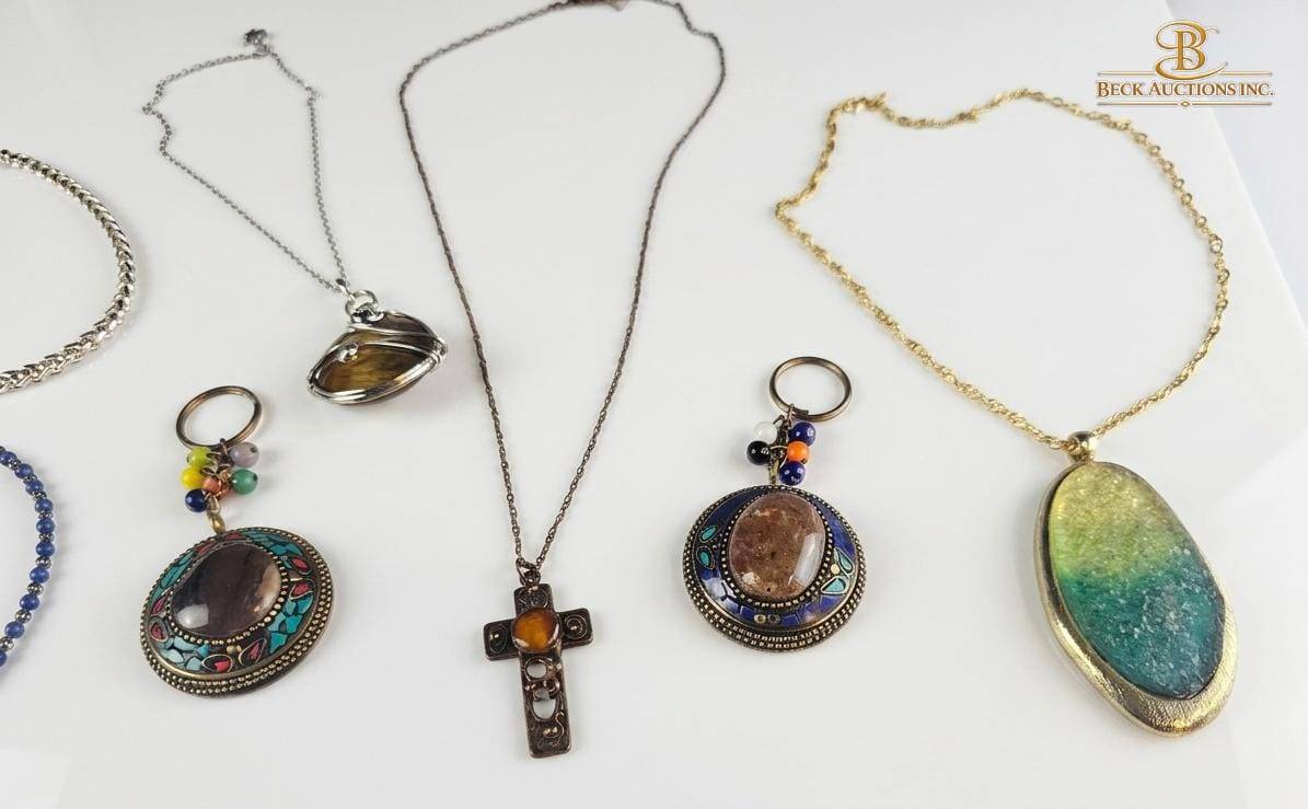 A diverse assortment of costume jewelry featuring necklaces and keychains. Included are chains with pendants in various designs, such as a green-gold oval, decorative cross, and colorful beaded accents. Additional elements include keychains with unique gemstone-like ornaments. Pieces come in different chain lengths and pendant styles, offering variety for collectors or fashion enthusiasts. Dimensions for most pendants range from small to medium.