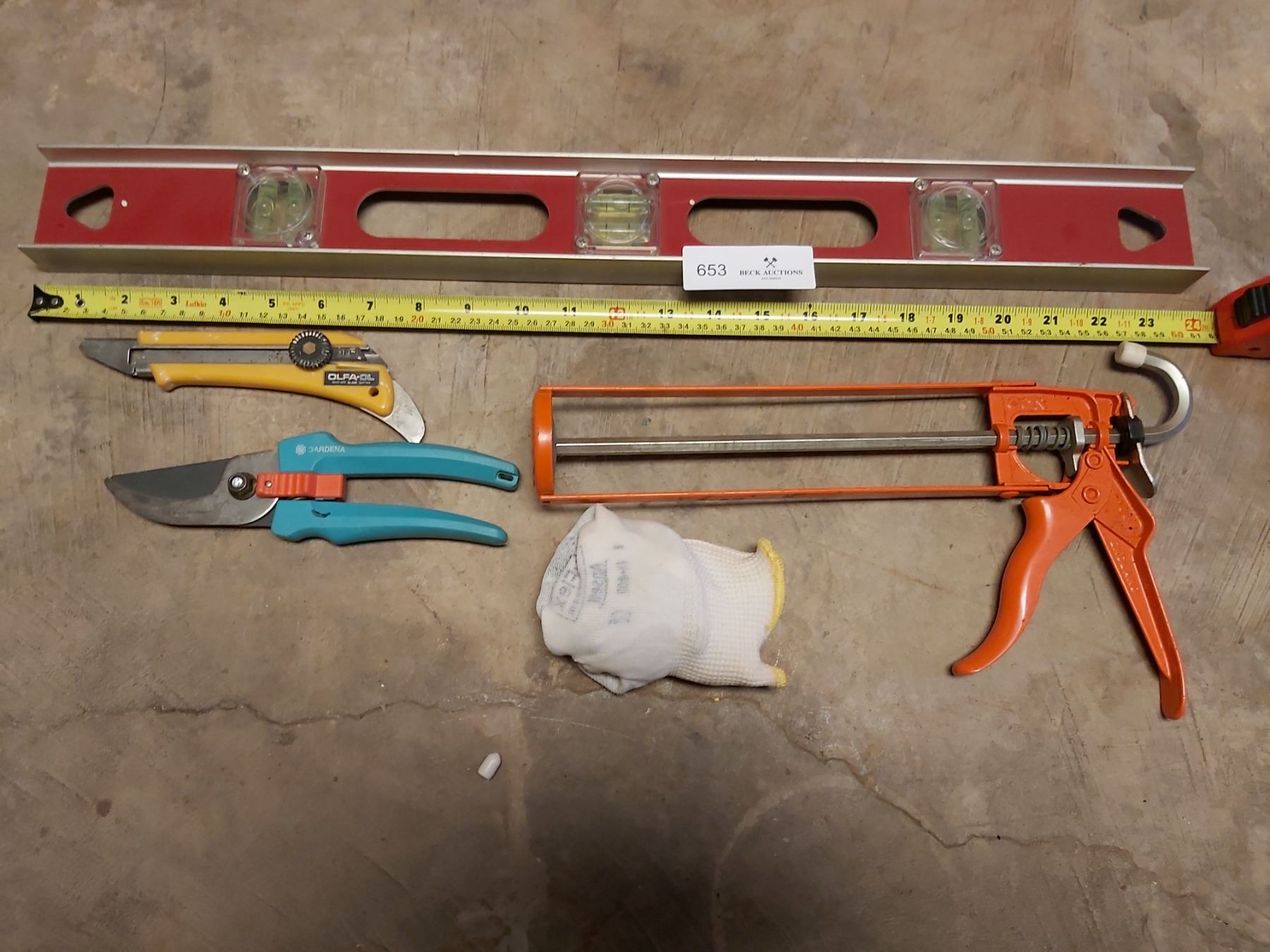 Cox Calking Gun, Work Gloves, Measuring tape, Olfa Knife, Level & Gardena Shears