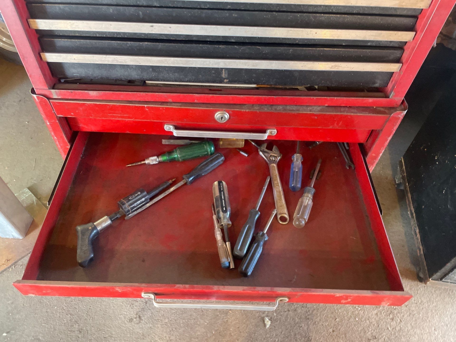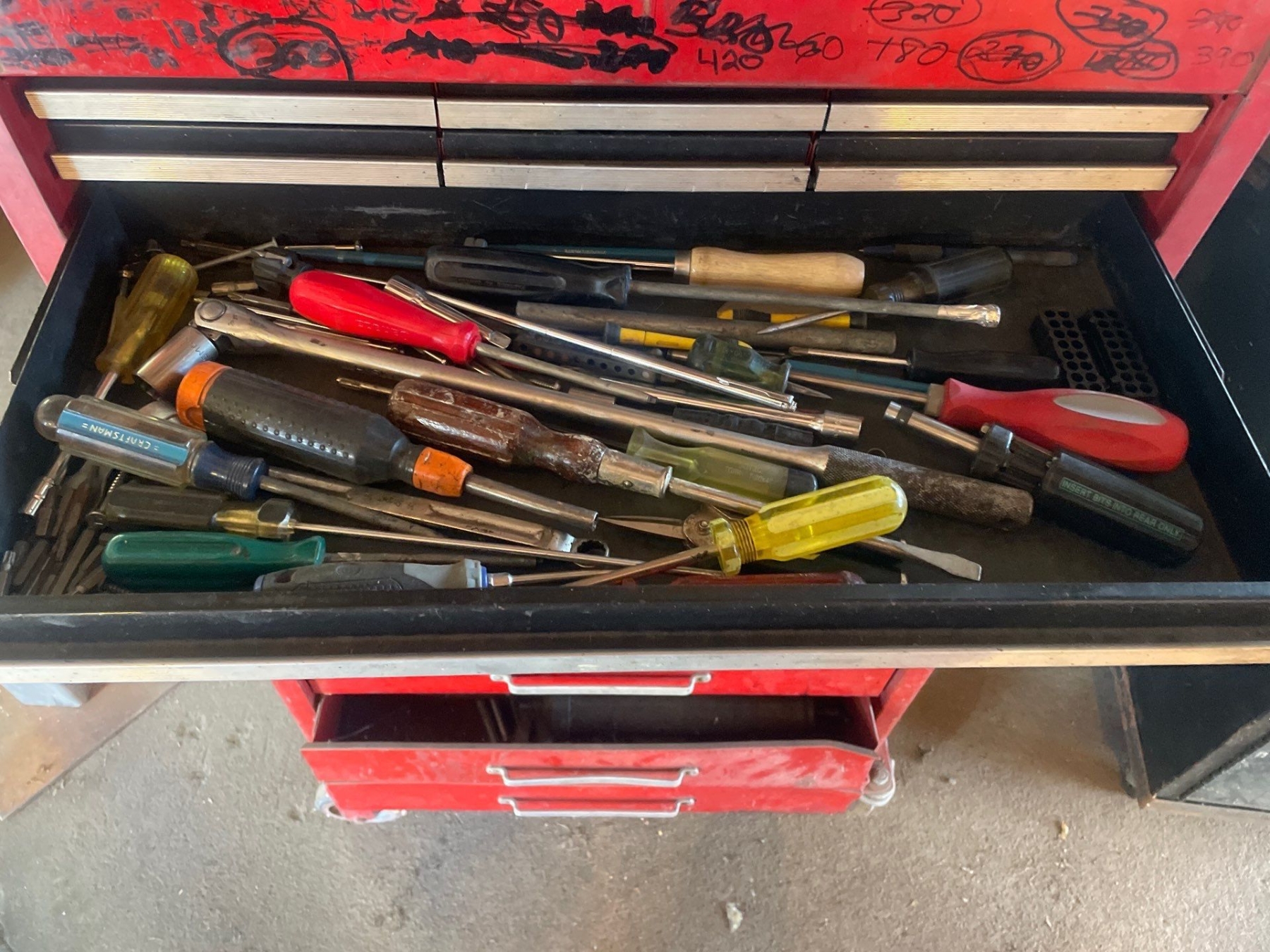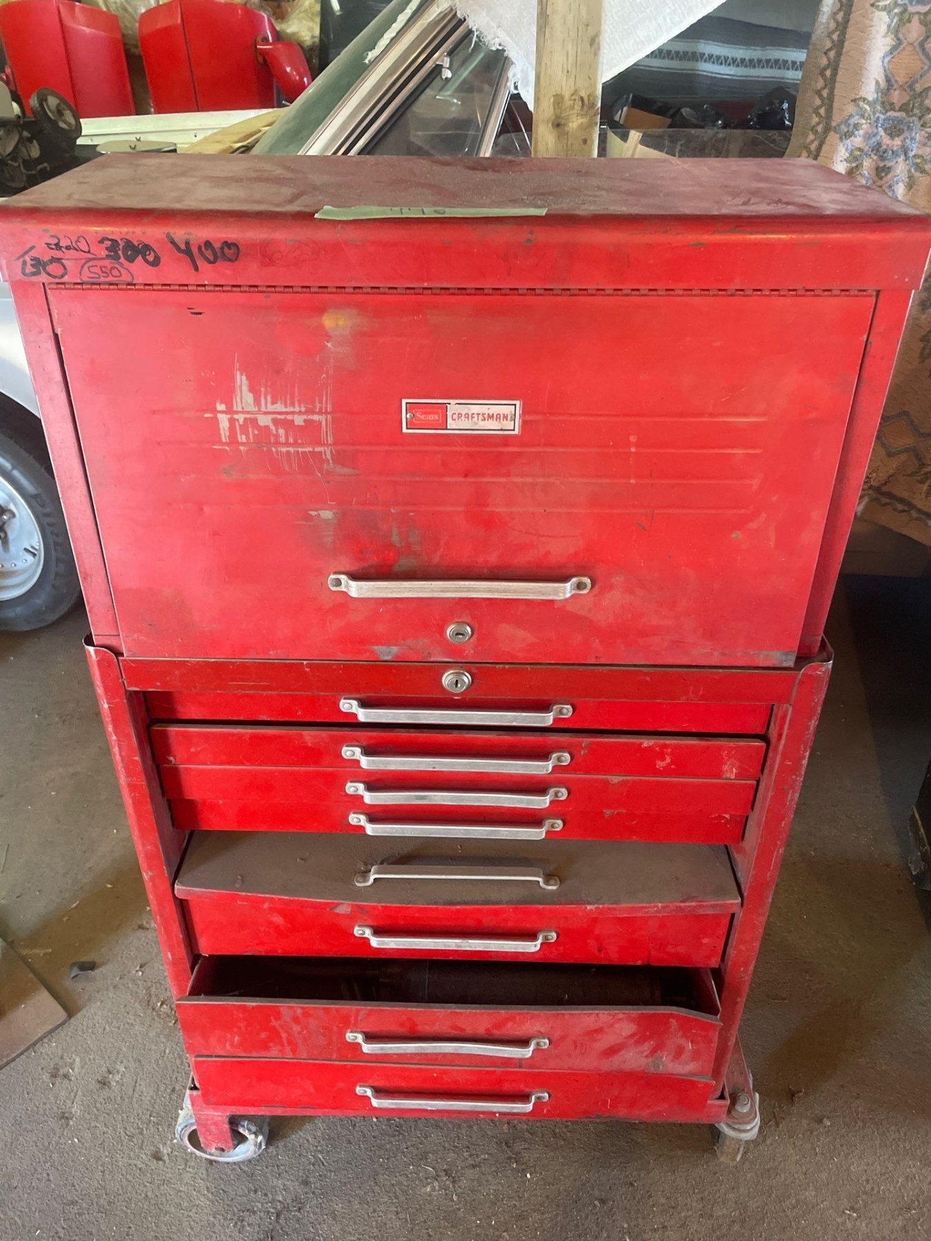 Craftsman Multi Drawer Toolbox With Tools Included 50" High x 27" Wide x 18" Depth. Bottom 2 drawers sticky.