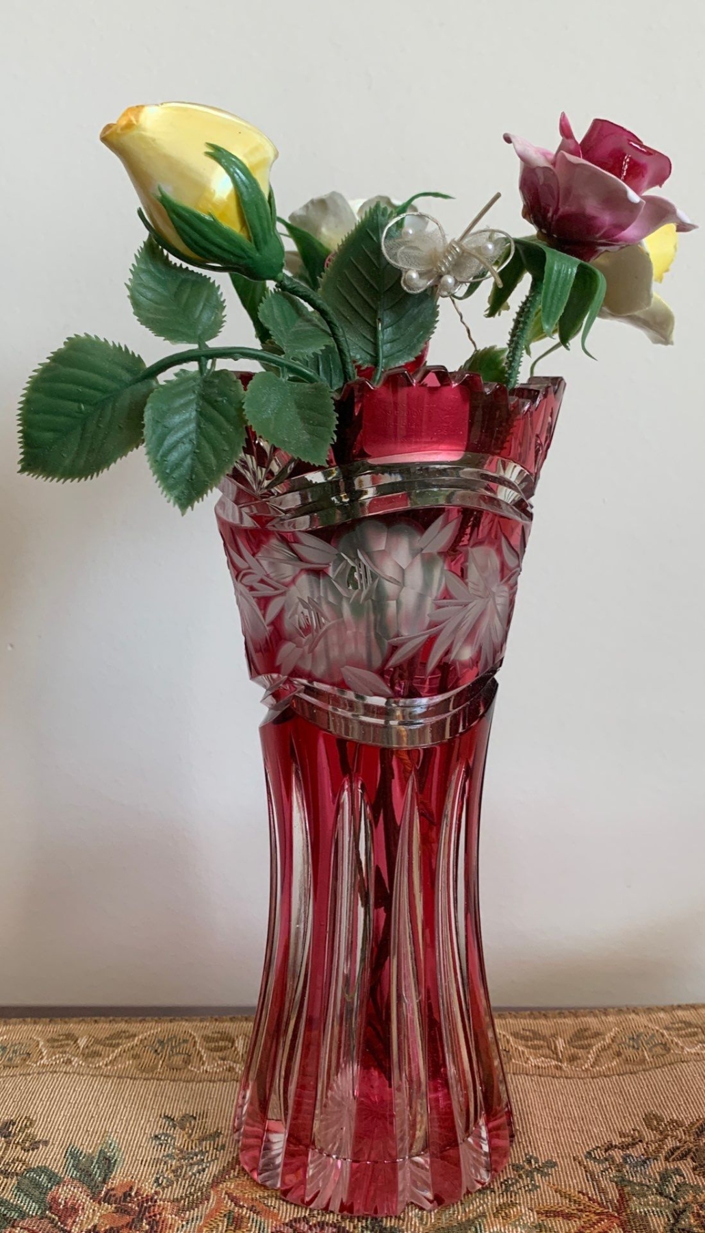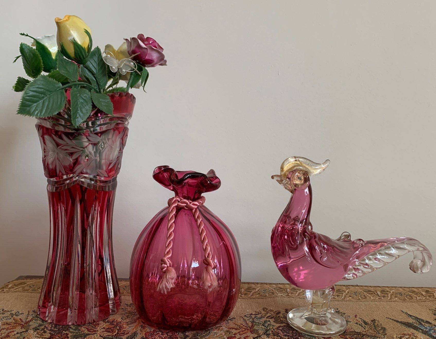 Cranberry Decorative Glassware w/ Fine Bone China Flowers 8T