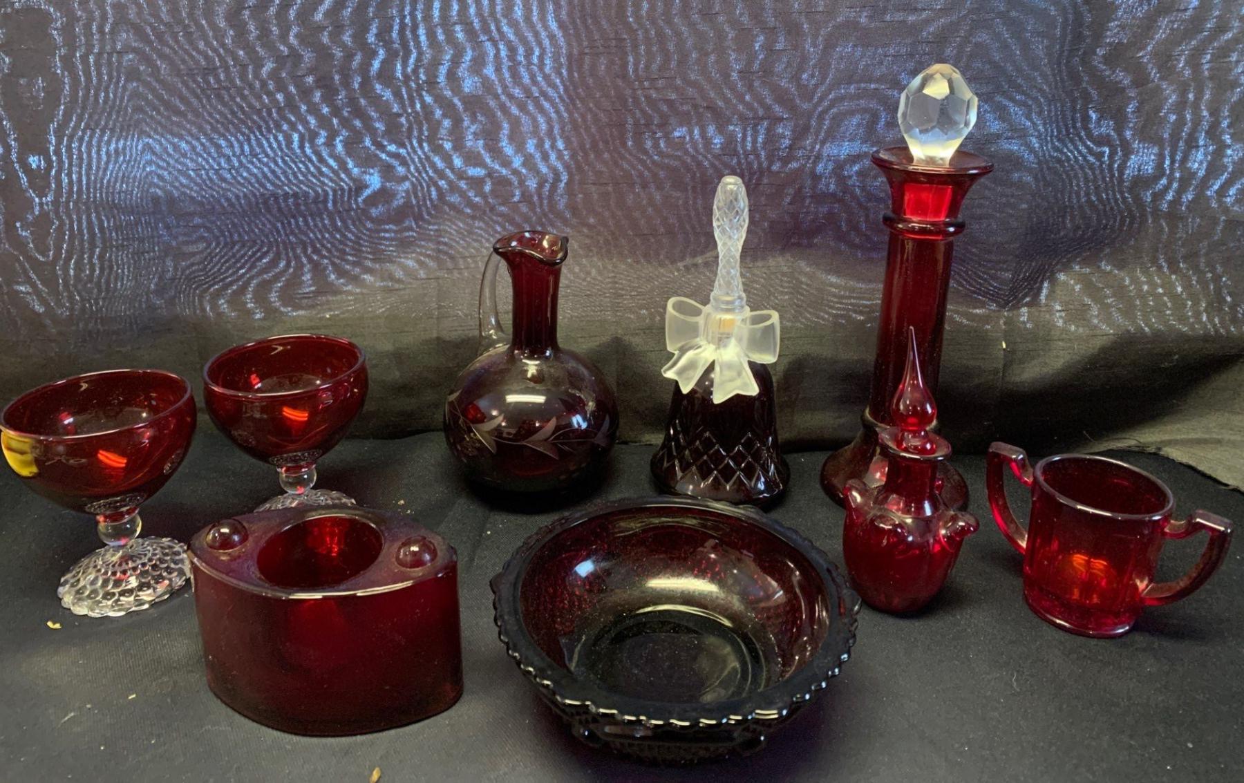 Cranberry Glass: Ruby Red Potion Bottles w/ Cape Cod Dessert Bowl & More