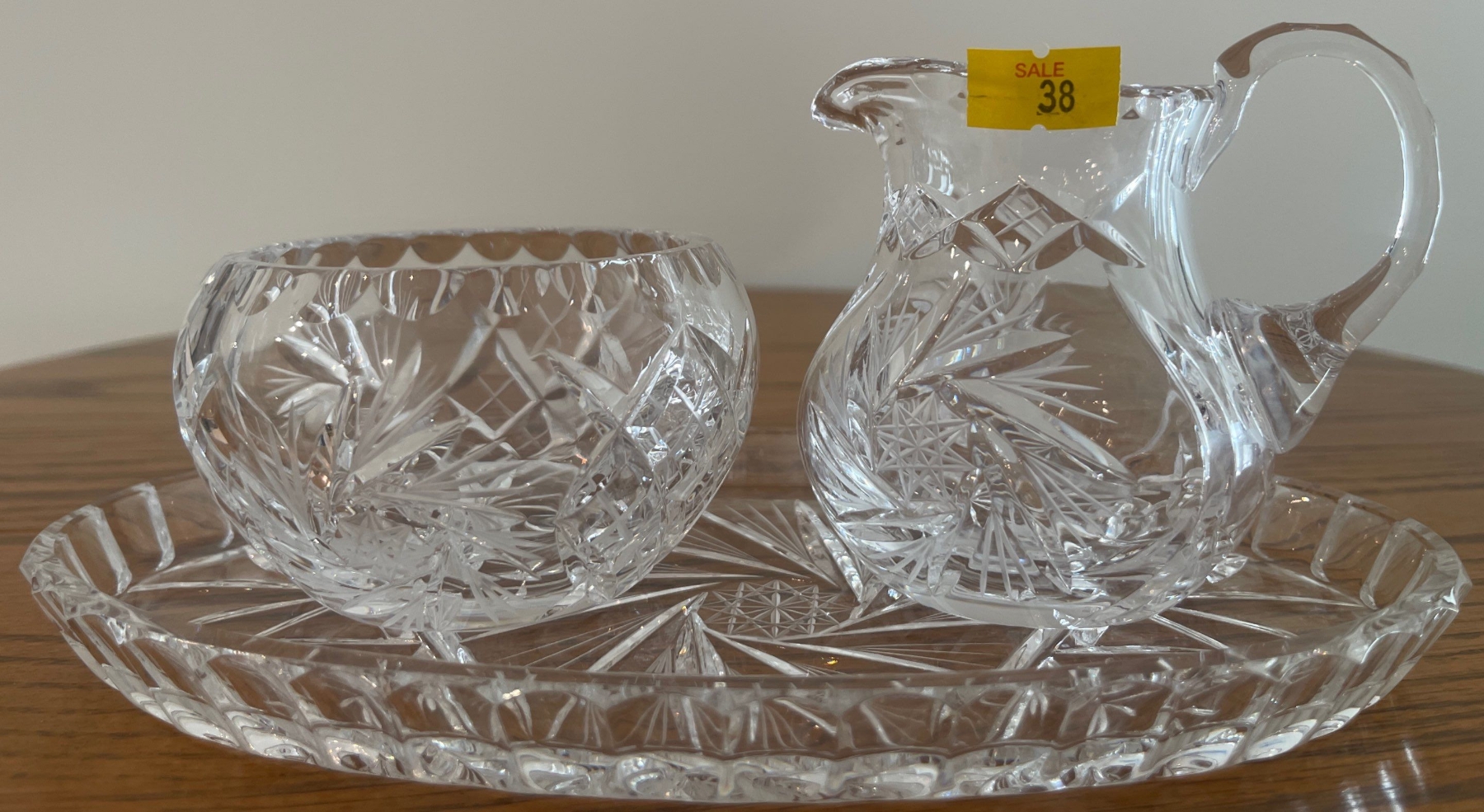Crystal Bowl, Cream N Sugar Cups & Tray, w/ Large Vase