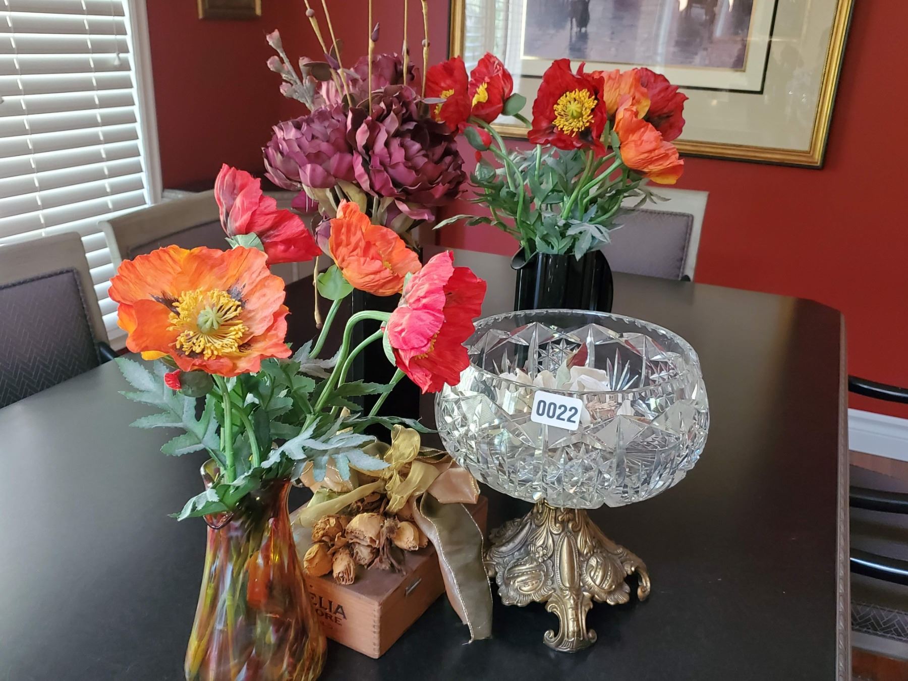 Lot features: Crystal bowl with brass base, 3 Vases with silk flowers, cigar box and dried flower corsage. Very good condition.