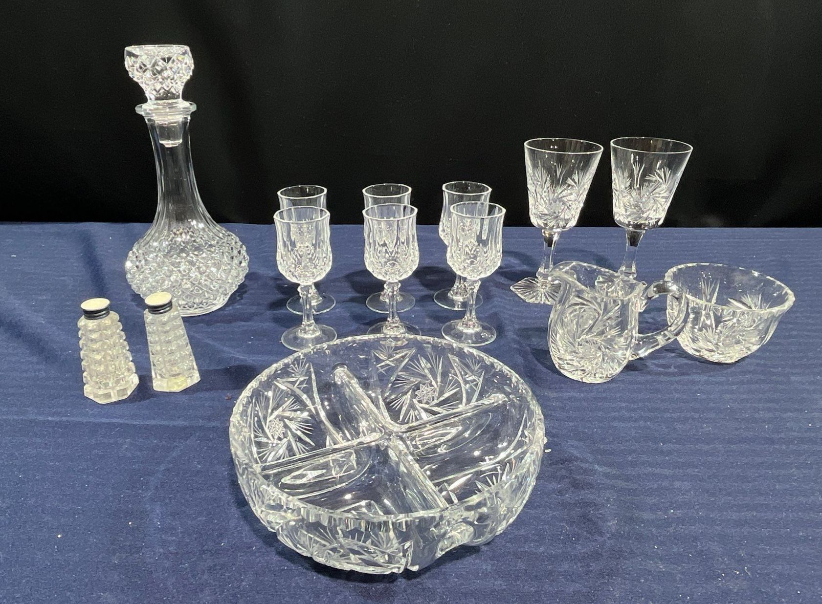 Crystal Decanter, Salt & Pepper, Stemware, Cream and Sugar, and Serving Dish