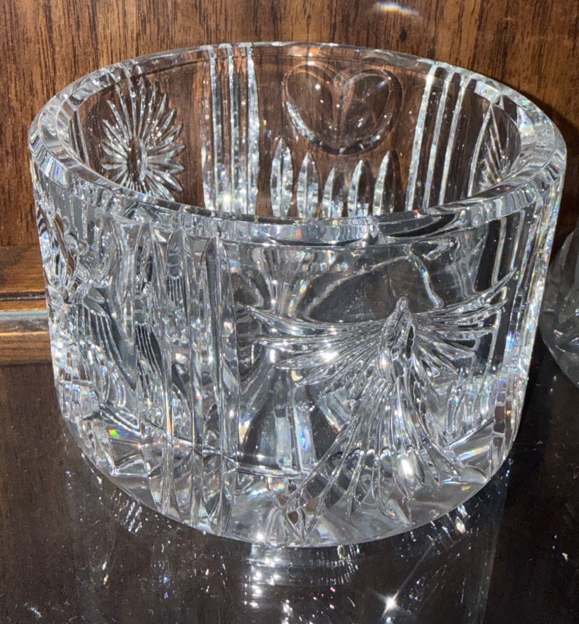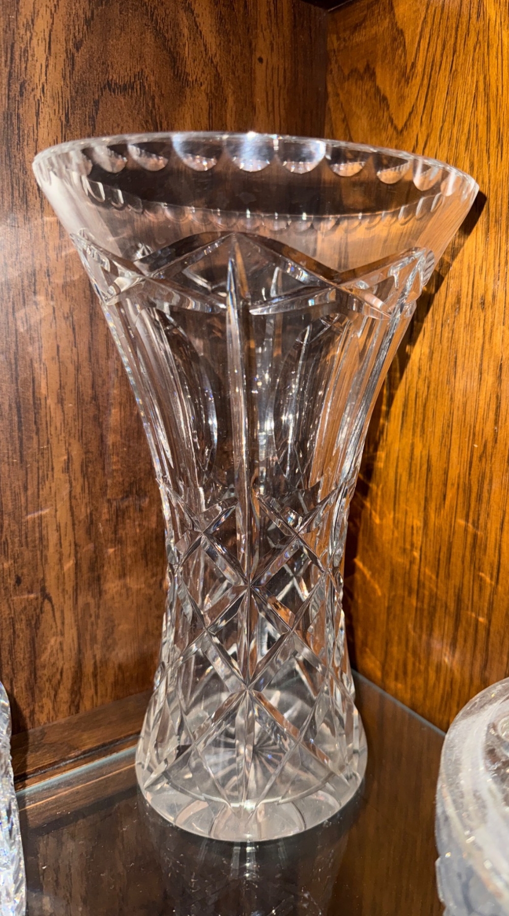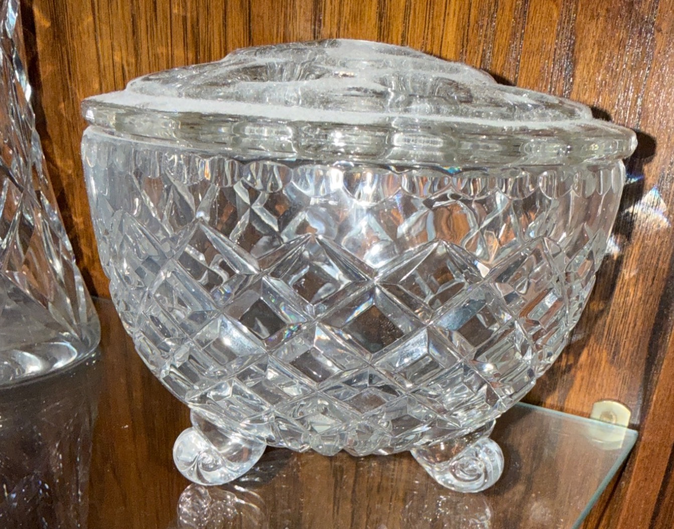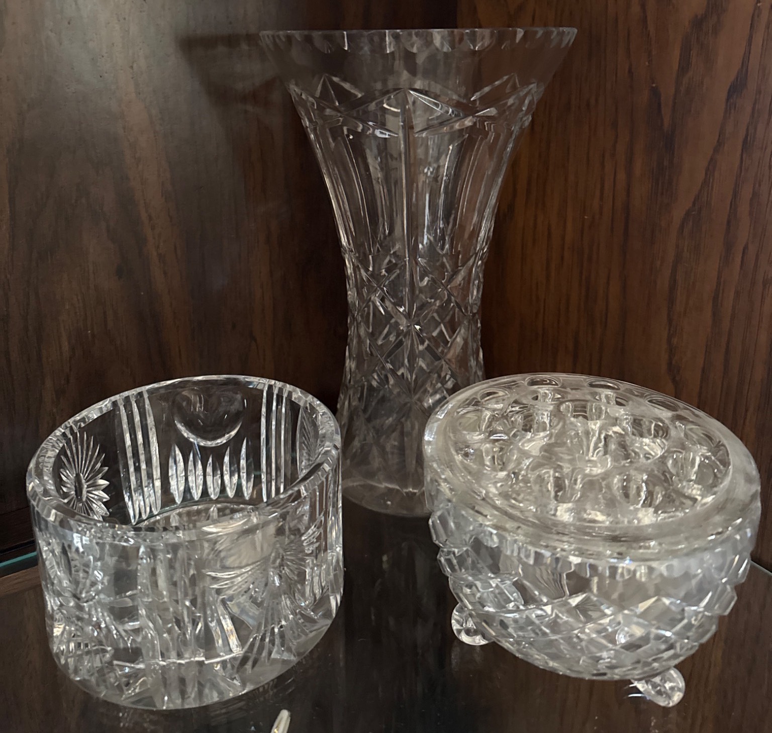 Three crystal decorative pieces including a tall vase, a round bowl, and a lidded trinket dish. The vase measures approximately 10 inches tall with elegant cut designs. The open bowl is 4 inches tall and 6 inches wide, featuring intricate patterns. The covered dish, resting on three small feet, measures 5 inches in diameter and 6 inches high. All pieces are in excellent condition, ideal for display or use.