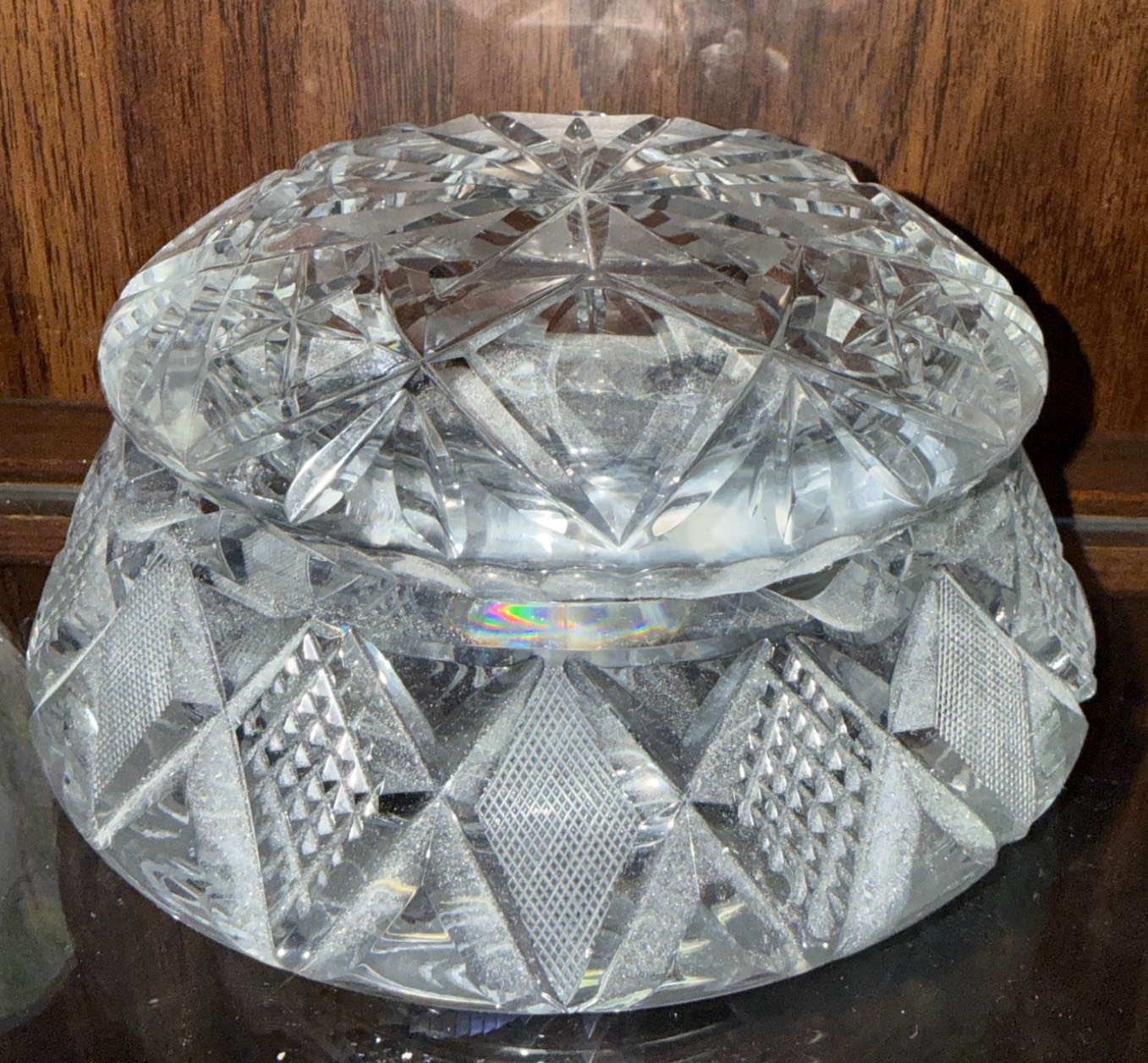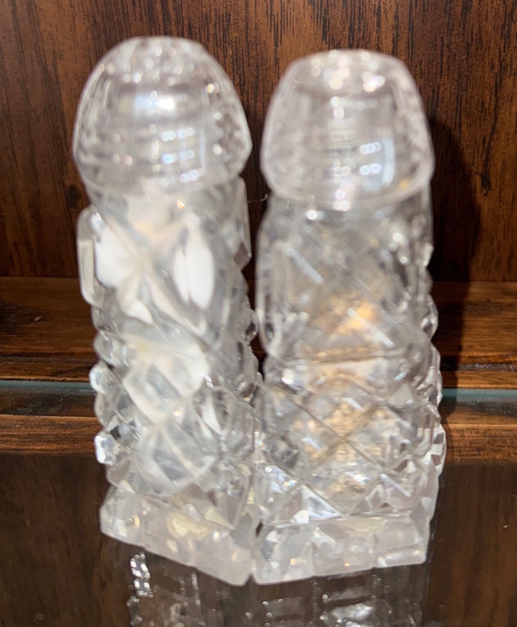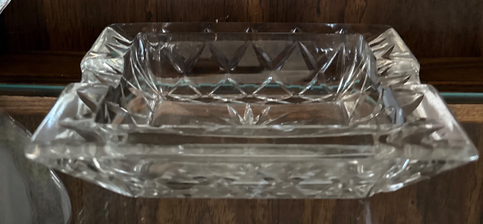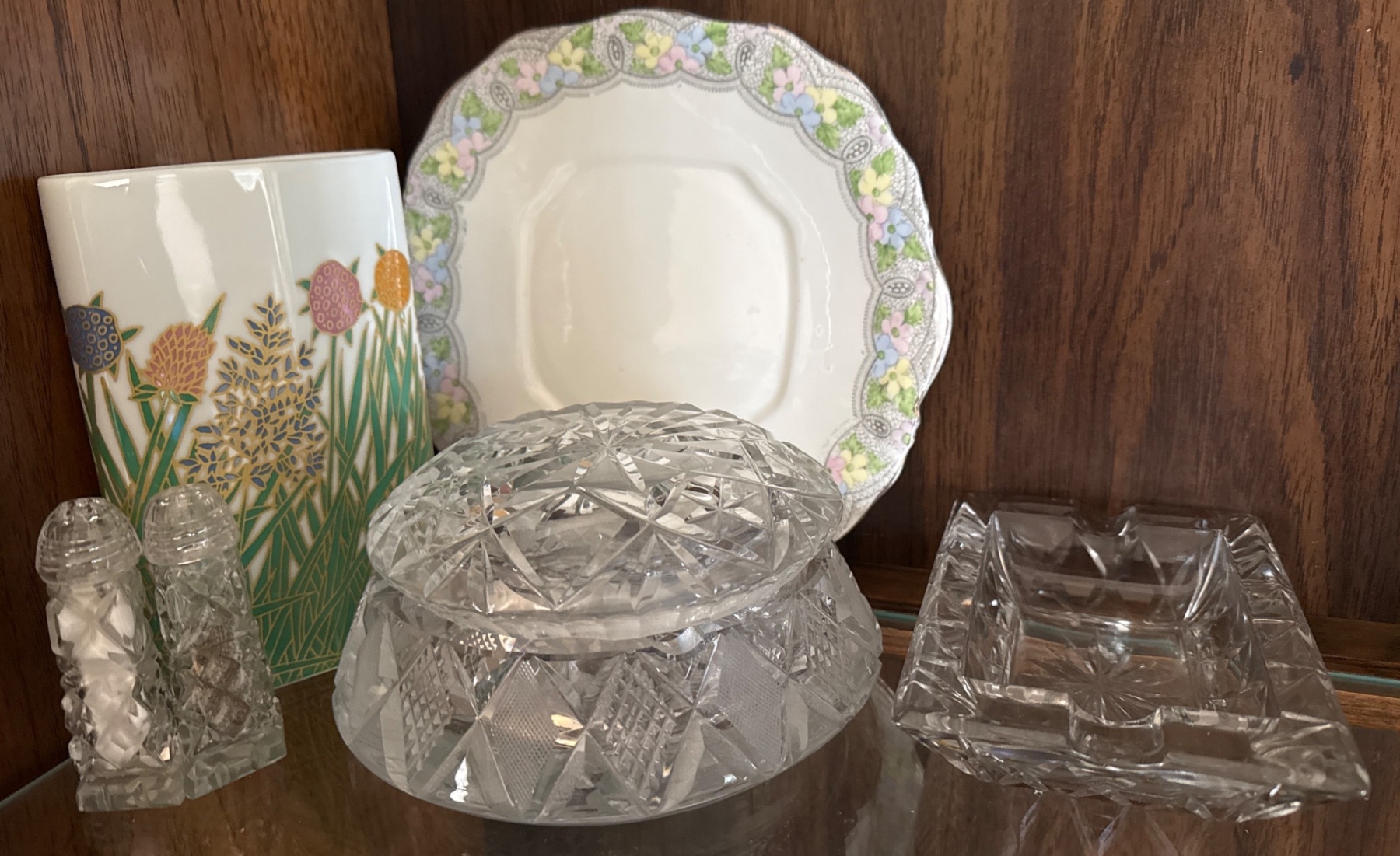A beautifully curated set includes a pair of cut crystal salt and pepper shakers, a diamond-patterned lidded crystal dish, a rectangular cut crystal tray, and a porcelain plate with floral detailing accompanied by a hexagonal vase featuring a floral motif. The porcelain vase is labeled 'Rosenthal studio-line Germany.' Dimensions and condition of items are not specified, making this a versatile addition to any collection.