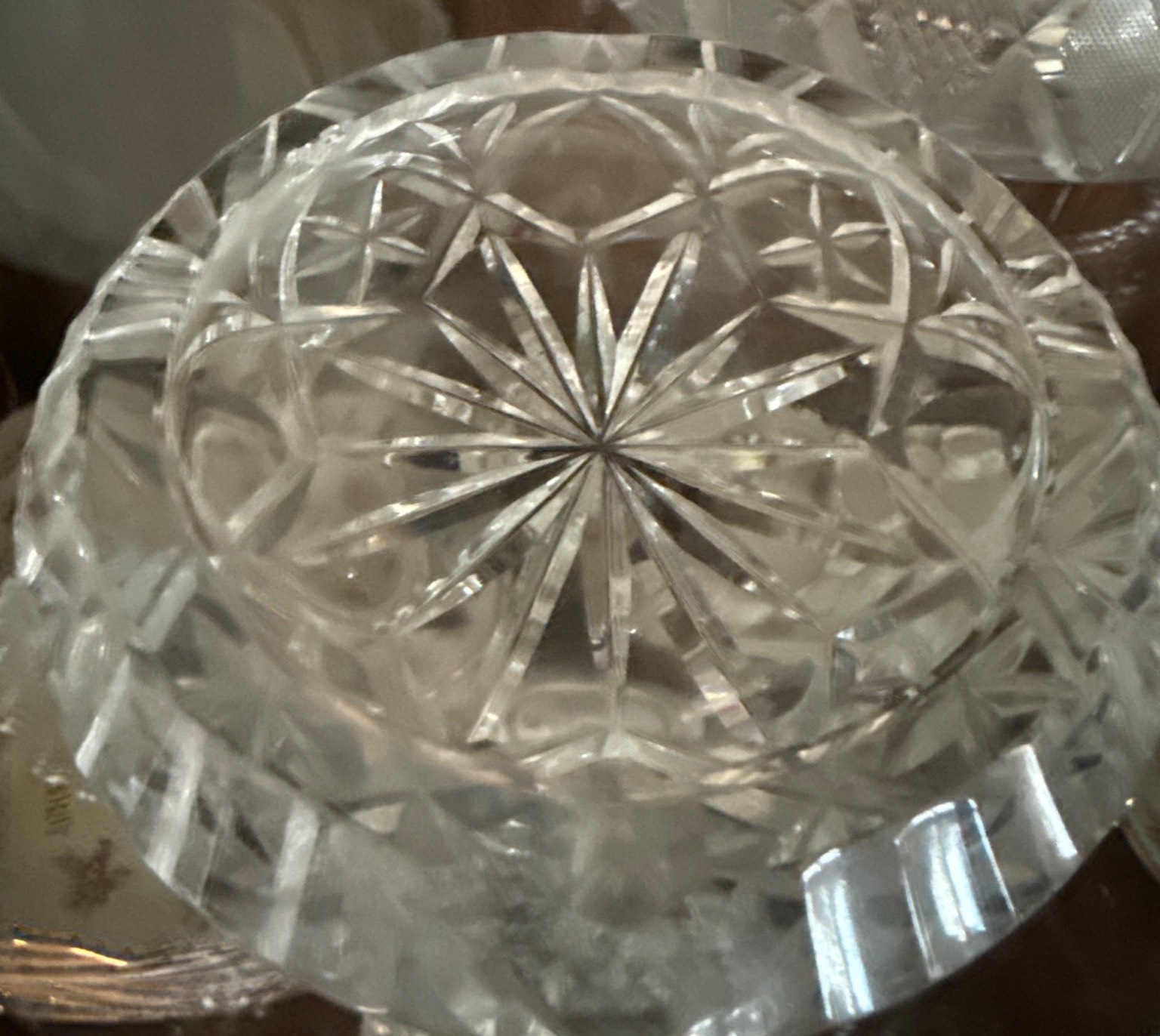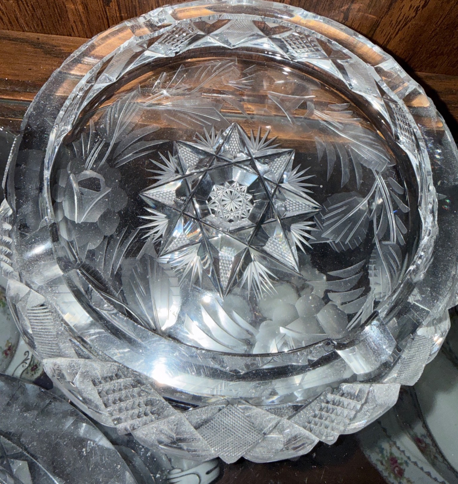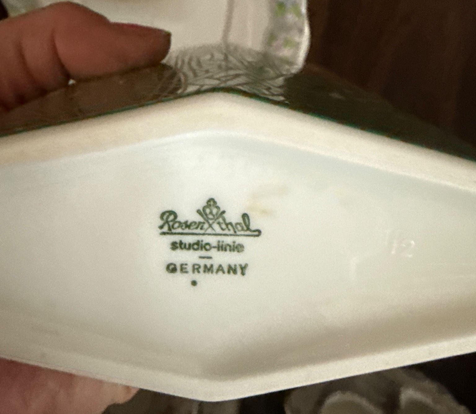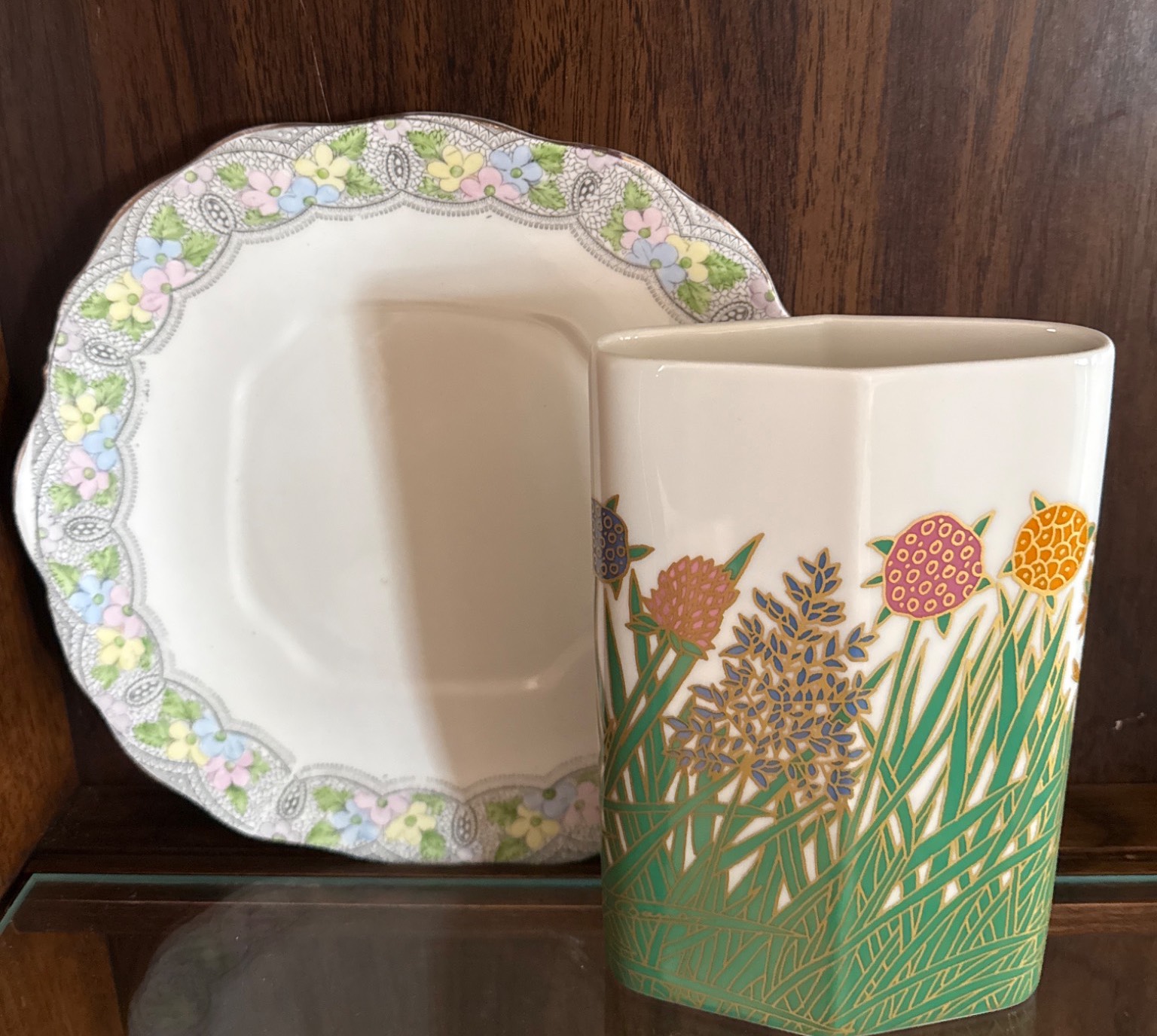 A beautifully curated set includes a pair of cut crystal salt and pepper shakers, a diamond-patterned lidded crystal dish, a rectangular cut crystal tray, and a porcelain plate with floral detailing accompanied by a hexagonal vase featuring a floral motif. The porcelain vase is labeled 'Rosenthal studio-line Germany.' Dimensions and condition of items are not specified, making this a versatile addition to any collection.