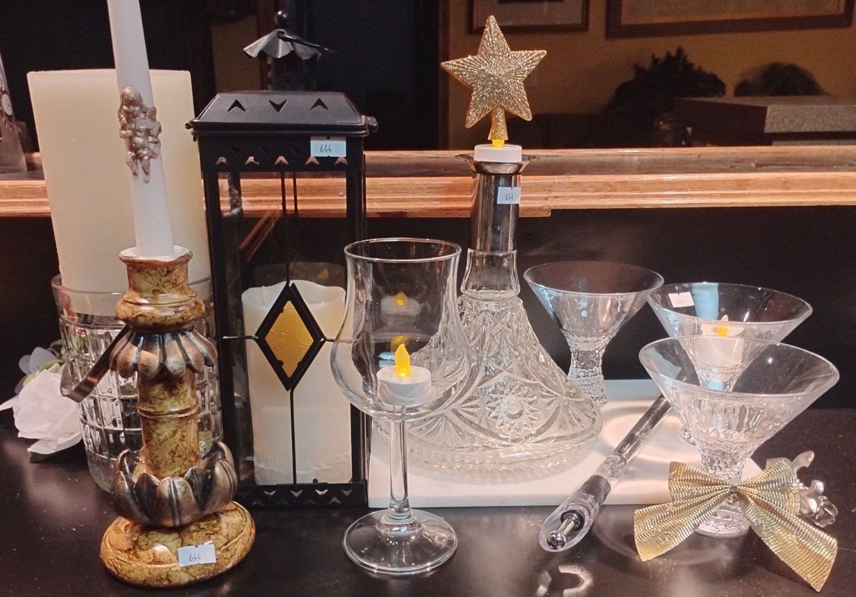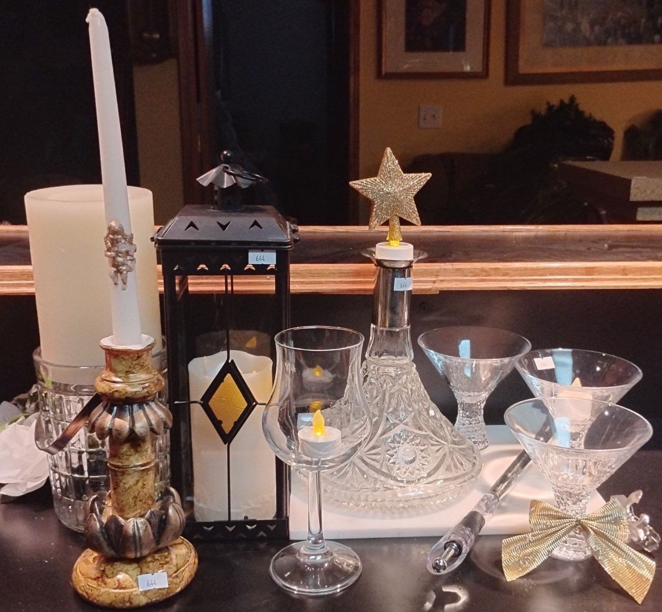 Crystal Martini Glasses & Decanter w/ Marble Cheese Board Candles & More