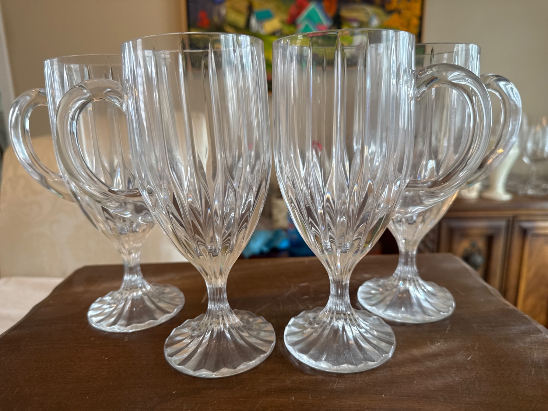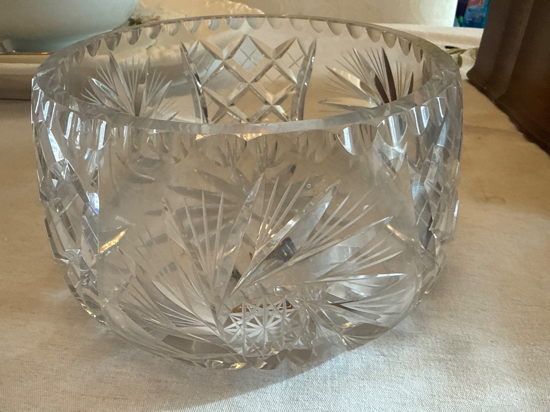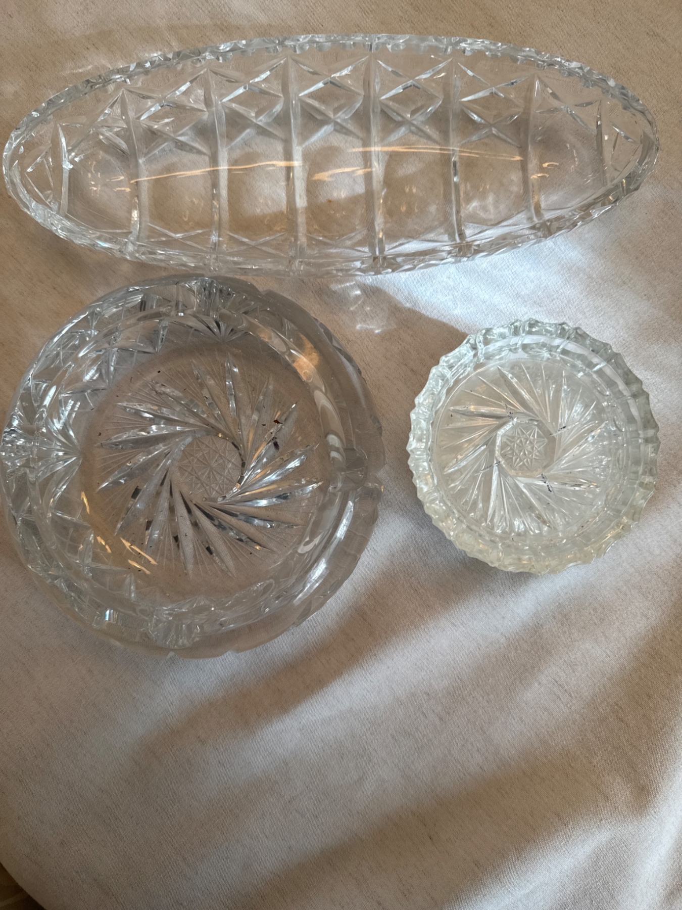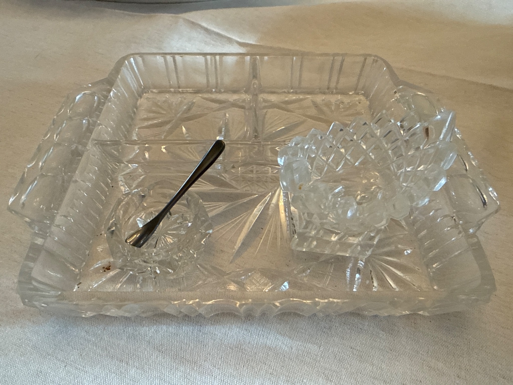 An elegant crystal serving set with multiple pieces, including five heavy cups with handles, a large serving bowl, an oval tray, round dishes, a sectioned serving tray with handles, and more. Designed with intricate patterns that catch the light beautifully. Perfect for entertaining or display. Includes various sizes of pieces, though specific dimensions are not provided.