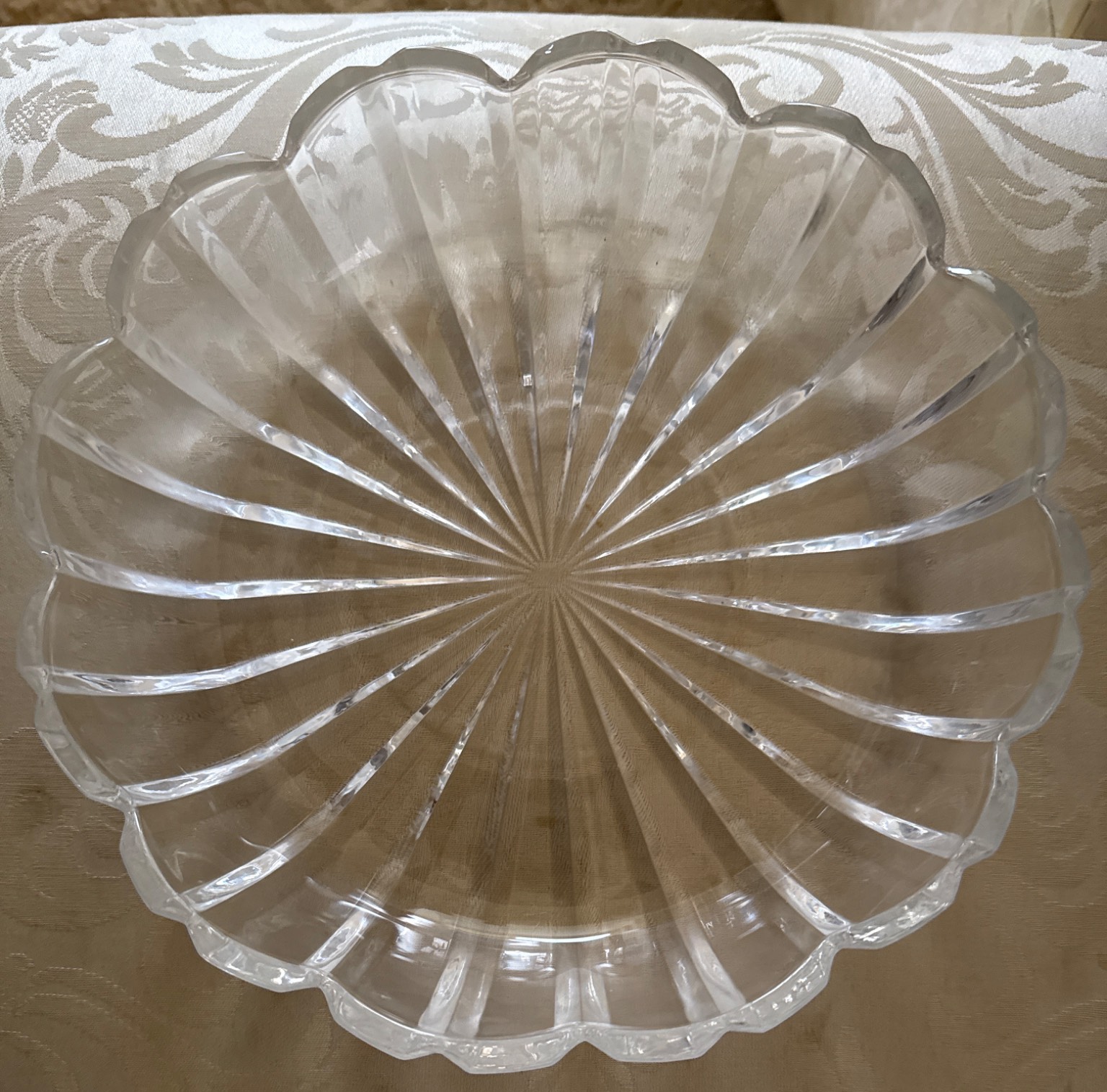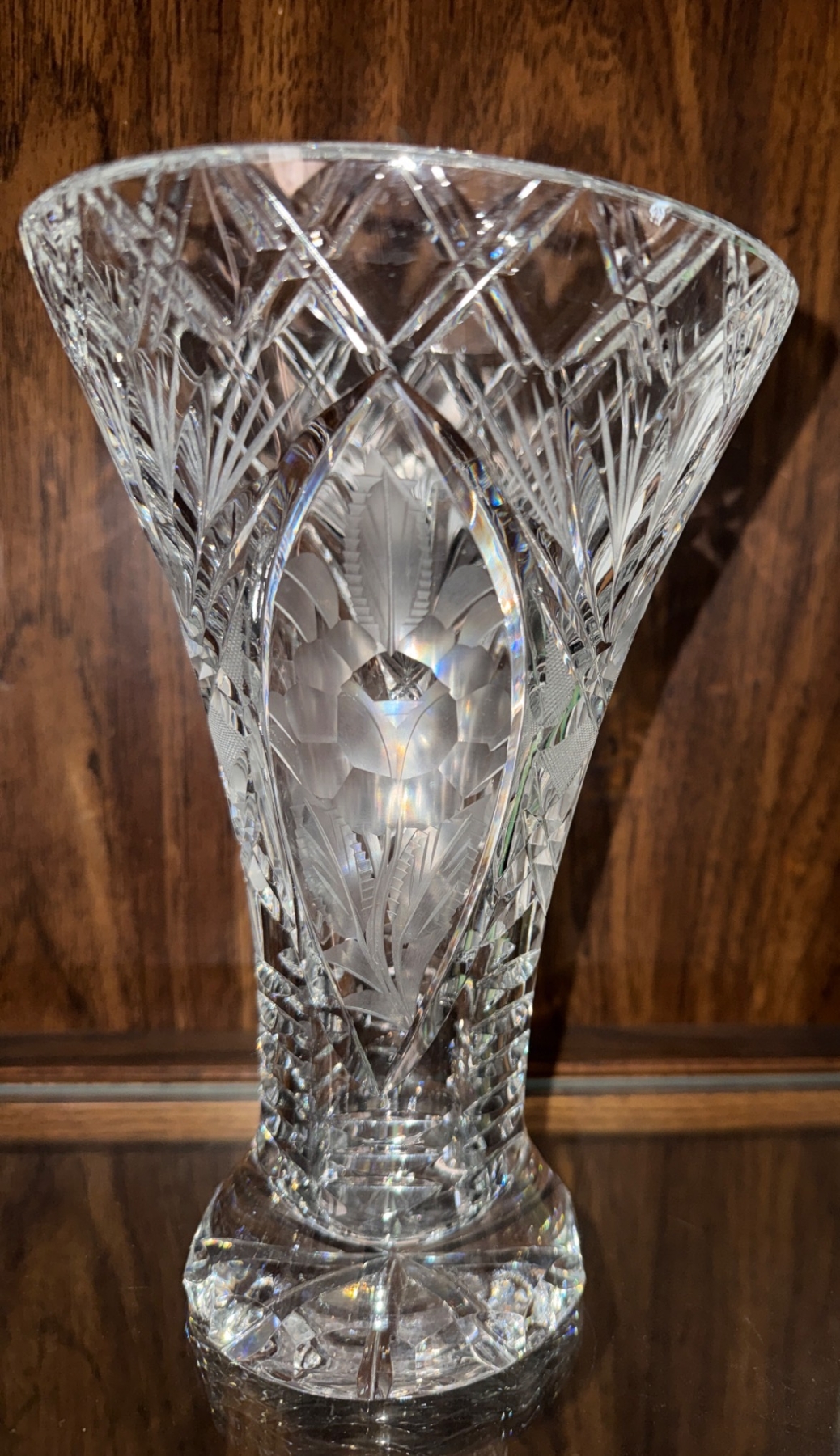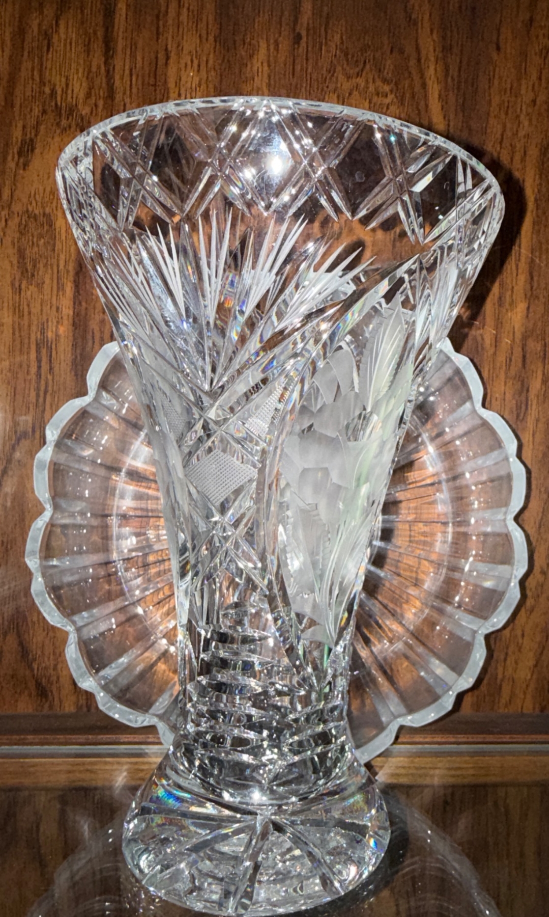 Elegant crystal vase featuring a detailed cut design, paired with a round crystal plate with radial patterns. The vase stands approximately 9 inches tall, while the plate measures about 10 inches in diameter. Both pieces exhibit clear, reflective quality, making them an excellent display set. Ideal for adding timeless sophistication to any decor.