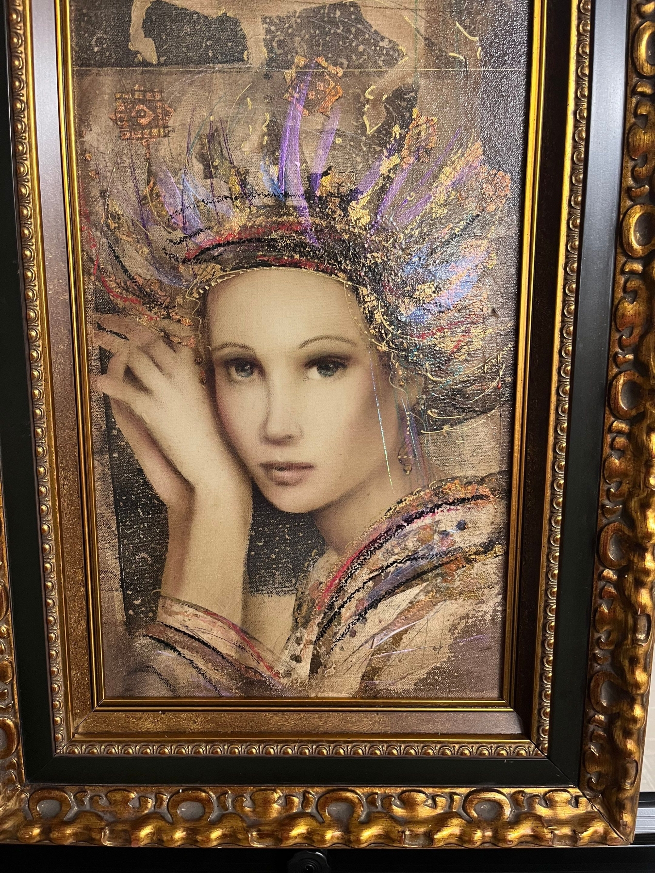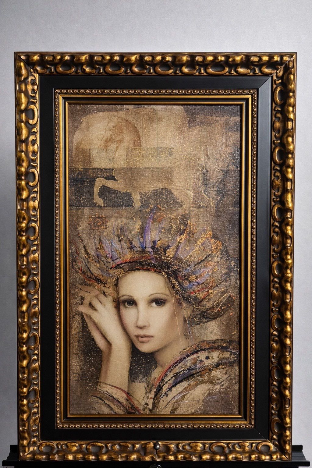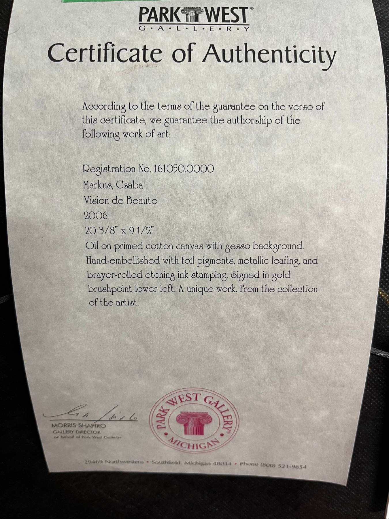 Csaba Markus, Original Vision of beauty 2006 Oil on Canvas with gesso background hand - embellished with foil pigments , metallic leafing and brayer rolled etching ink stamping , Signed in Gold brush point . A very unique work from the collection of the artist appraised in 2008 for $18,900 USD