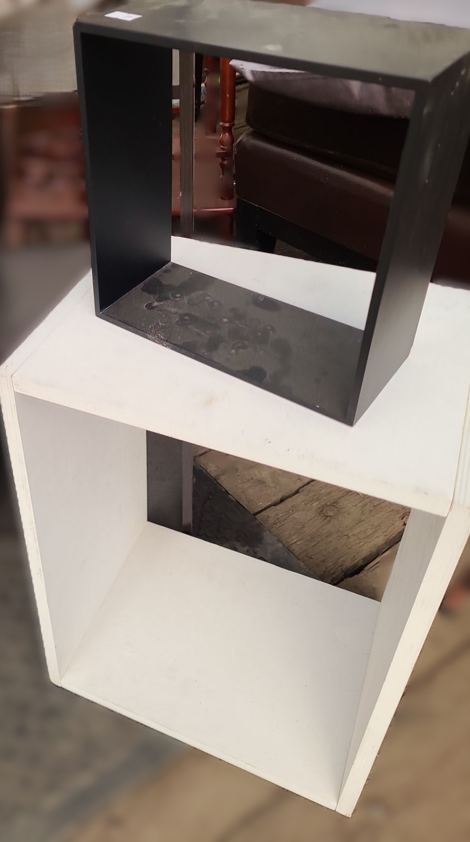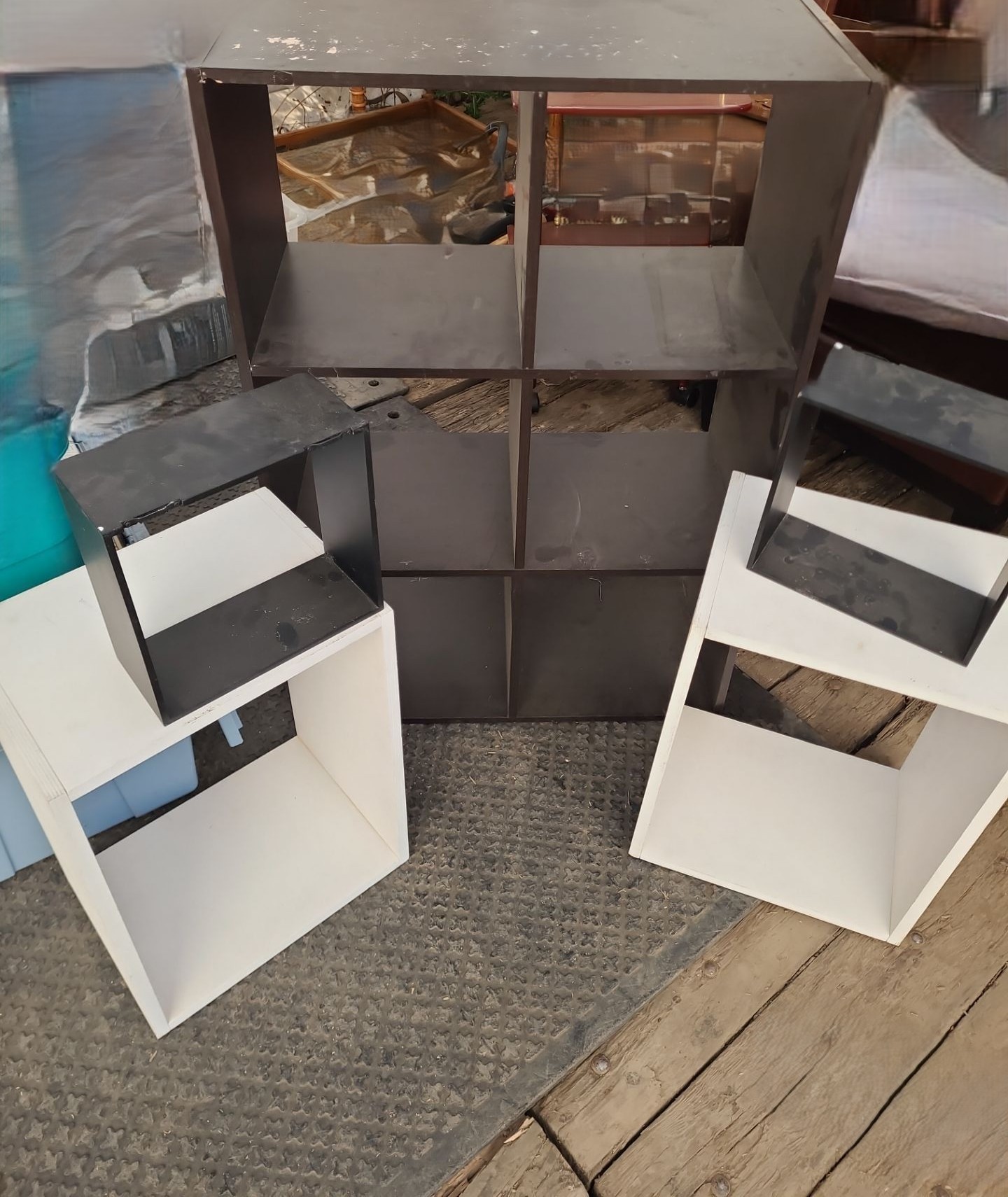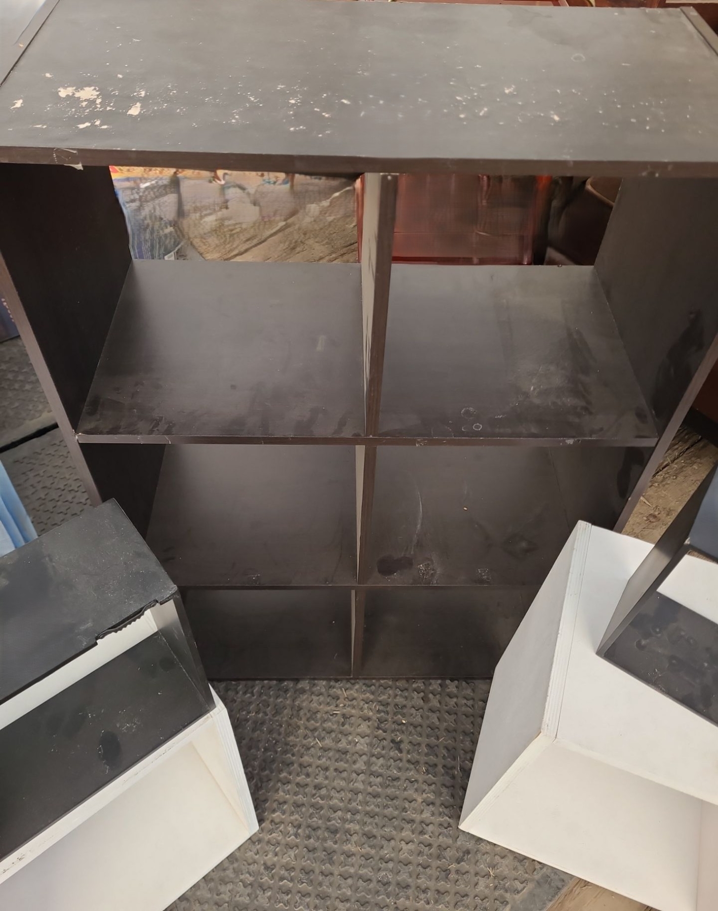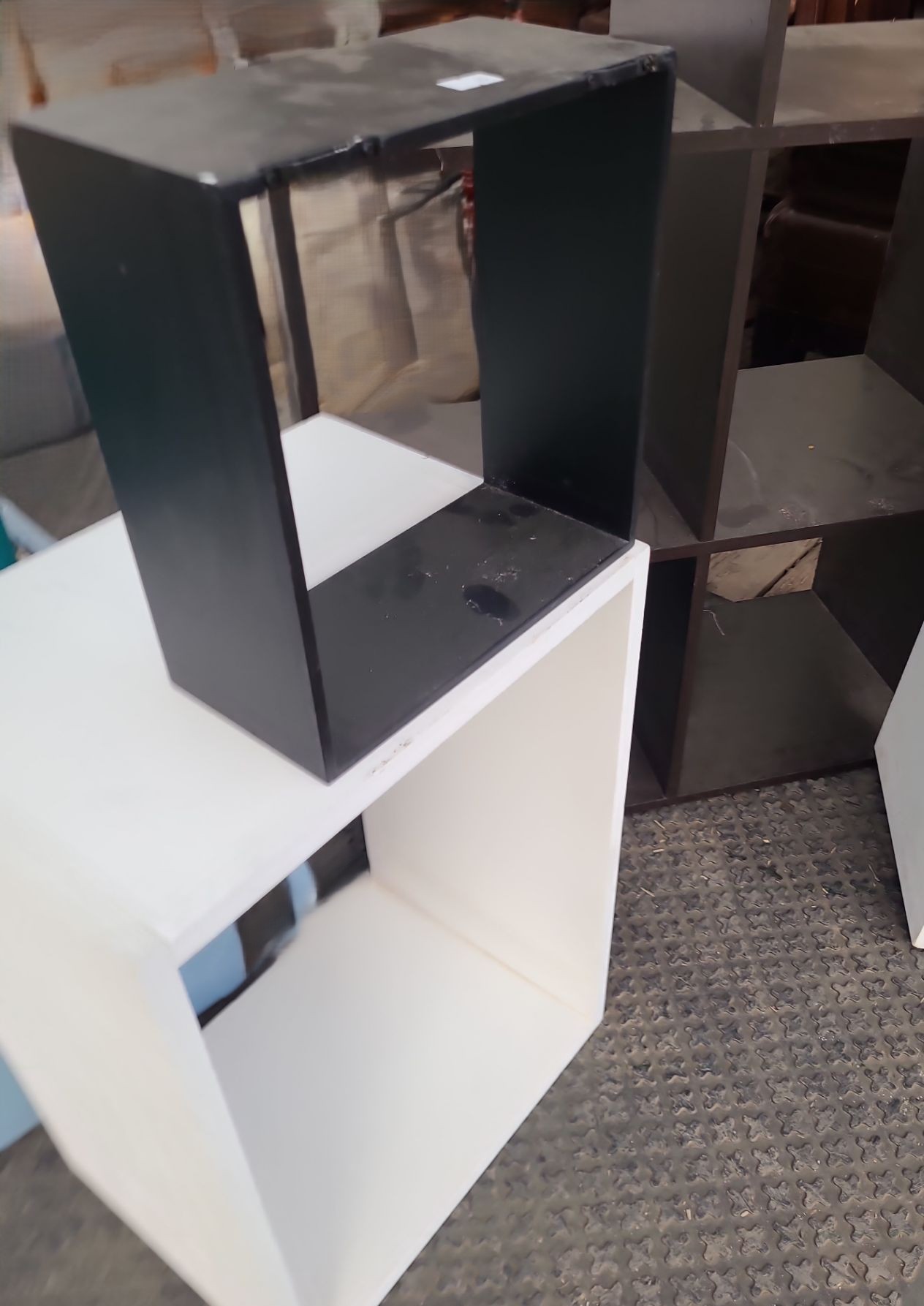 Cubby Shelves: Largest: 24 W, 11.5 D, 36 T, White Square: 18.5 W, 10 D, 13.5 T, Black 9 W, 4 D, 9 T