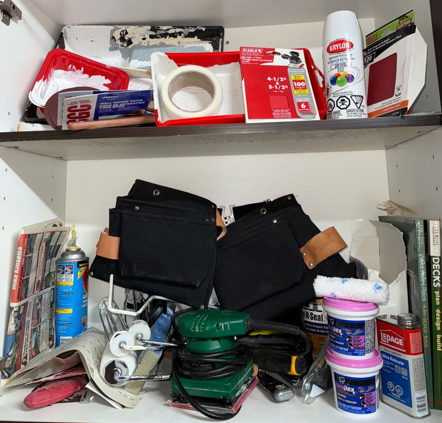 Cupboard Full Of Painting Supplies- Sandpaper, Tool Belt, Trays, Rollers, Brushes, Putty +++